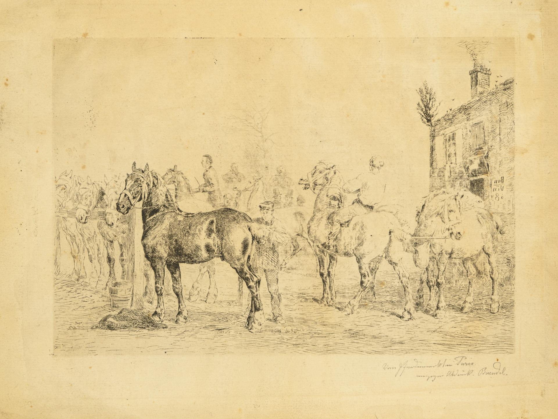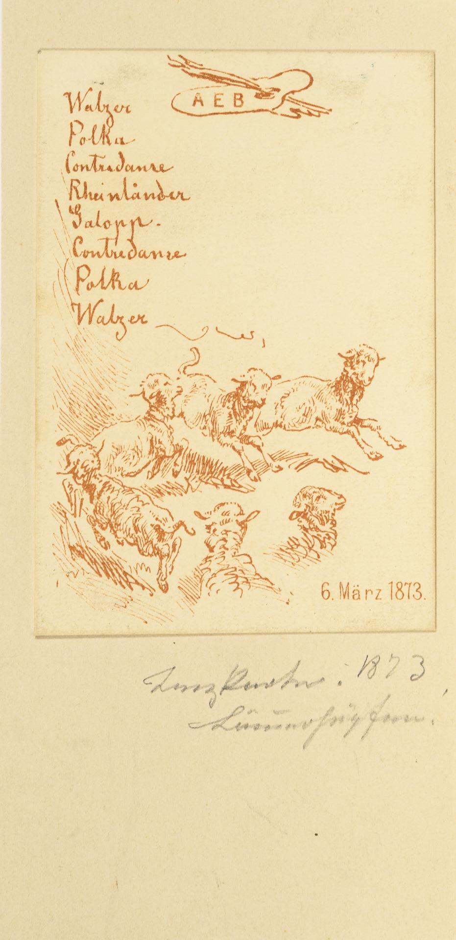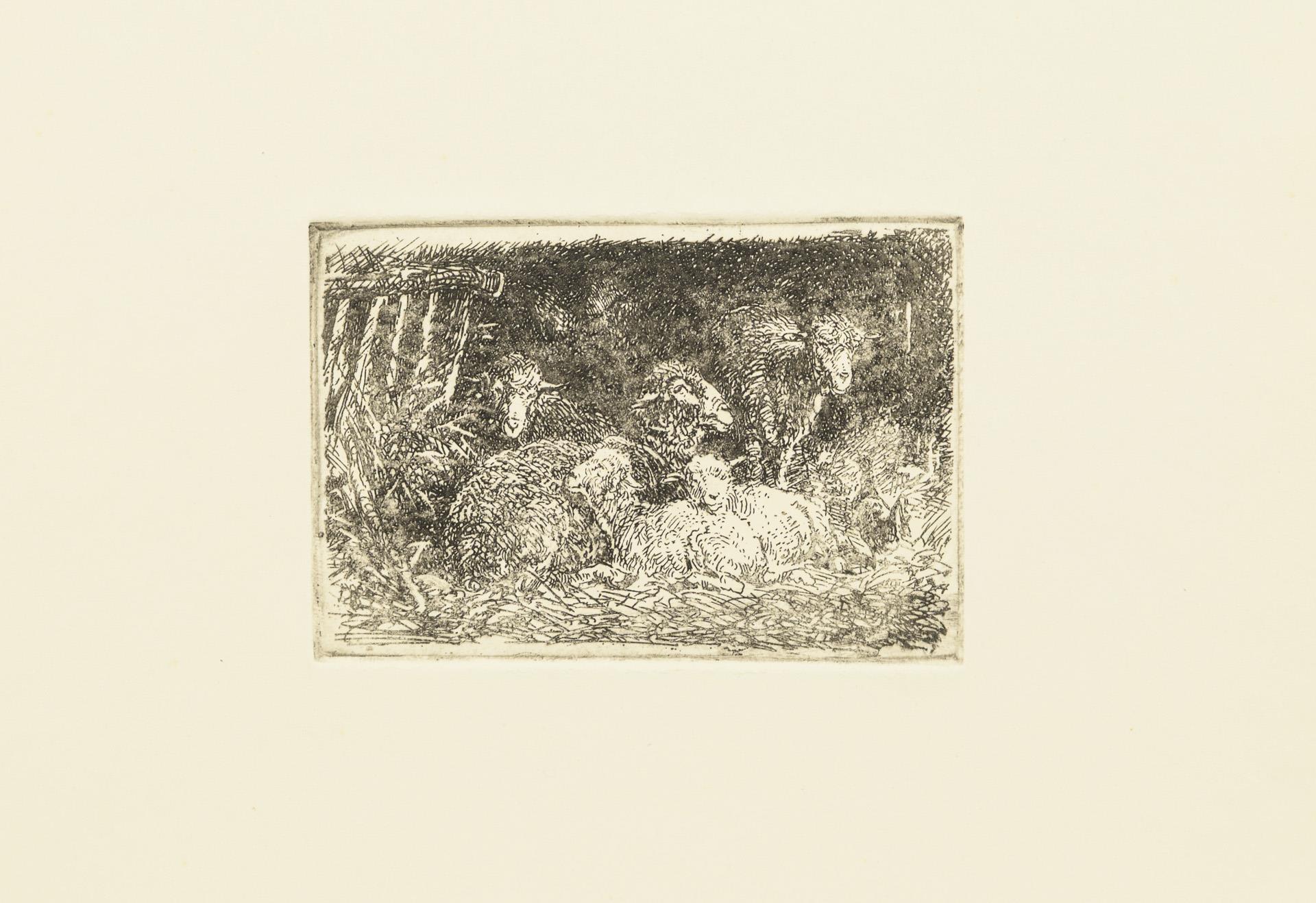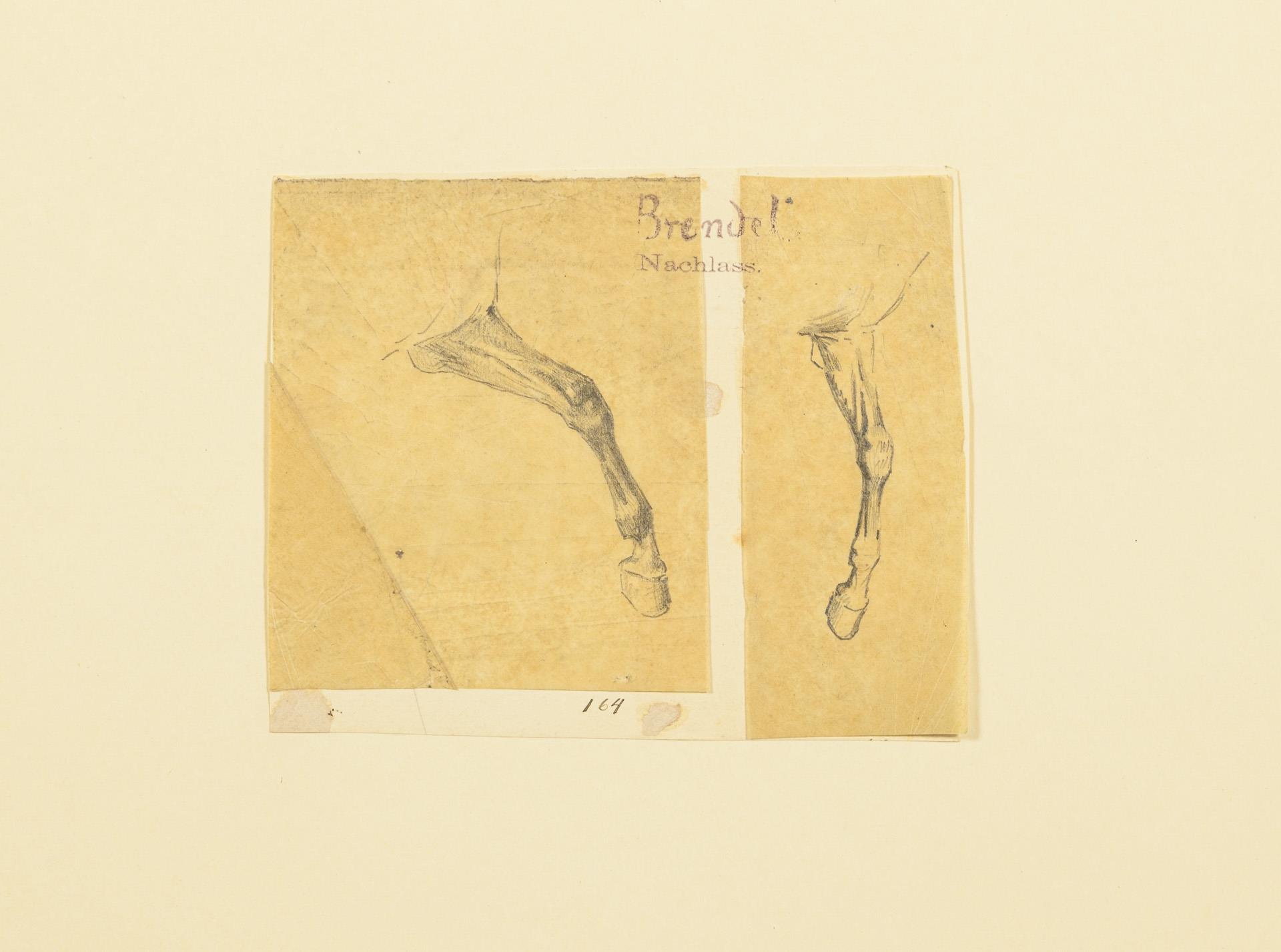 16 Blätter, die aus einem Nachlass stammen. Einige Blätter sind signiert oder gestempelt bzw, zugeschrieben. Einige qualitätvolle Handzeichnungen von Tieren können nicht eindeutig zugeordnet werden. "Vom Pferdemarkt in Paris ...", Bleistiftsignatur, Radierung auf Bütten, etwas fleckig, Bild 19 x 27,5 cm. / 2 Druckzustände, Schafherde, im Druck signiert und datiert 1888, Bild ca. 20,5 x 18,5 cm. / Blatt mit 2 Studien eines Pferdebeines, Bleistift auf Transparentpapier, Nachlass-Stempel. / Bleistiftskizze mit drei Schafsköpfen, einer im Anzug, signiert, Rückseitig auf Trägerpapier Nachlass-Stempel. Blatt , 11,5 x 14,5 cm / Gedruckte Tanzkarte mit Schafen darauf, datiert 6. März 1873. Zugeschrieben, darunter in Bleistift: "Tanzkarte 1873 Lämmerhüpfen" Karte 10,3 x 7 cm, auf Trägerpapier. / 3x Radierung Schafe mit Lämmern an der Raufe, zugeschrieben. 8 x 11,5 cm; 25 x 33 cm. / Mädchen mit Hut, farbig gemalt auf ein gemustertes Vlies (Serviette?), signiert "? Brendel, Juni 18?6", mehrfach gefaltet und geknickt, 36 x 26 cm / Unsigniert und nicht zugeschrieben: zwei Farbskizzen eines Auerochsen; Rötelskizze eines liegenden Stiers; Grasendes Pferd in Bleistift und Farbe; Rückansicht eines liegend Stieres, Bleistift auf Transparentpapier; Stallszene mit Pferden in der Box und davor Schafe, Kohle und Buntstift, wohl links mit "AB" monogrammiert, Kanten ausgefranst und eingerissen, 40 x 32 cm.