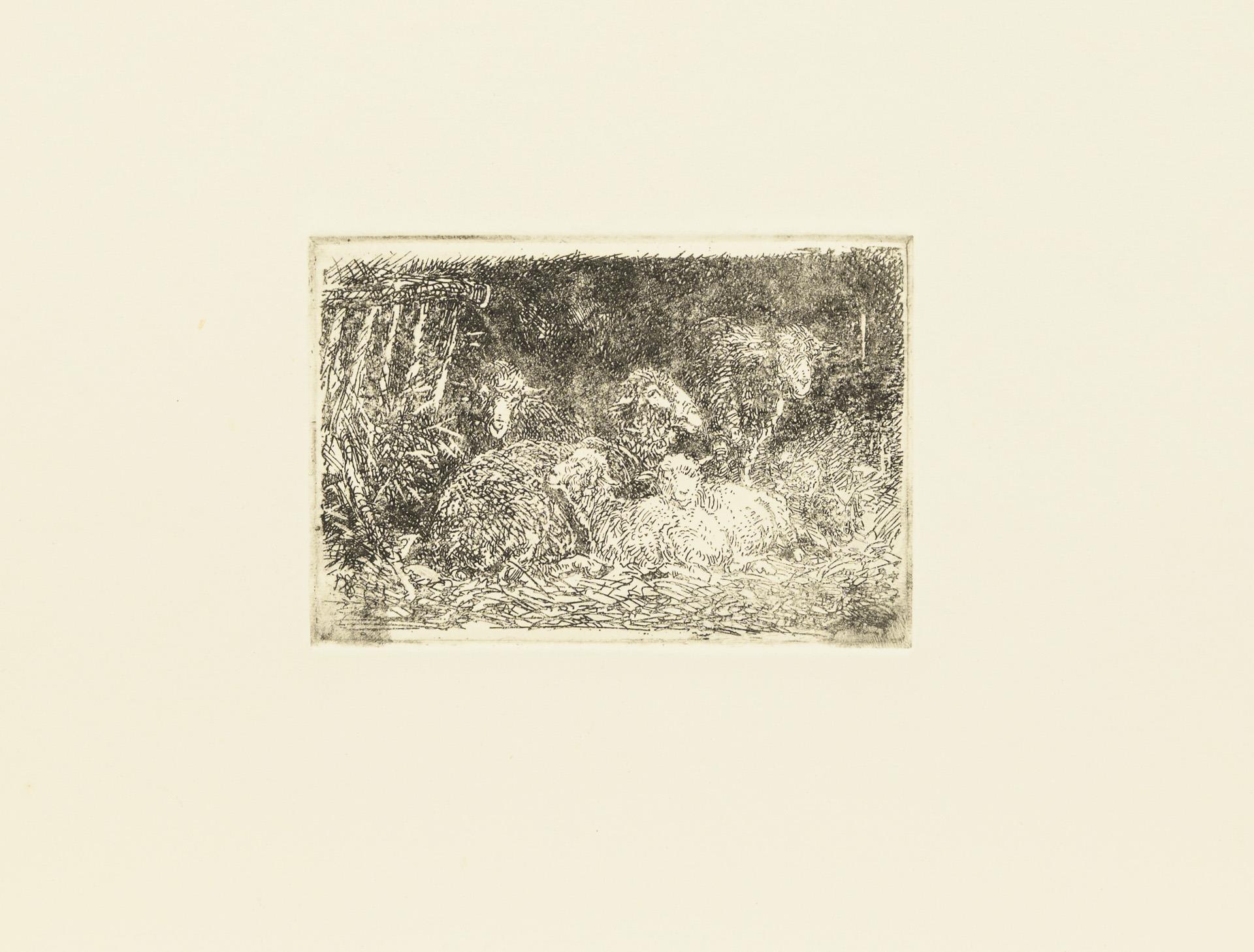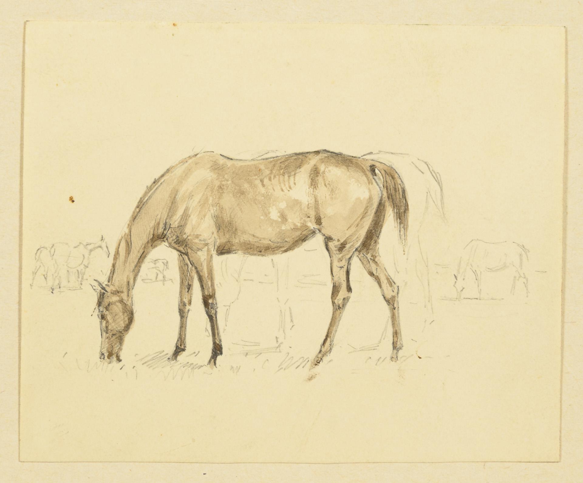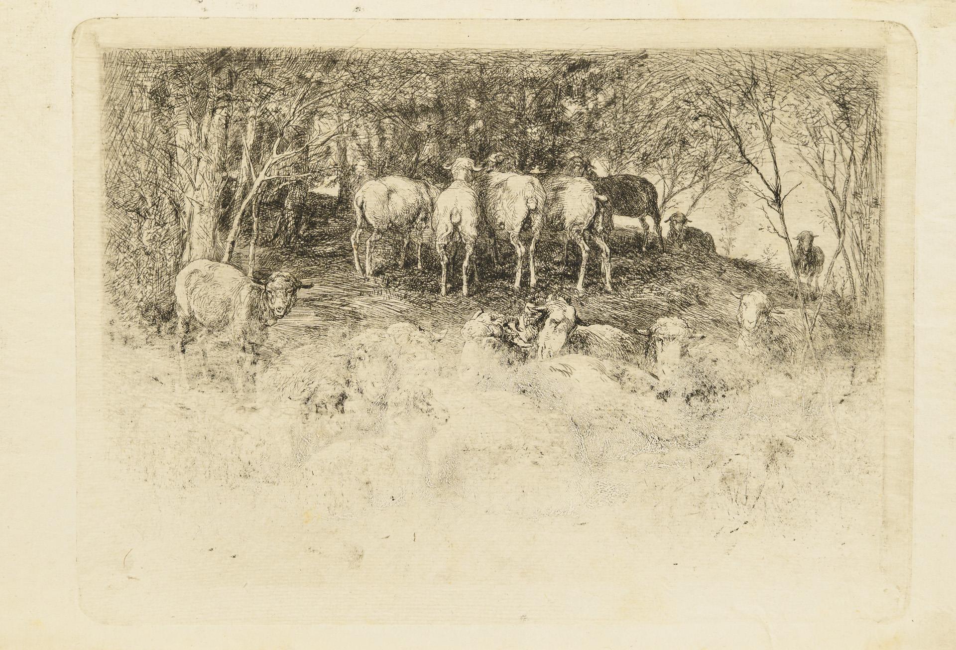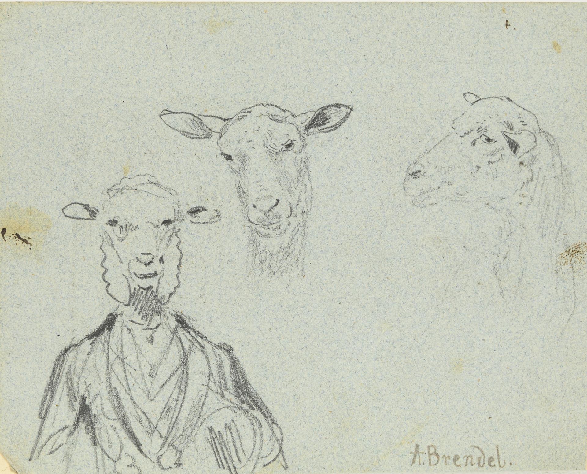 16 Blätter, die aus einem Nachlass stammen. Einige Blätter sind signiert oder gestempelt bzw, zugeschrieben. Einige qualitätvolle Handzeichnungen von Tieren können nicht eindeutig zugeordnet werden. "Vom Pferdemarkt in Paris ...", Bleistiftsignatur, Radierung auf Bütten, etwas fleckig, Bild 19 x 27,5 cm. / 2 Druckzustände, Schafherde, im Druck signiert und datiert 1888, Bild ca. 20,5 x 18,5 cm. / Blatt mit 2 Studien eines Pferdebeines, Bleistift auf Transparentpapier, Nachlass-Stempel. / Bleistiftskizze mit drei Schafsköpfen, einer im Anzug, signiert, Rückseitig auf Trägerpapier Nachlass-Stempel. Blatt , 11,5 x 14,5 cm / Gedruckte Tanzkarte mit Schafen darauf, datiert 6. März 1873. Zugeschrieben, darunter in Bleistift: "Tanzkarte 1873 Lämmerhüpfen" Karte 10,3 x 7 cm, auf Trägerpapier. / 3x Radierung Schafe mit Lämmern an der Raufe, zugeschrieben. 8 x 11,5 cm; 25 x 33 cm. / Mädchen mit Hut, farbig gemalt auf ein gemustertes Vlies (Serviette?), signiert "? Brendel, Juni 18?6", mehrfach gefaltet und geknickt, 36 x 26 cm / Unsigniert und nicht zugeschrieben: zwei Farbskizzen eines Auerochsen; Rötelskizze eines liegenden Stiers; Grasendes Pferd in Bleistift und Farbe; Rückansicht eines liegend Stieres, Bleistift auf Transparentpapier; Stallszene mit Pferden in der Box und davor Schafe, Kohle und Buntstift, wohl links mit "AB" monogrammiert, Kanten ausgefranst und eingerissen, 40 x 32 cm.