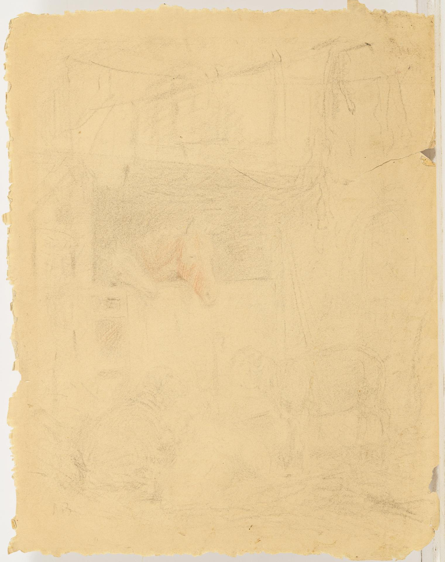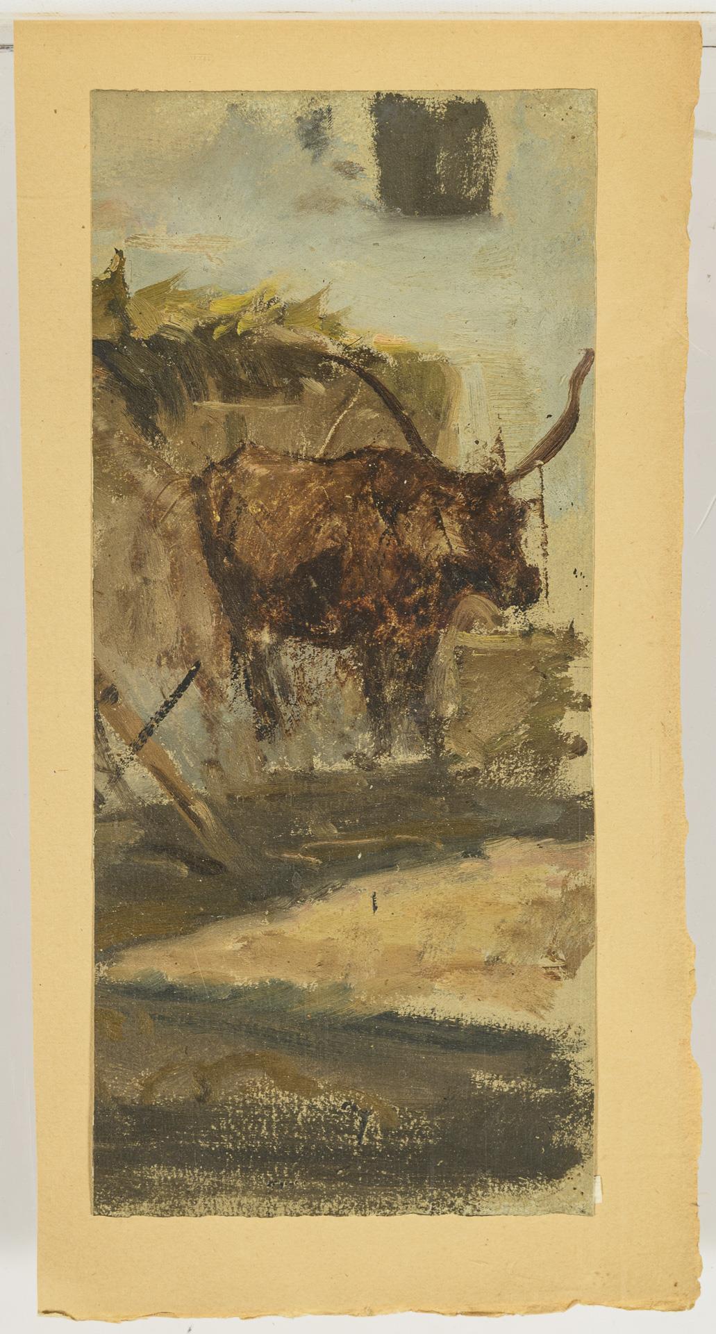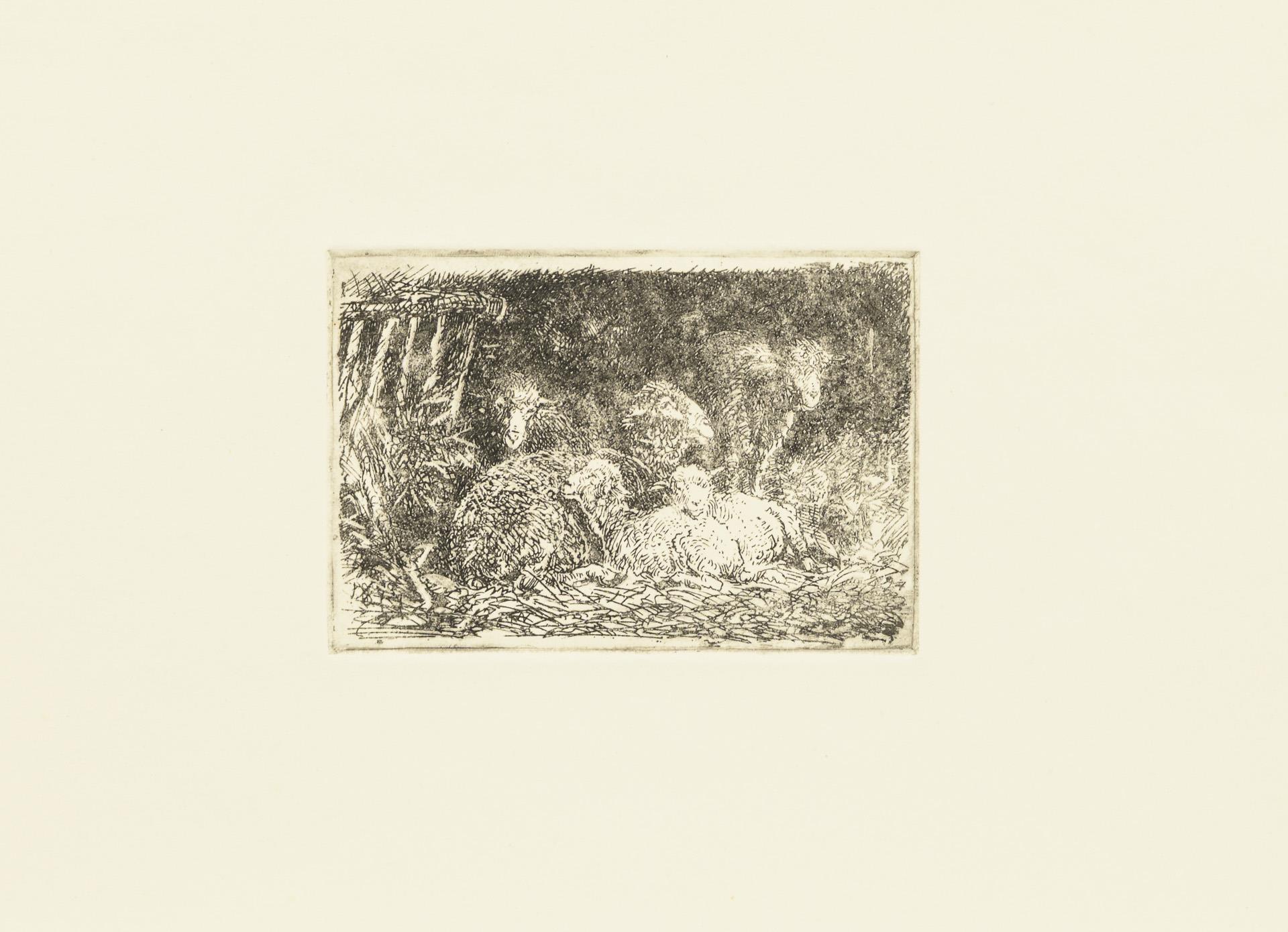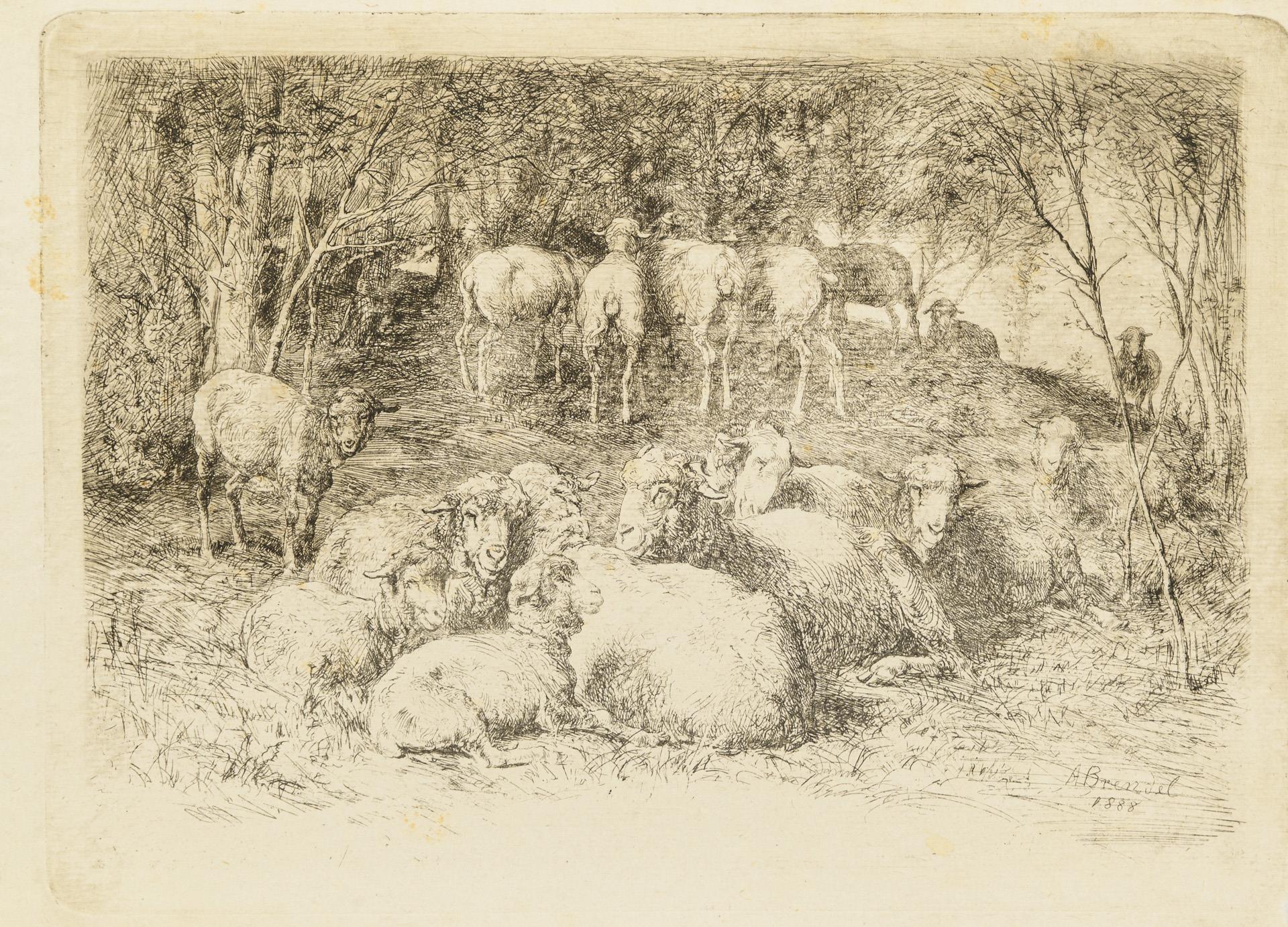 16 Blätter, die aus einem Nachlass stammen. Einige Blätter sind signiert oder gestempelt bzw, zugeschrieben. Einige qualitätvolle Handzeichnungen von Tieren können nicht eindeutig zugeordnet werden. "Vom Pferdemarkt in Paris ...", Bleistiftsignatur, Radierung auf Bütten, etwas fleckig, Bild 19 x 27,5 cm. / 2 Druckzustände, Schafherde, im Druck signiert und datiert 1888, Bild ca. 20,5 x 18,5 cm. / Blatt mit 2 Studien eines Pferdebeines, Bleistift auf Transparentpapier, Nachlass-Stempel. / Bleistiftskizze mit drei Schafsköpfen, einer im Anzug, signiert, Rückseitig auf Trägerpapier Nachlass-Stempel. Blatt , 11,5 x 14,5 cm / Gedruckte Tanzkarte mit Schafen darauf, datiert 6. März 1873. Zugeschrieben, darunter in Bleistift: "Tanzkarte 1873 Lämmerhüpfen" Karte 10,3 x 7 cm, auf Trägerpapier. / 3x Radierung Schafe mit Lämmern an der Raufe, zugeschrieben. 8 x 11,5 cm; 25 x 33 cm. / Mädchen mit Hut, farbig gemalt auf ein gemustertes Vlies (Serviette?), signiert "? Brendel, Juni 18?6", mehrfach gefaltet und geknickt, 36 x 26 cm / Unsigniert und nicht zugeschrieben: zwei Farbskizzen eines Auerochsen; Rötelskizze eines liegenden Stiers; Grasendes Pferd in Bleistift und Farbe; Rückansicht eines liegend Stieres, Bleistift auf Transparentpapier; Stallszene mit Pferden in der Box und davor Schafe, Kohle und Buntstift, wohl links mit "AB" monogrammiert, Kanten ausgefranst und eingerissen, 40 x 32 cm.