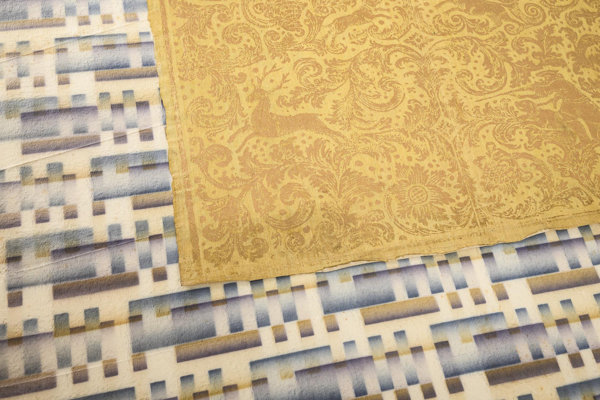 Barocker Golddruck des 18. Jh. auf feinem Lumpenpapier mit Bugfalte: Die Fläche ausfüllendes Rankenornament mit Jagdszenen (Jäger bei der Hirschjagd und Sauhatz). Rückseitig mit Bleistift französisch beschriftet: "pour la chaire pour ... vert et rouge C(omte?) de Le Massois". Wasserschaden und Knickspuren am Rand, leichtere Alters- und Gebrauchsspuren. Blatt 35 x 42 cm. / Dazu ein dreifarbiges Tapetenstück des 20. Jh. mit geometrisch verzahntem Muster in Verläufen. Einige Alters- und Gebrauchsspuren. Maximal 44 x 50 cm.