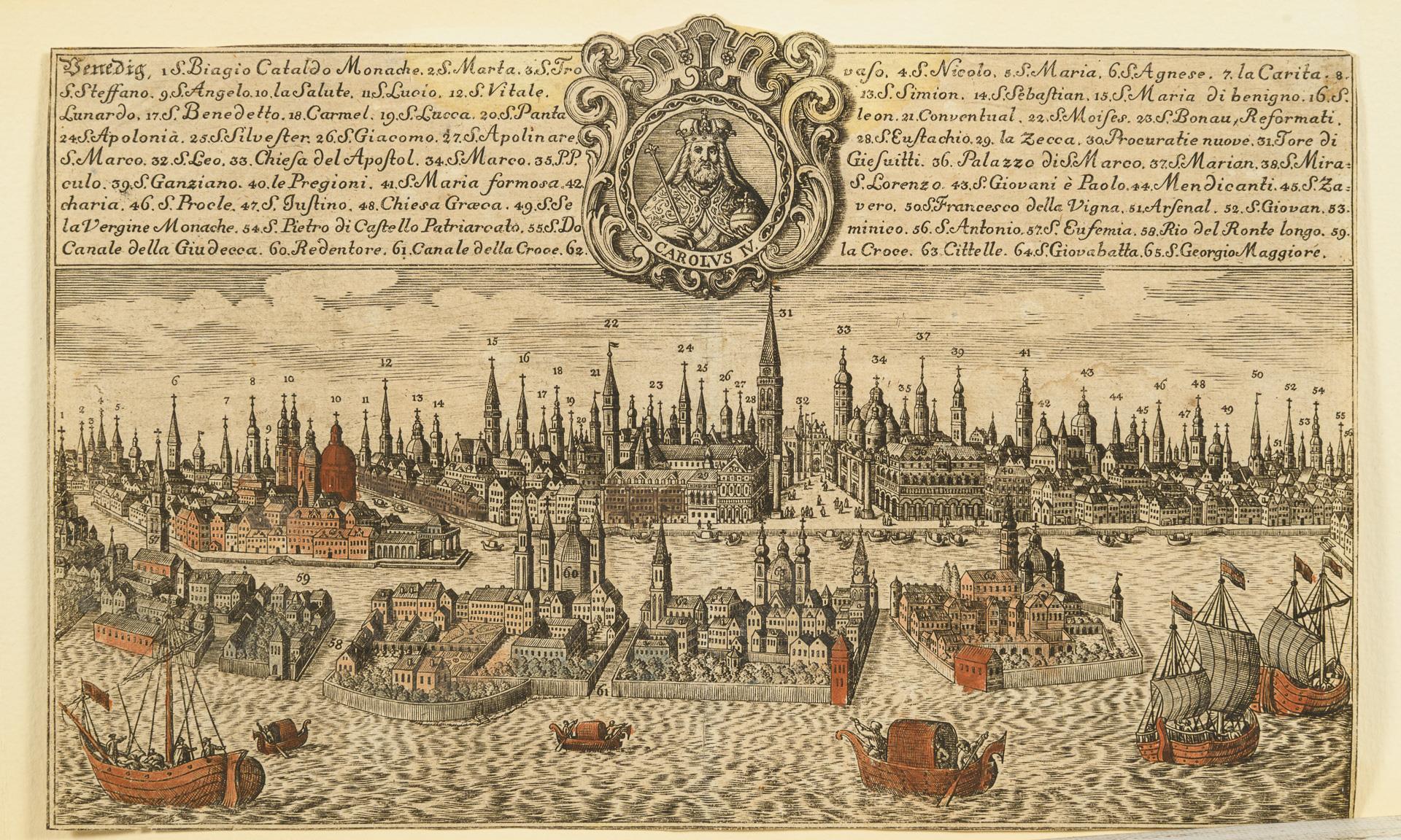 Sehr feine und detailreiche Darstellung der Städte mit durchnummerierten Türmen und Gebäuden, diese im oberen Teil bezeichnet. Für Rom 82 Aufzählungen, für Venedig 65. Blätter eng beschnitten, auf Trägerpapier mit Papierstreifen geheftet.