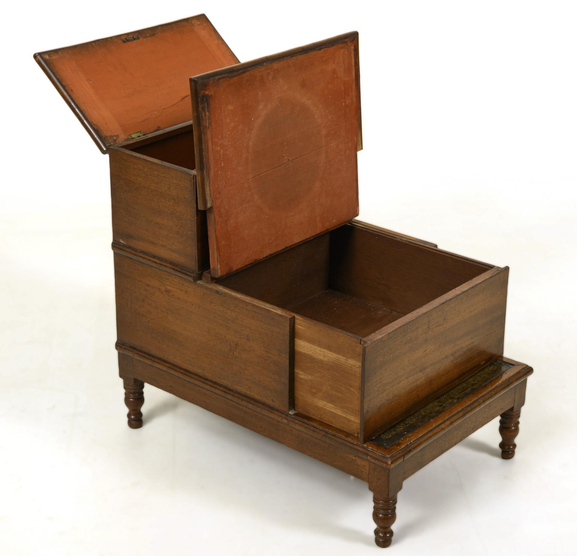 3-stufiger Korpus auf 4 Drechselbeinen. Oberste Stufe mit abschließbarem Fach und Klappdeckel, mittlere Stufe als ausziehbares Geheimfach mit Klappdeckel. Stufenbelag mit dunkelgrünem, floral geprägtem Leder. Leichte Alters- und Gebrauchsspuren, partiell Defekte.