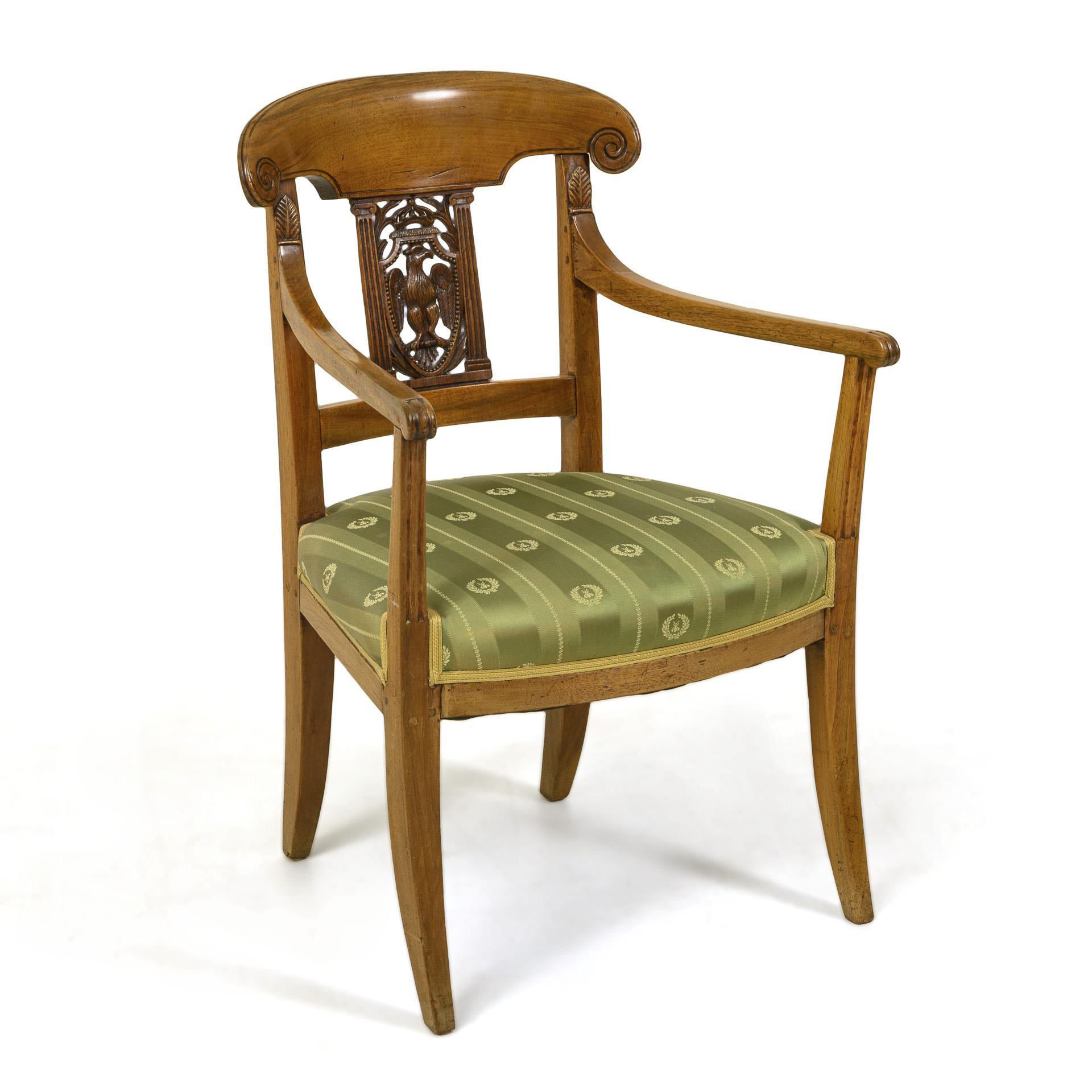 Schaufellehne mit seitlichen Endvoluten und Blattzier, durchbrochen beschnitztes Lehnbrett mit bekröntem Adler, gerade Armstützen mit Kehlungen. Breite, trapezförmige Polstersitzfläche mit grünem Jacquard-Streifenstoff, auf 4 gebogten Spitzbeinen. Restauriert, mit Ergänzungen, stark verblichen, partiell Risse und Bereibungen, inaktiver Anobienbefall.
