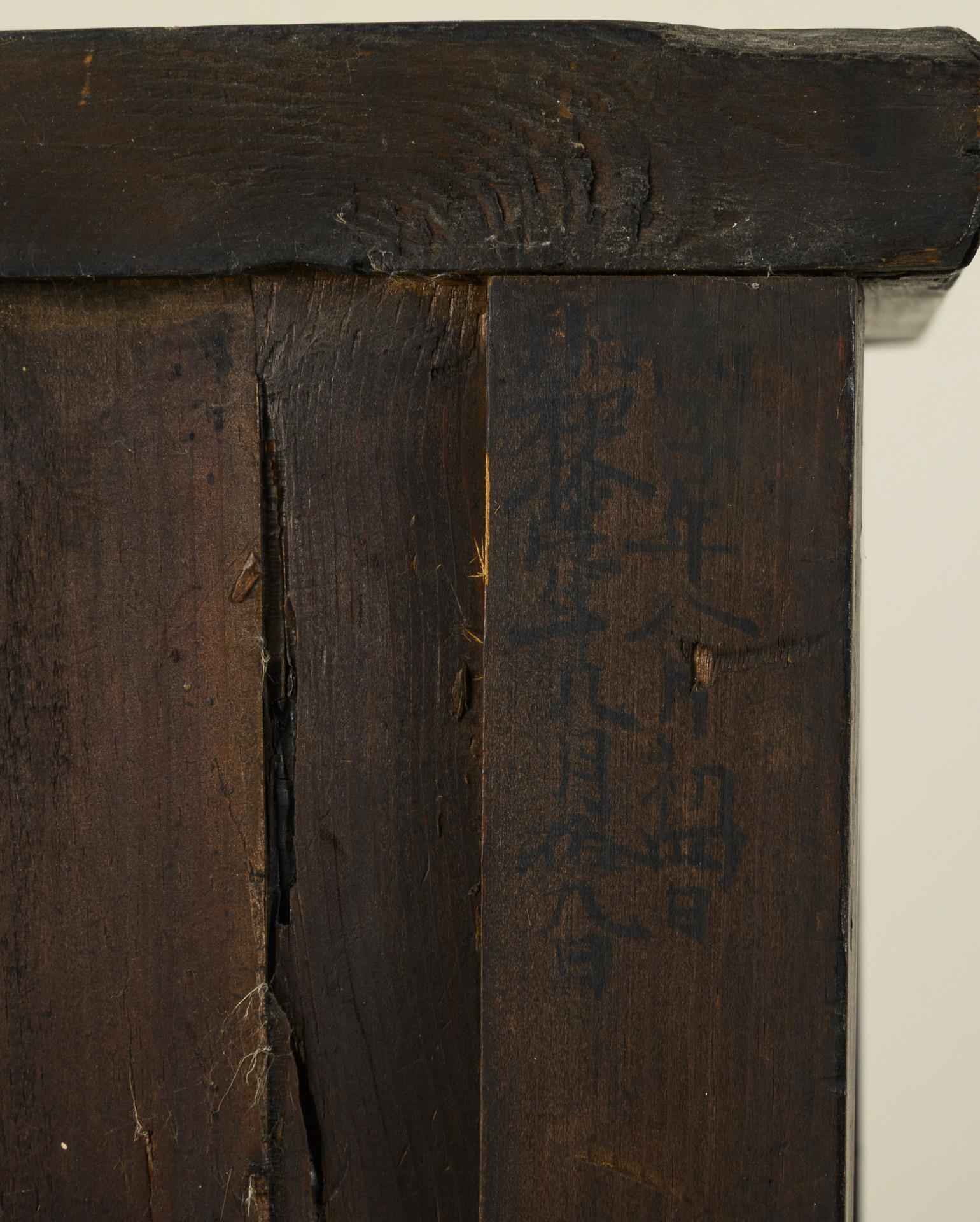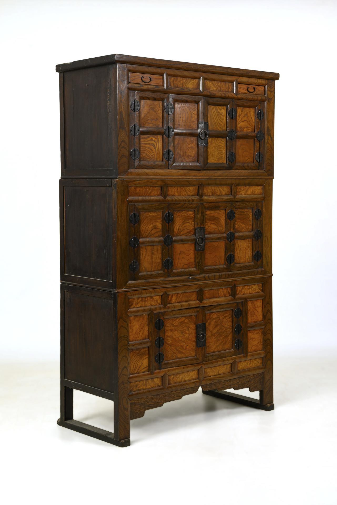 Drei rechteckige Korpi aufeinander gestellt. Oberes Teil mit 2 Schüben, 2 zweiteiligen Türflügeln und dahinter vier Schieberahmen mit bemalten Glasscheiben. dort auch Schriftzeichen als Glückssymbole (eine Scheibe mehrfach gesprungen). . Mittelteil ebenfalls mit 2 zweiteiligen Scharniertüren. Das Unterteil mit zwei einfachen Türen und Zarge mit gravierten Lotosblumendekor. Metallringe an den Türen dienen als Griffe und Schließen. Trockenrisse in der Rückwand und oben, teils mit Klebeband verdeckt. Gebrauchsspuren.