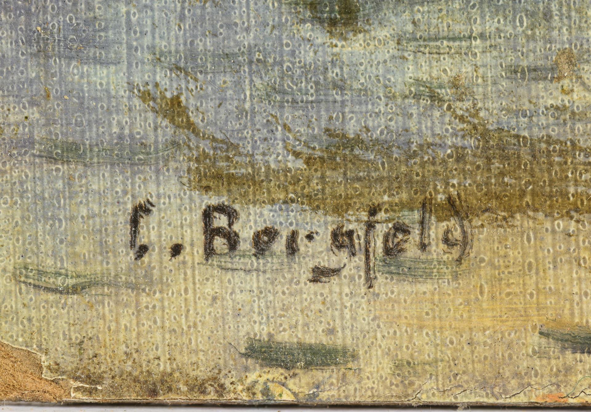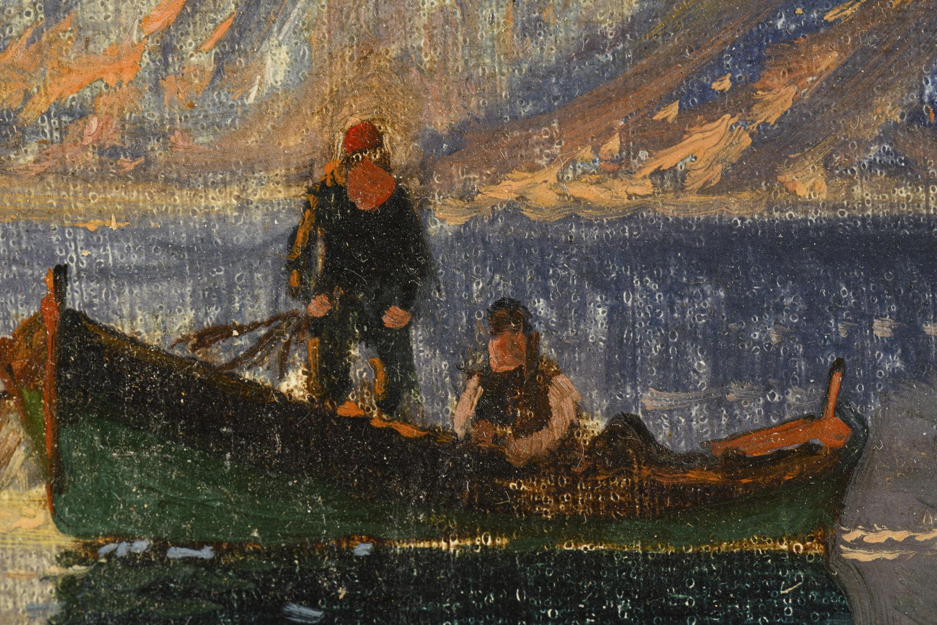 Fischer beim Einholen des Netzes nahe dem steinigen Ufer vor der untergehenden Sonne am Horizont.