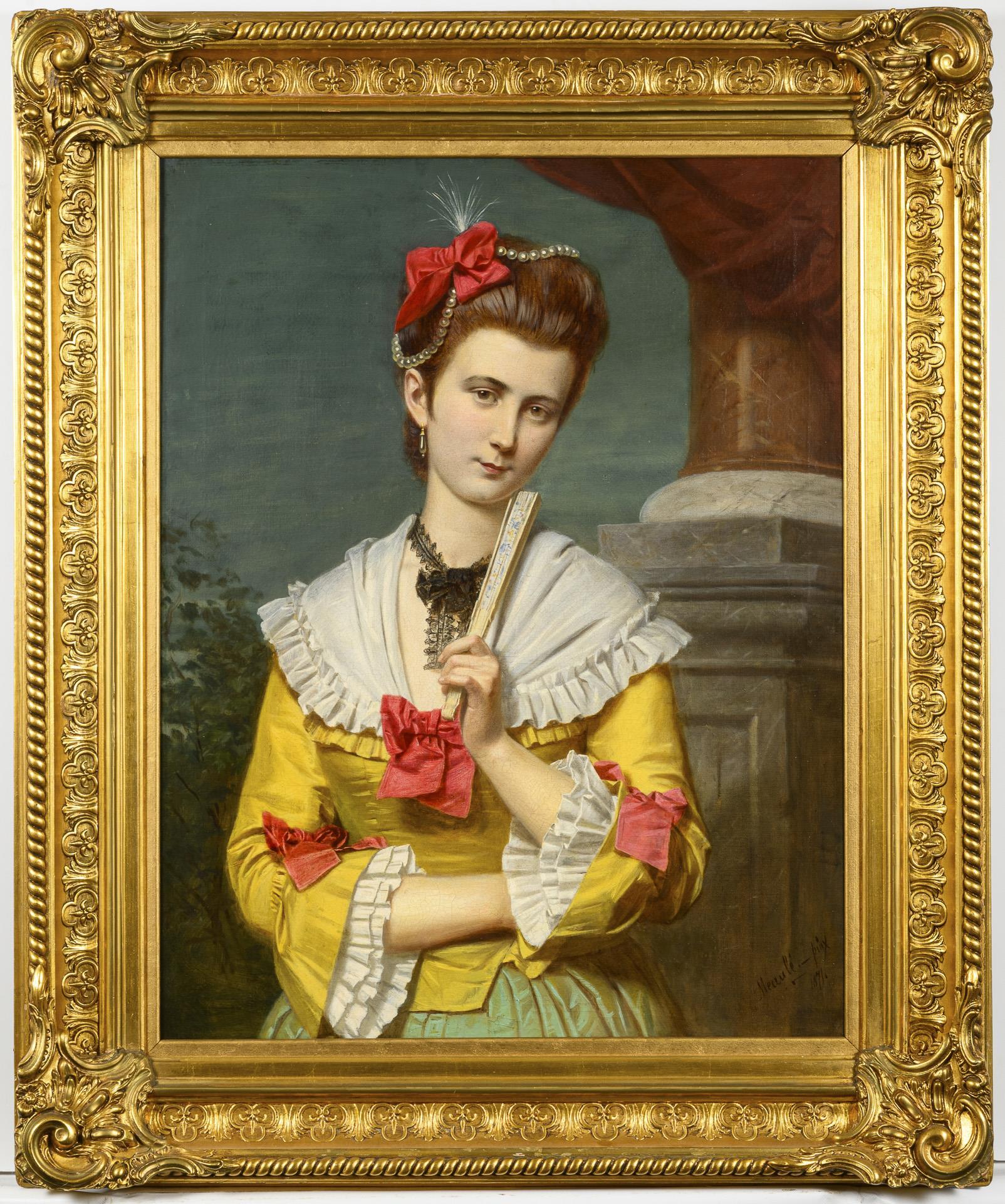 Porträt einer jungen Frau im gelben Kleid mit rosafarbenen Schleifen, einem Fächer in der Hand und Perlen im Haar vor einer Marmorsäule. Restauriert mit Hinterklebungen.