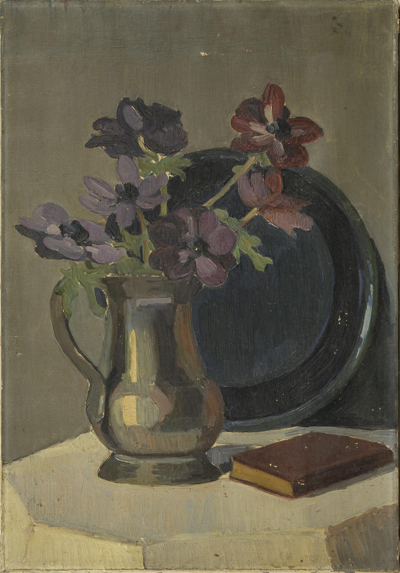 Der Blumenstrauß in der Kanne neben einem Buch und einem Teller auf weiß gedecktem Tisch. Leichte Altersspuren.
