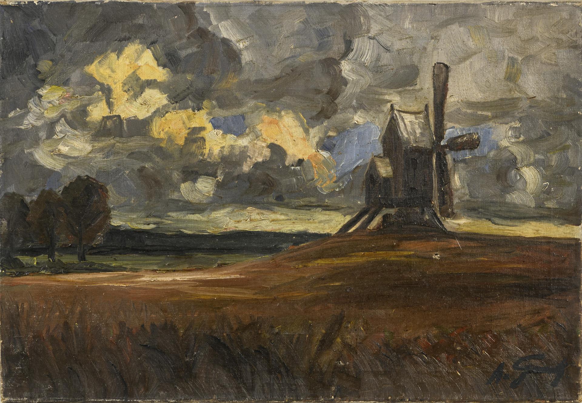 Die Bockwindmühle auf einem Hügel unter dunklem Wolkenhimmel, der vereinzelt blauen Himmel erkennen lässt. Zwei Leinwanddefekte.