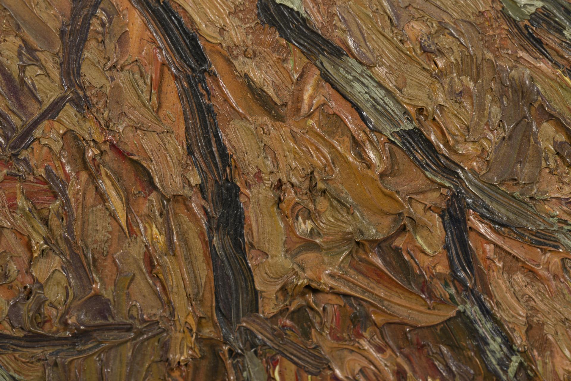 Dichtes Geäst auf dem Boden an einem Hang mit herbstlich verfärbten Bäumen.