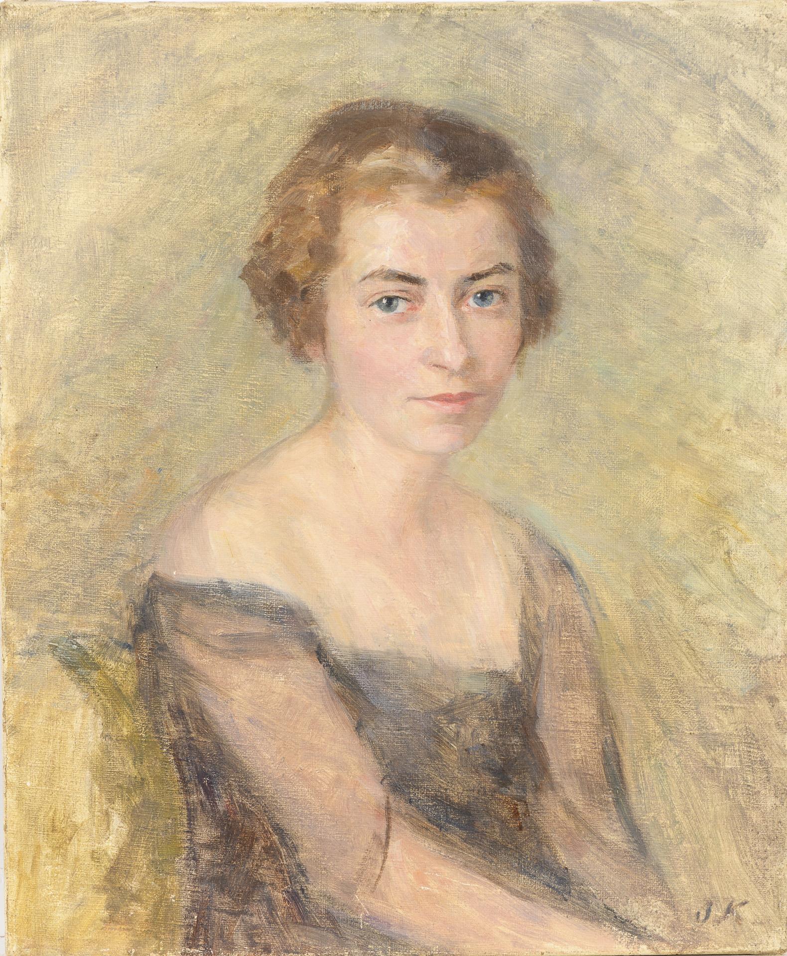 Porträt einer jungen Frau im dunklen Kleid vor neutralem Hintergrund.