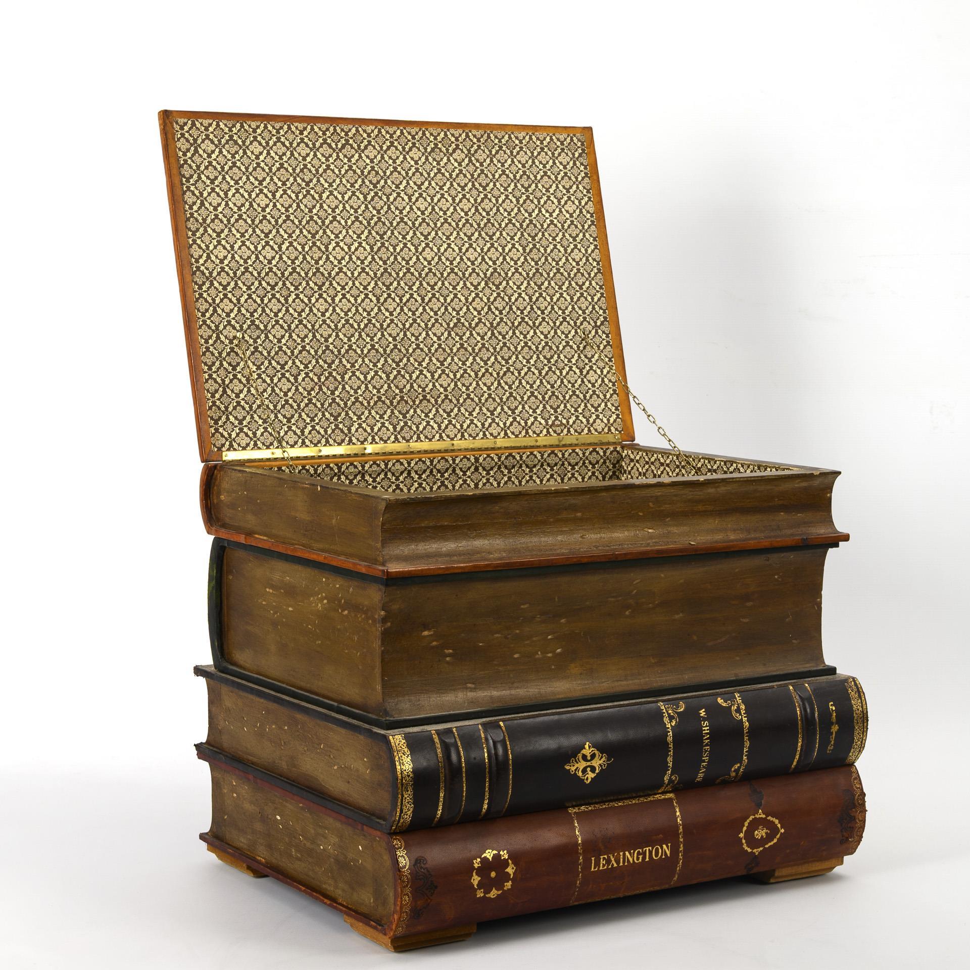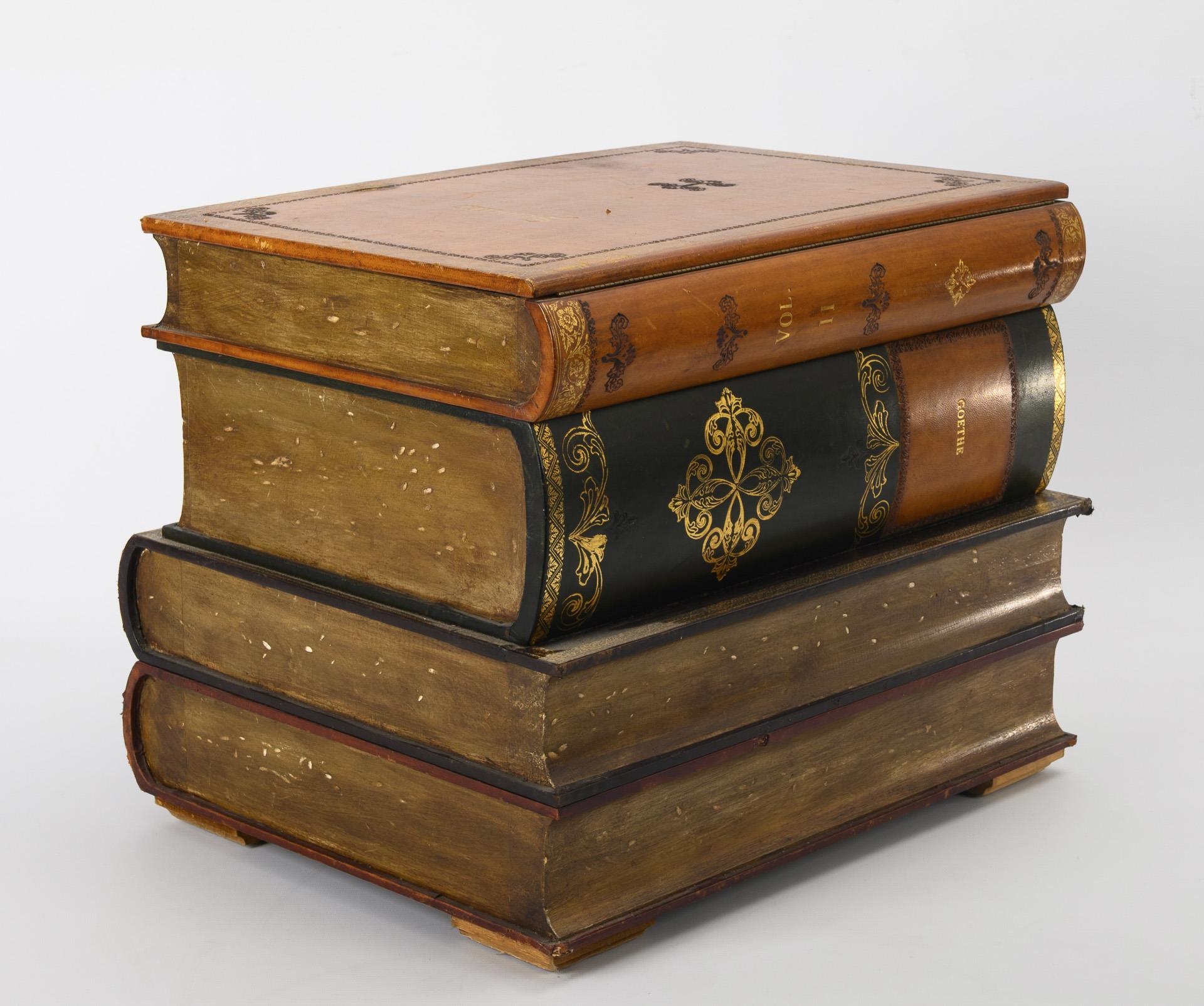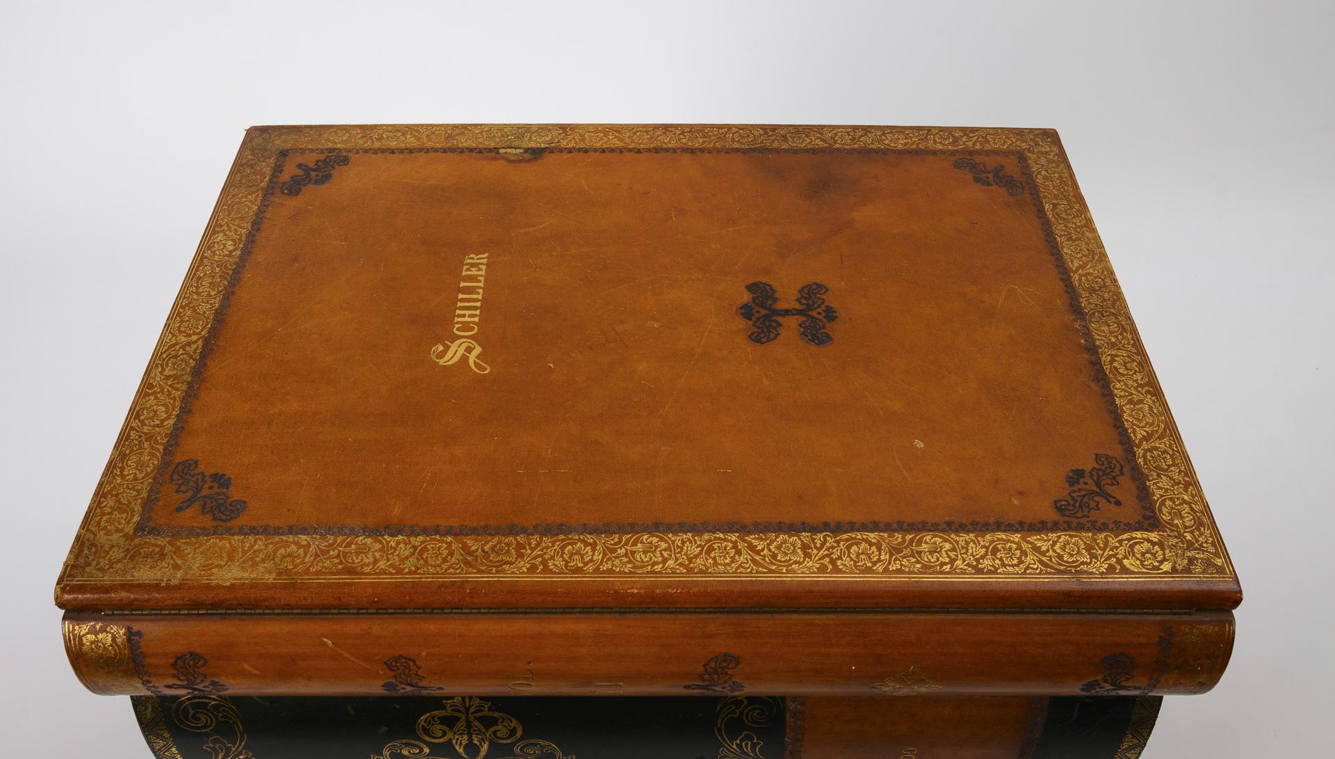 Große Schatulle in Form gestapelter Folianten mit Ledereinbänden und Goldschnitt. Auf dem Scharnierdeckel "Schiller" in Goldprägung, auf den darunter liegenden Buchrücken "Goethe", "Shakespeare" und "Lexikon". Innen braun/weiße Tapete. Einige wenige Alters-/Gebrauchsspuren.