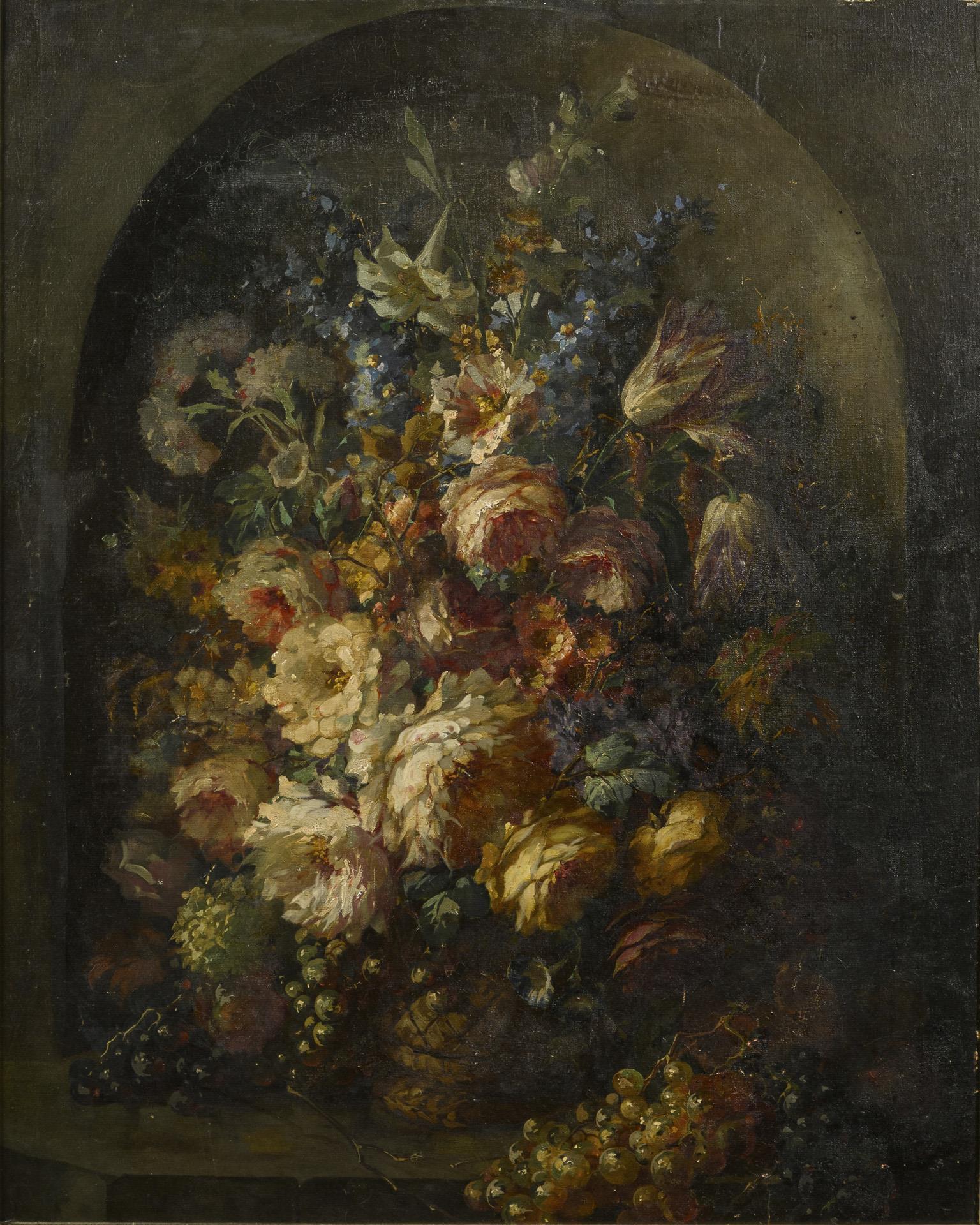 Im Stil der alten Meister gemalter großer Blumenstrauß mit verschiedenen Blumen in einer Wandnische. Reinigungsbedürftig.