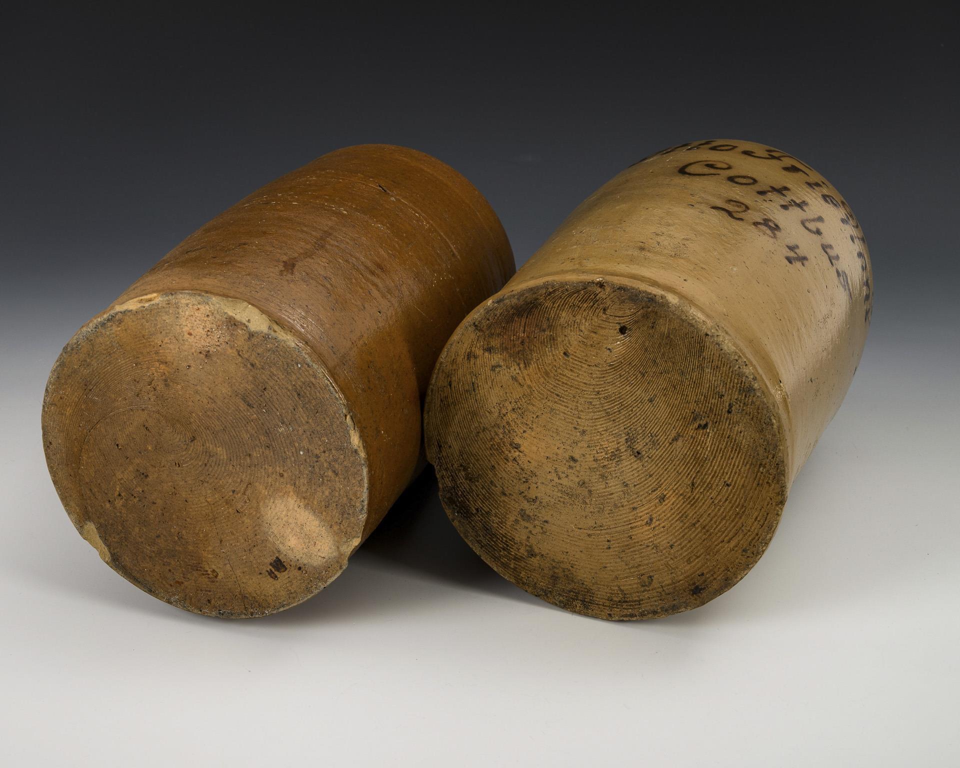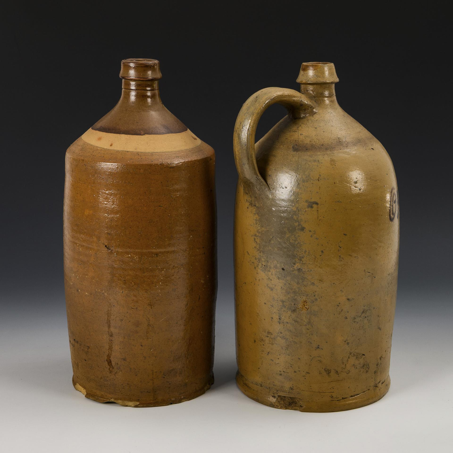 Jeweils ein zylindrischer Korpus mit abgesetztem Enghals, 1x mit Henkel, bezeichnet "Otto Friedland Cottbus 284", 1x mit Ringmuster im Schulterbereich, bezeichnet "5. O. Zolchow Velten". Jeweils mit Bestoßungen und Rissen.