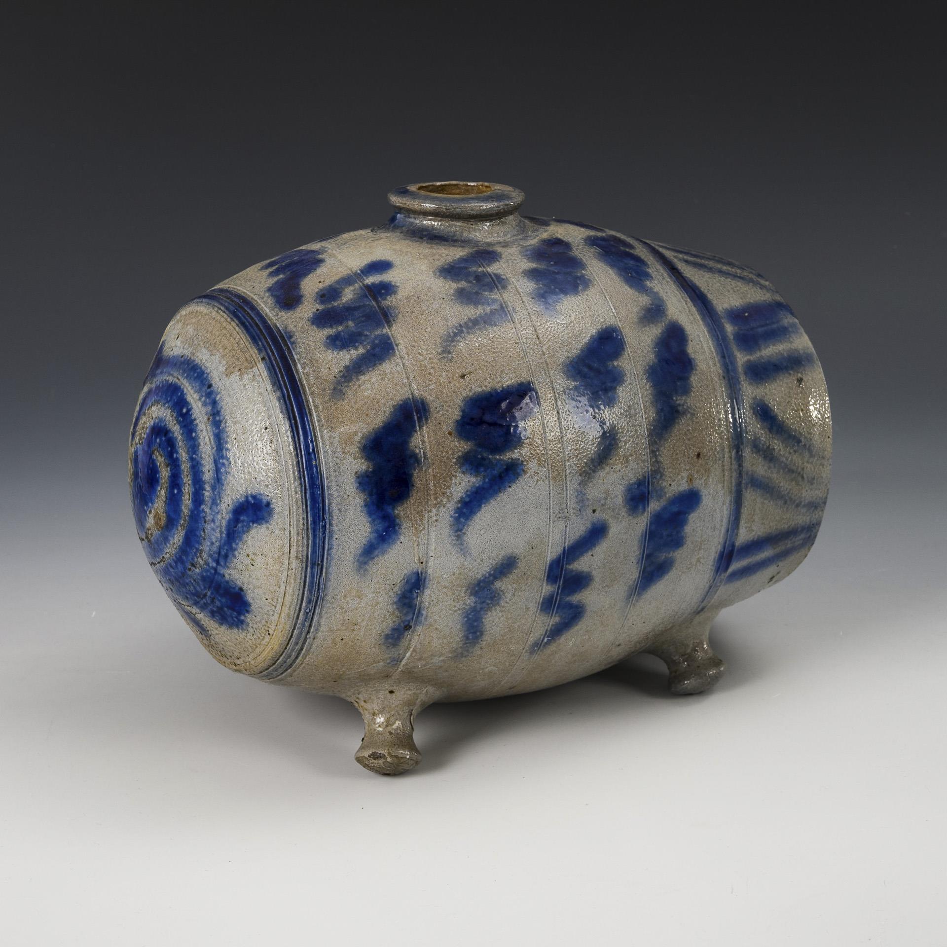 Trommelform mit 2 Öffnungen (oben und an der Seite, ohne Stopfen), auf 4 Knauffüßen. An den Öffnungen bestoßen.