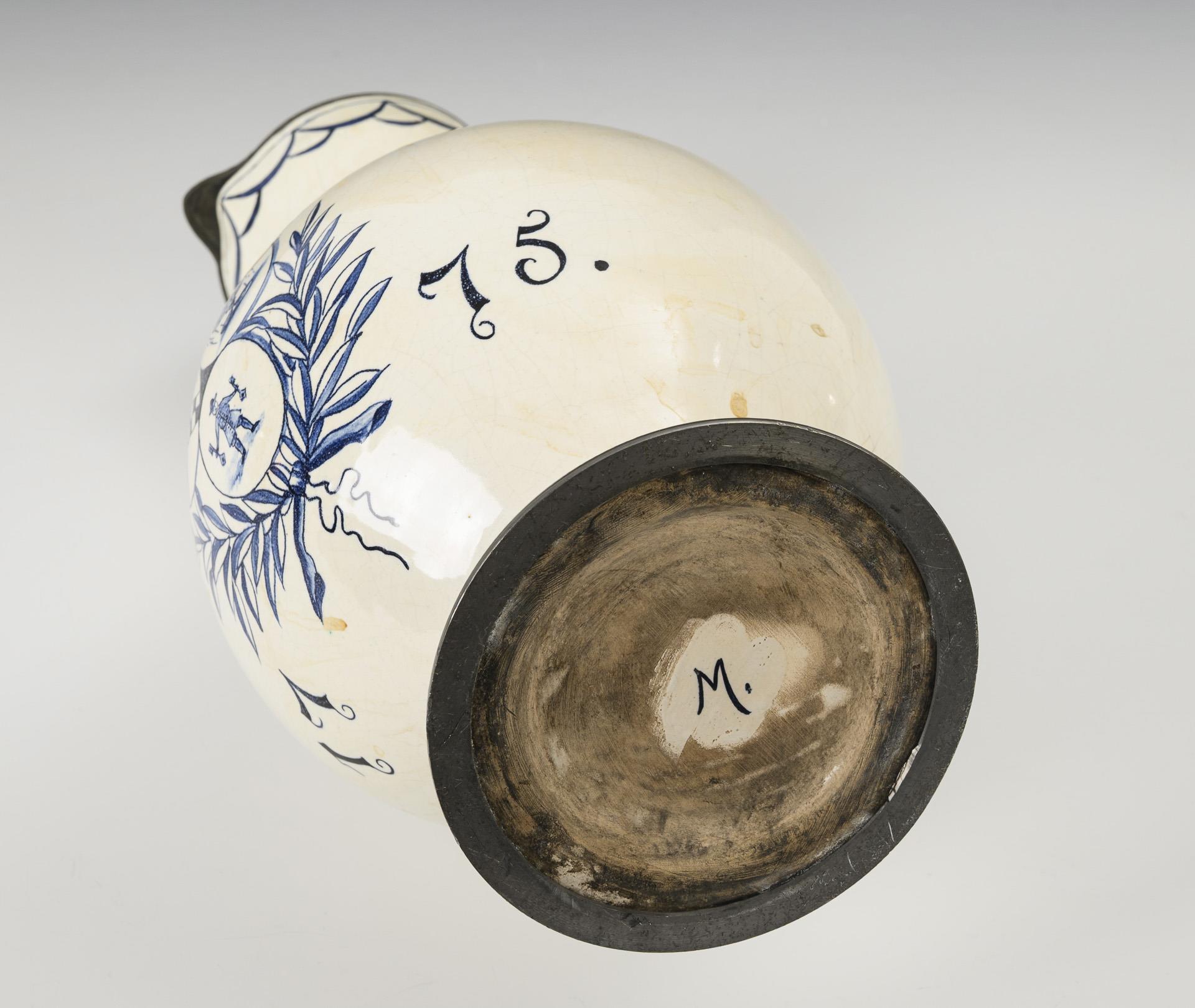 Historismus-Enghalskrug mit geflochtenem Henkel, schauseitig 3 Ovalreserven, bekrönt von einem Bischofskopf, monogrammiert F.F.E.A. und mit Jahreszahl 1775. Zinndeckel mit Muscheldrücker, gravierter Hirsch und Monogramm "KFA", innen gepunzt, Zinnstandring. Stark glasurrissig.