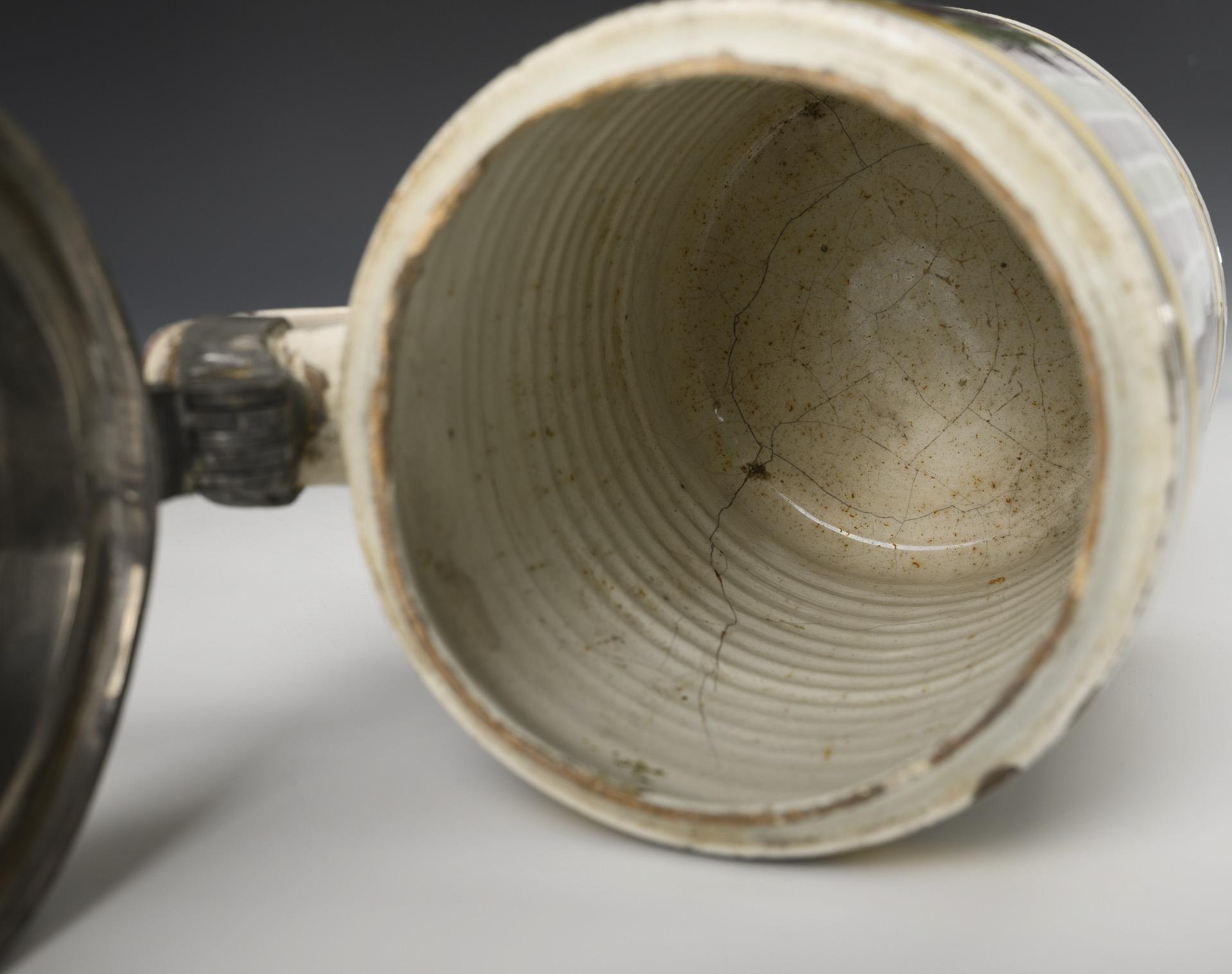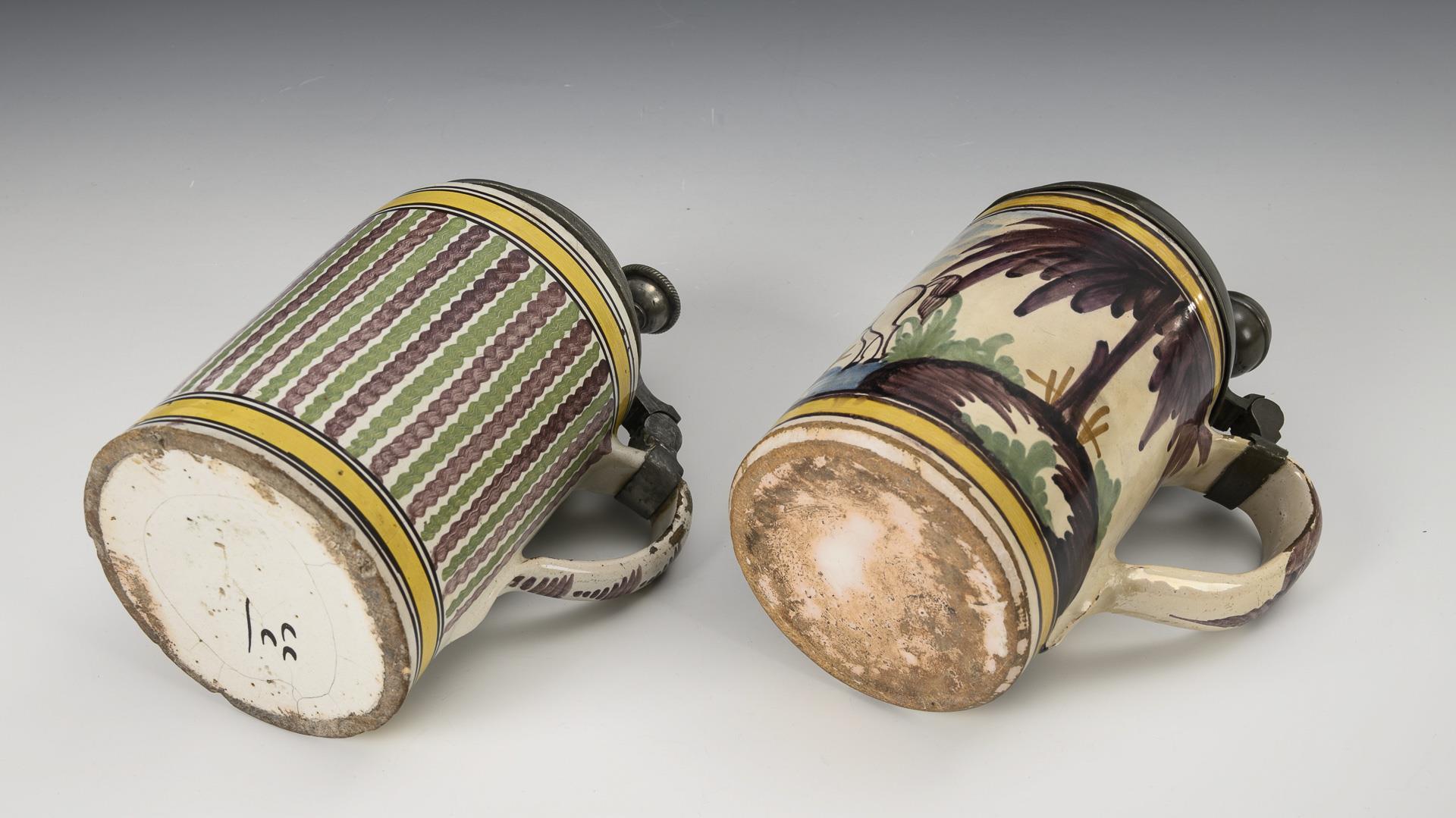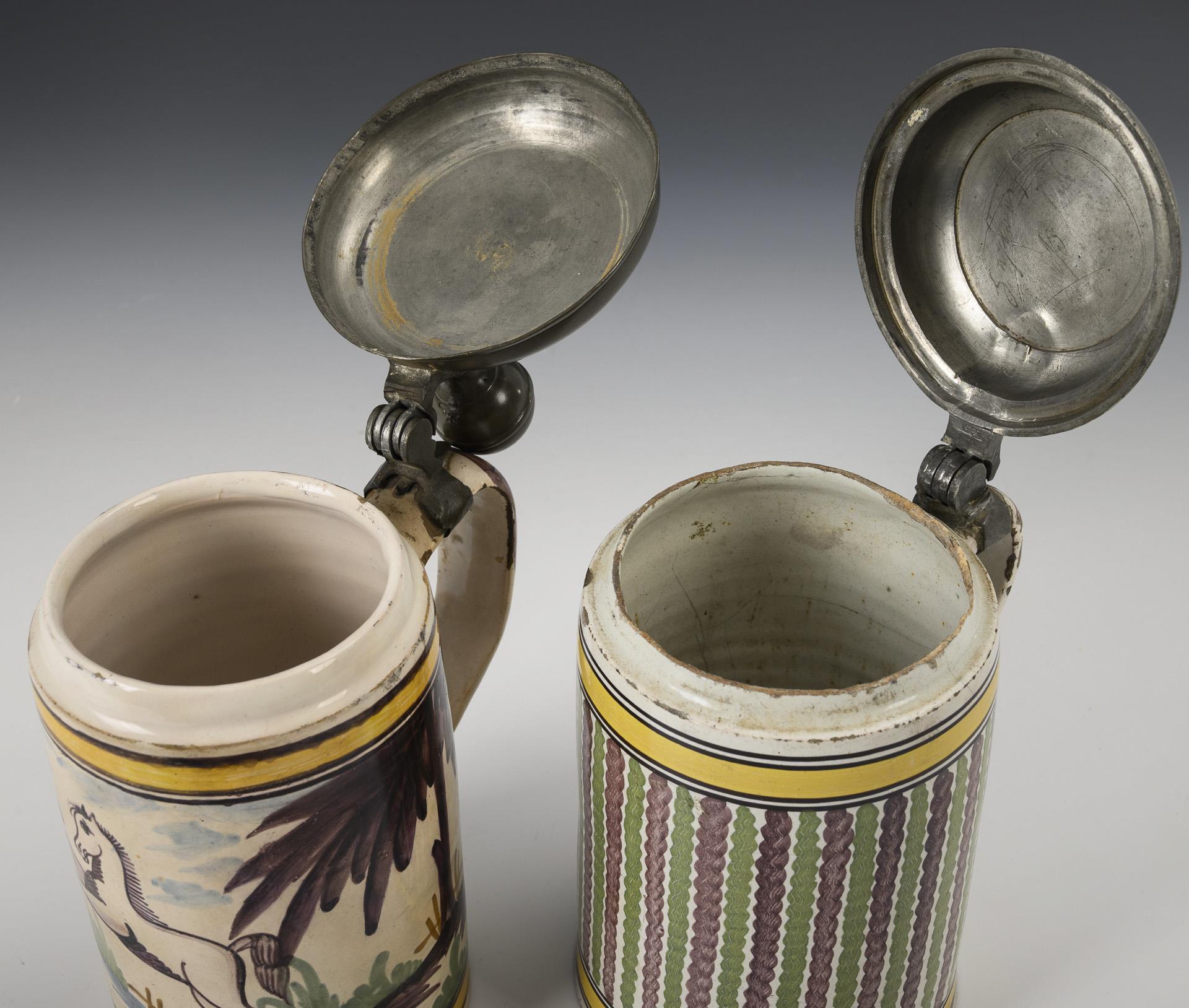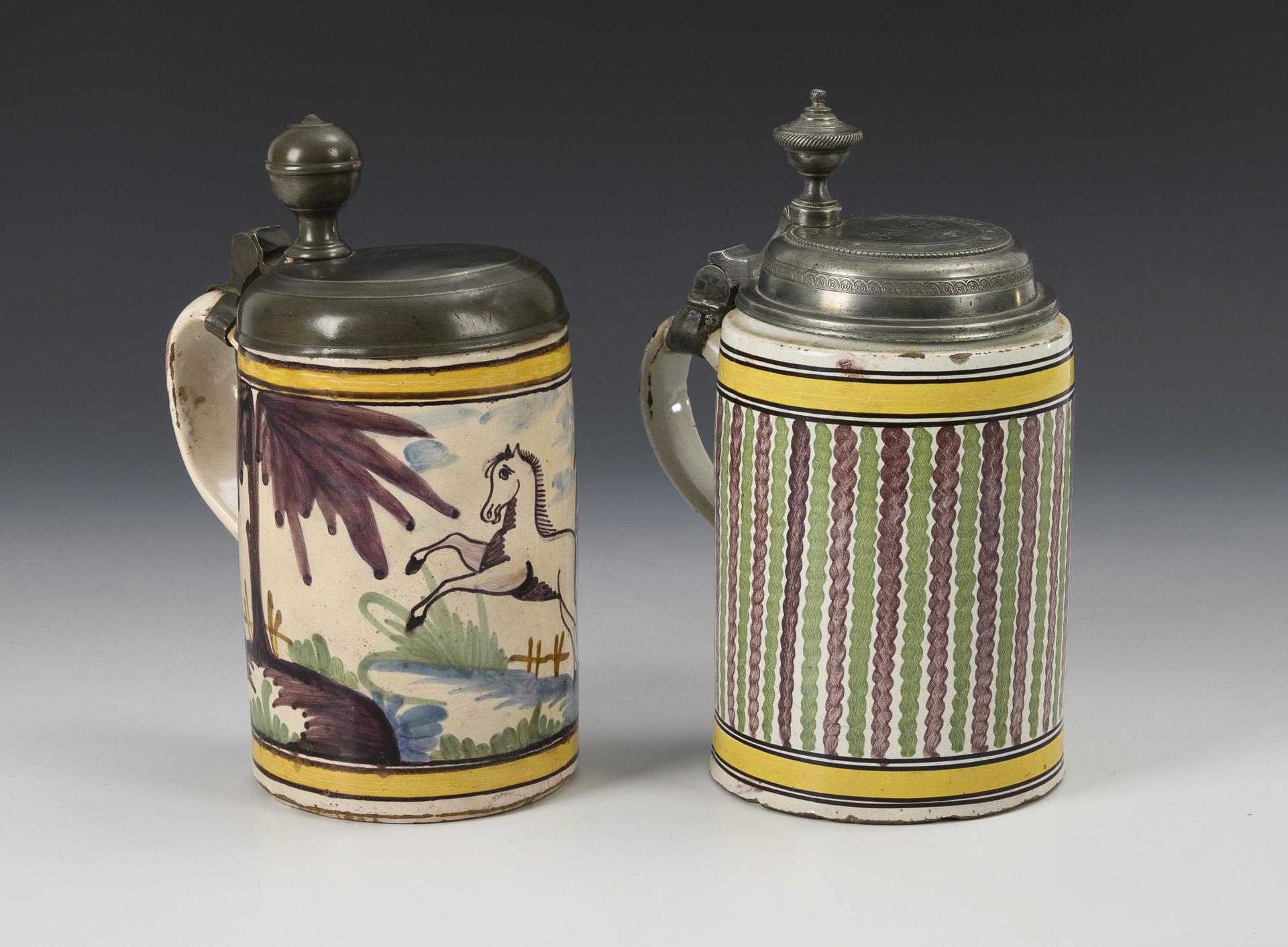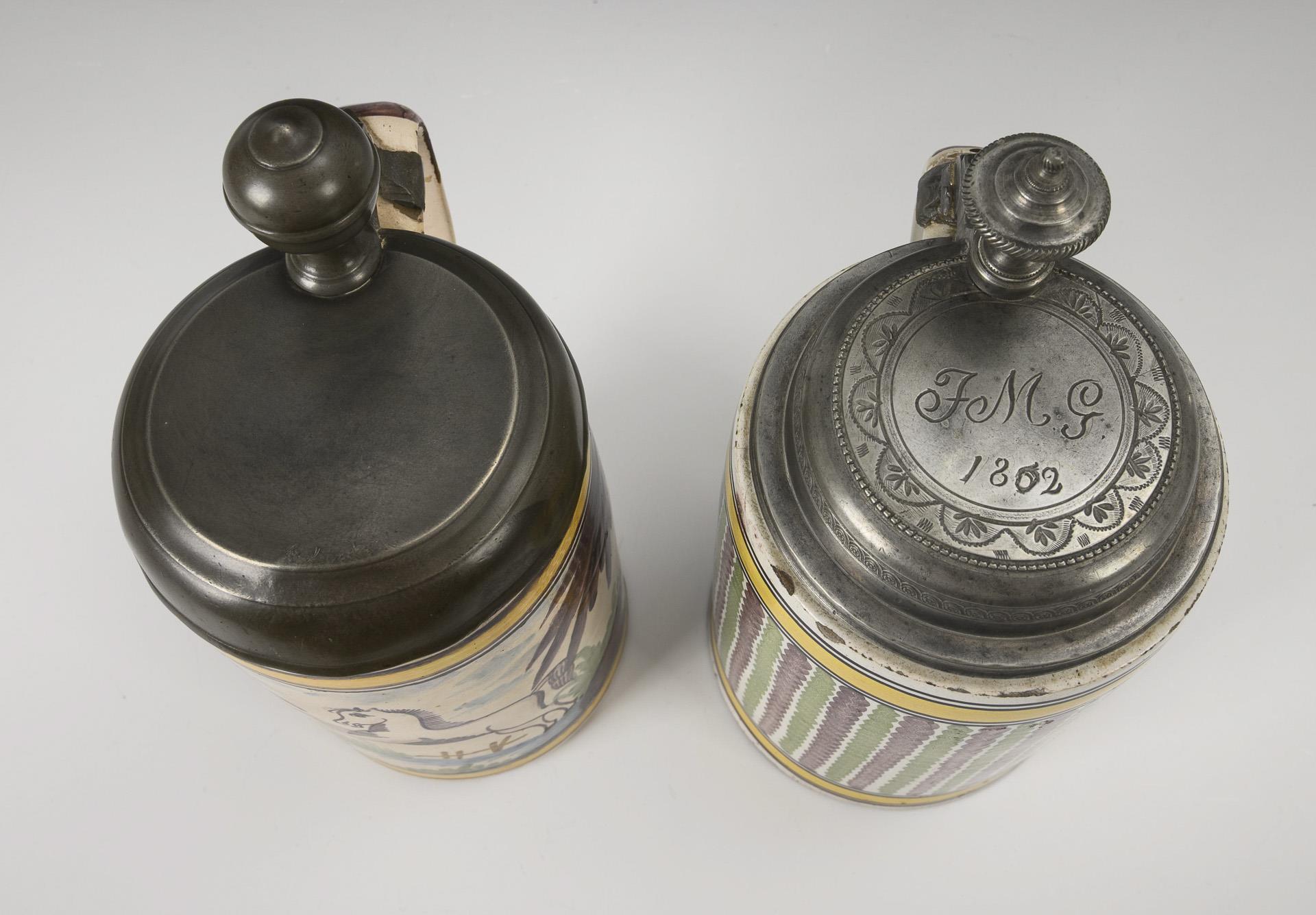 Jeweils zylindrischer Korpus mit Bandhenkel, 1x springendes Pferd in einer Landschaft, 1x Vertikaldekor. Jeweils mit Zinndeckel und Drücker, 1x graviert "JMG 1802". 1 Krug rissig, 1 Krug restauriert, jeweils mit Glasurbestoßungen und Bereibungen.