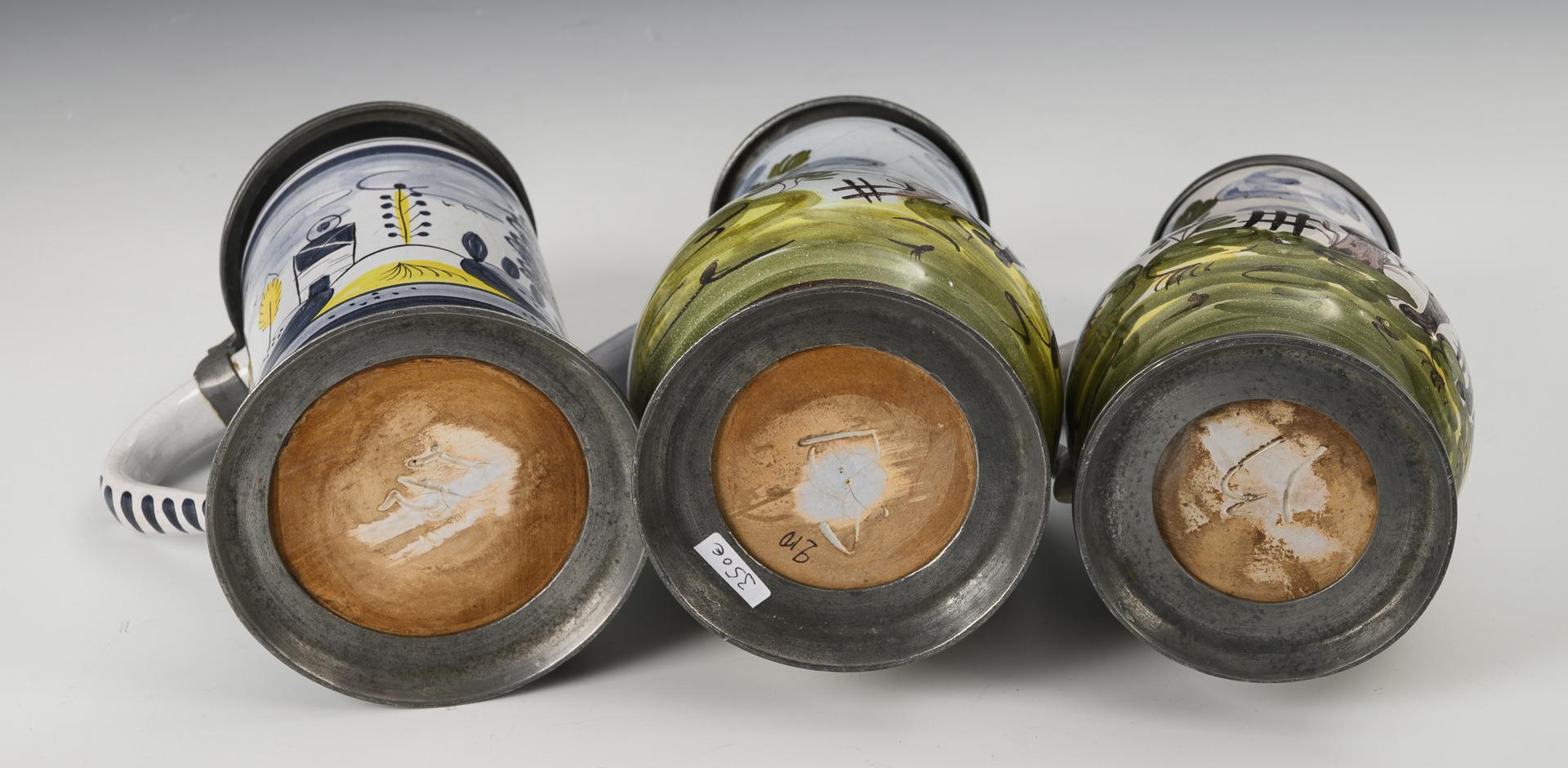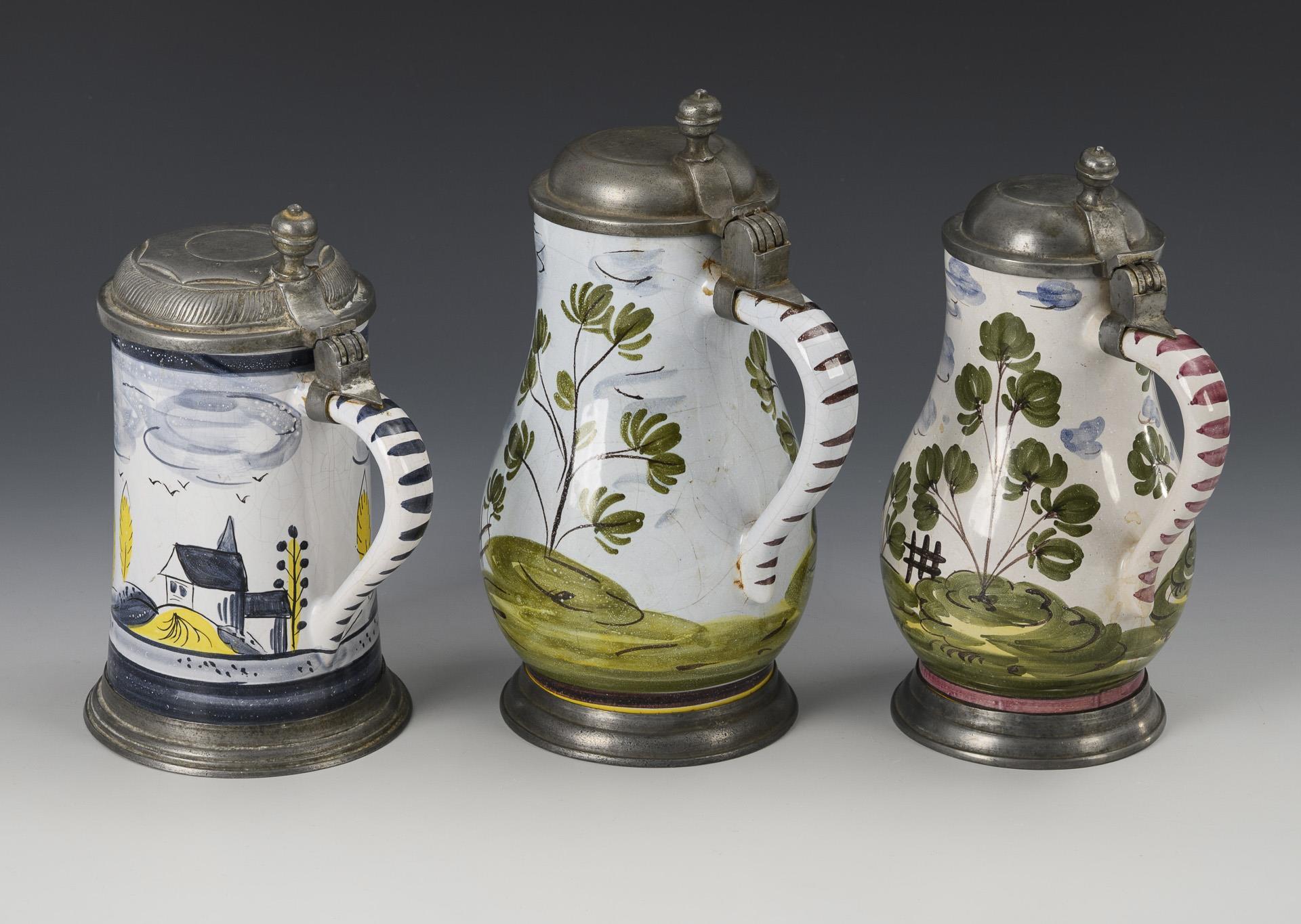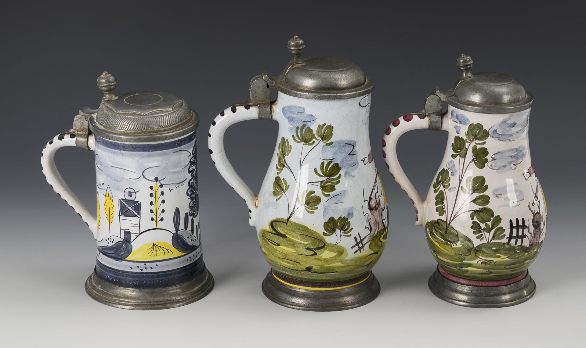 2 Birnkrüge mit Jägern in einer Landschaft, 1 Walzenkrug mit Landschaft und Architektur. Jeweils mit Zinndeckel und Kugeldrücker, 1x gepunzt, Zinnstandring. Leicht glasurrissig, 1 Deckel nicht passend.