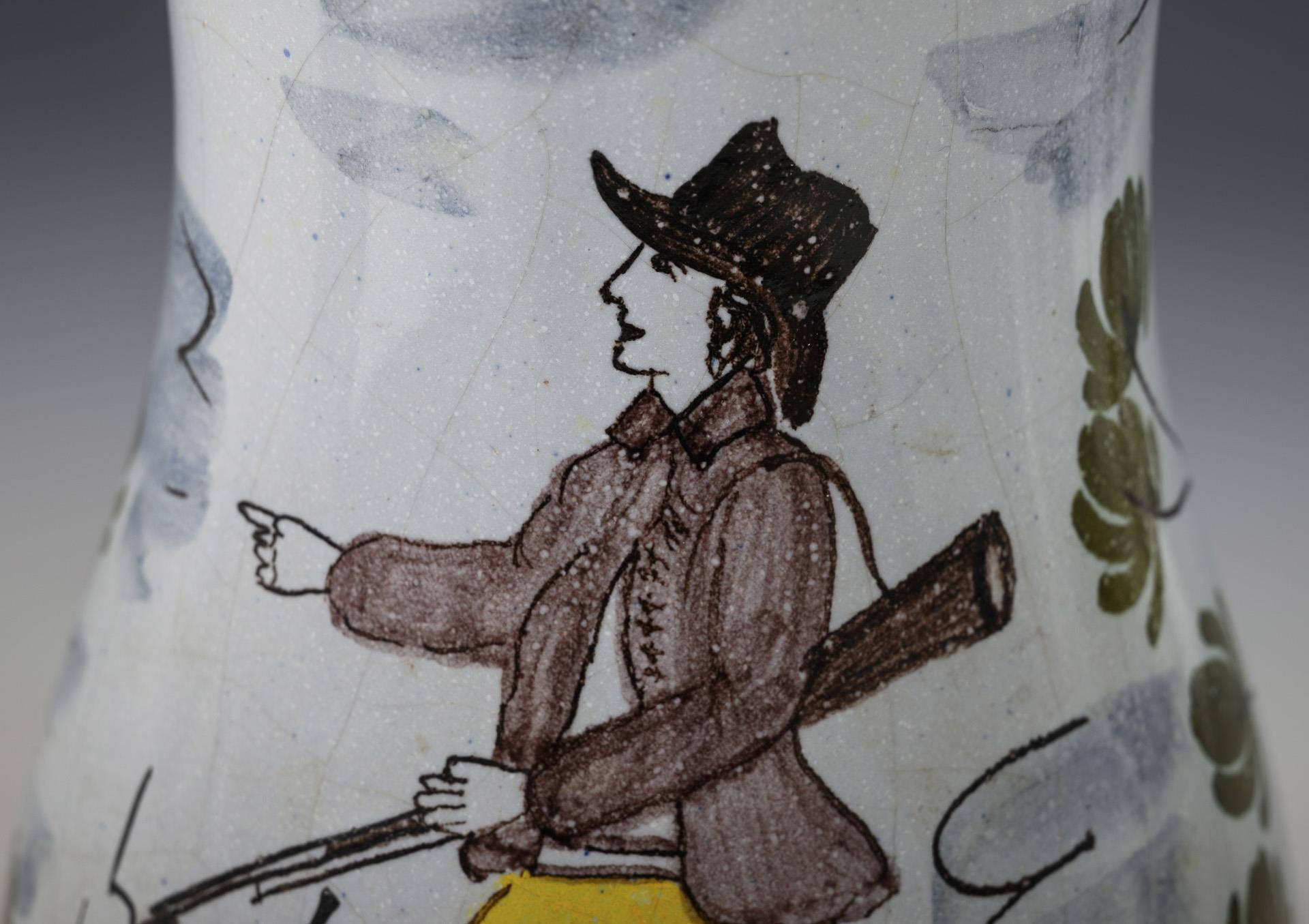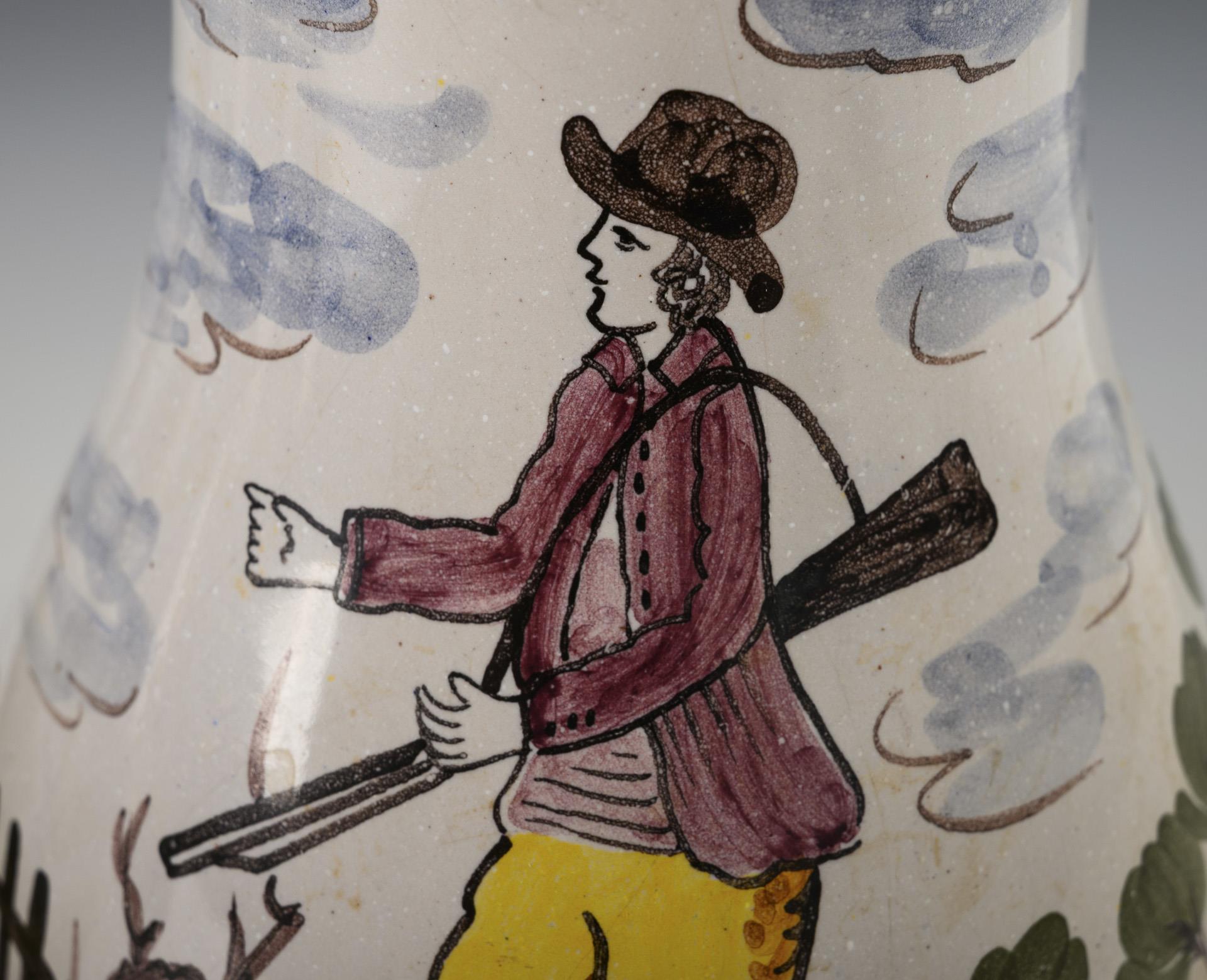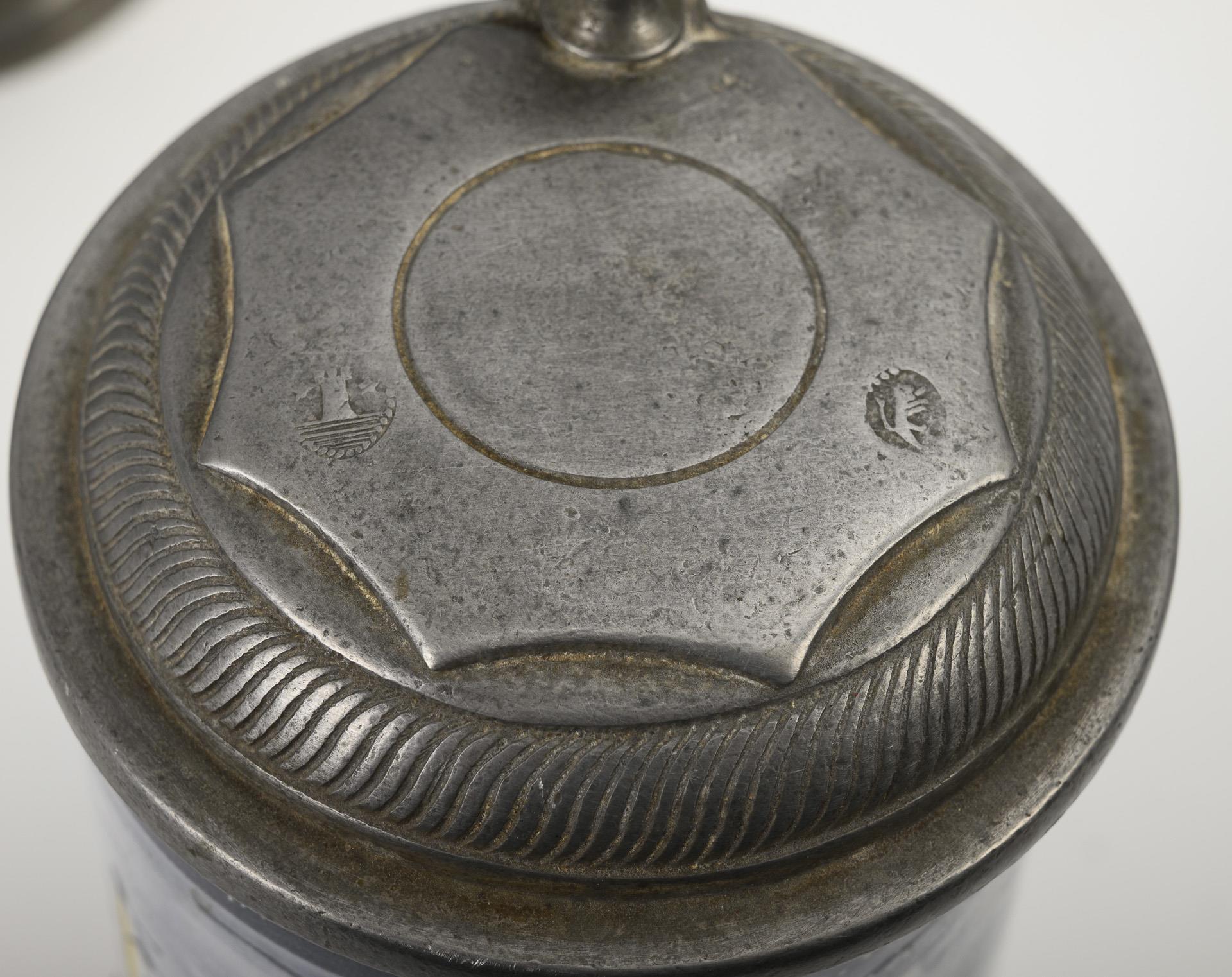 2 Birnkrüge mit Jägern in einer Landschaft, 1 Walzenkrug mit Landschaft und Architektur. Jeweils mit Zinndeckel und Kugeldrücker, 1x gepunzt, Zinnstandring. Leicht glasurrissig, 1 Deckel nicht passend.