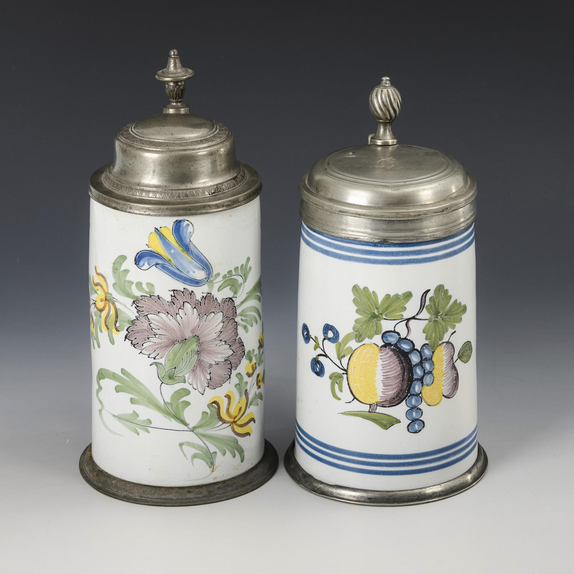 Jeweils zylindrischer Korpus mit verziertem Bandhenkel, 1x Gebinde mit Nelke, Tulpe und anderen Blumen, 1x Fruchtdekoration mit Apfel, Trauben und Birne. Jeweils mit profiliertem Zinndeckel und Drücker, 1x mit ligierter Monogrammgravur, Zinnstandring. Jeweils rissig, 1 Krug restauriert, 1 Krug partiell bestoßen und mit Glasurdefekten am Henkel.