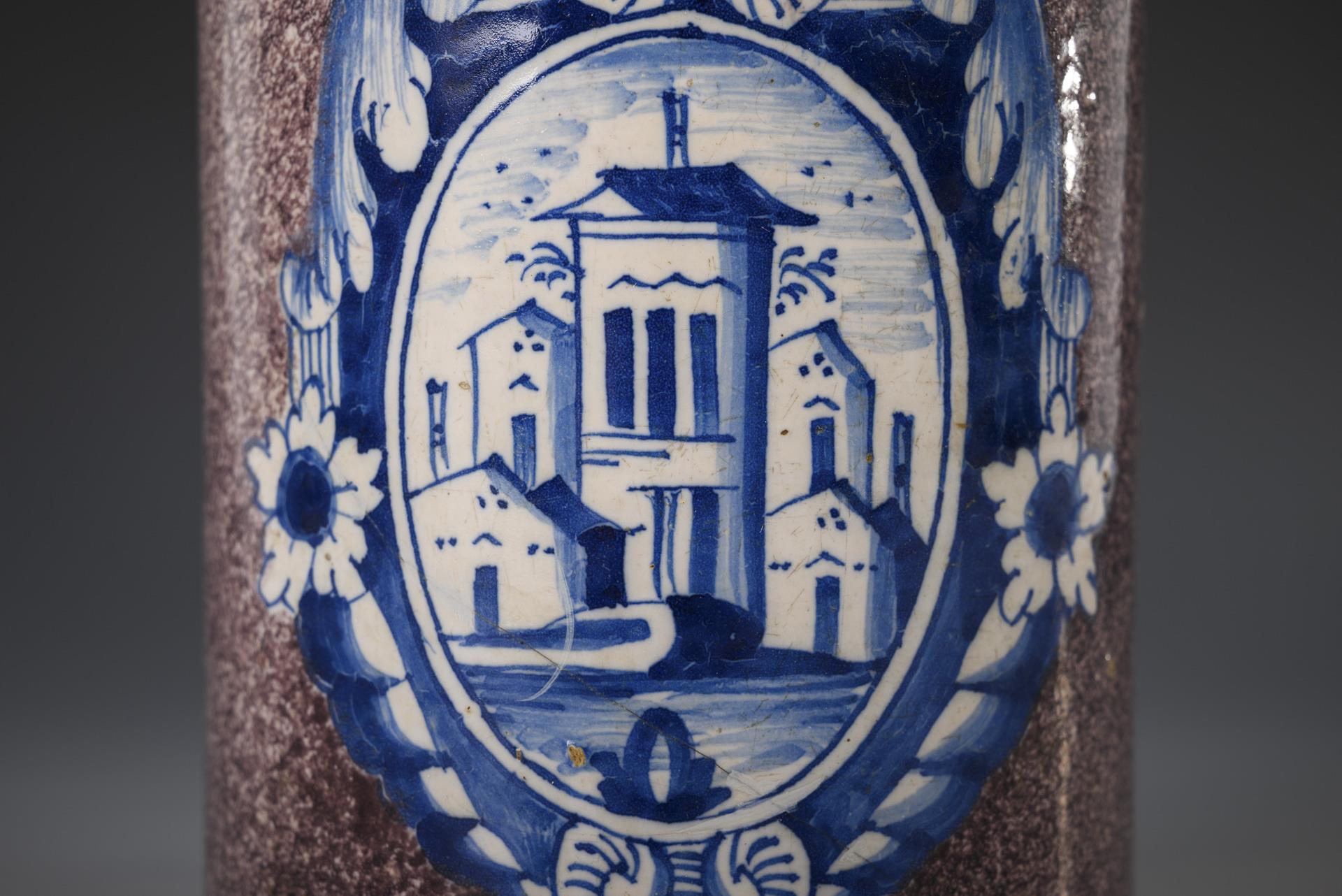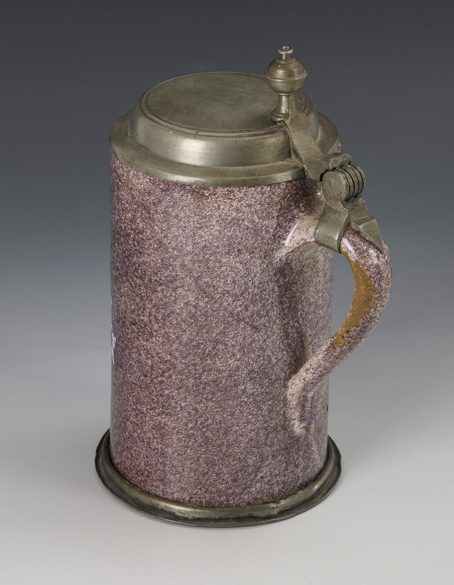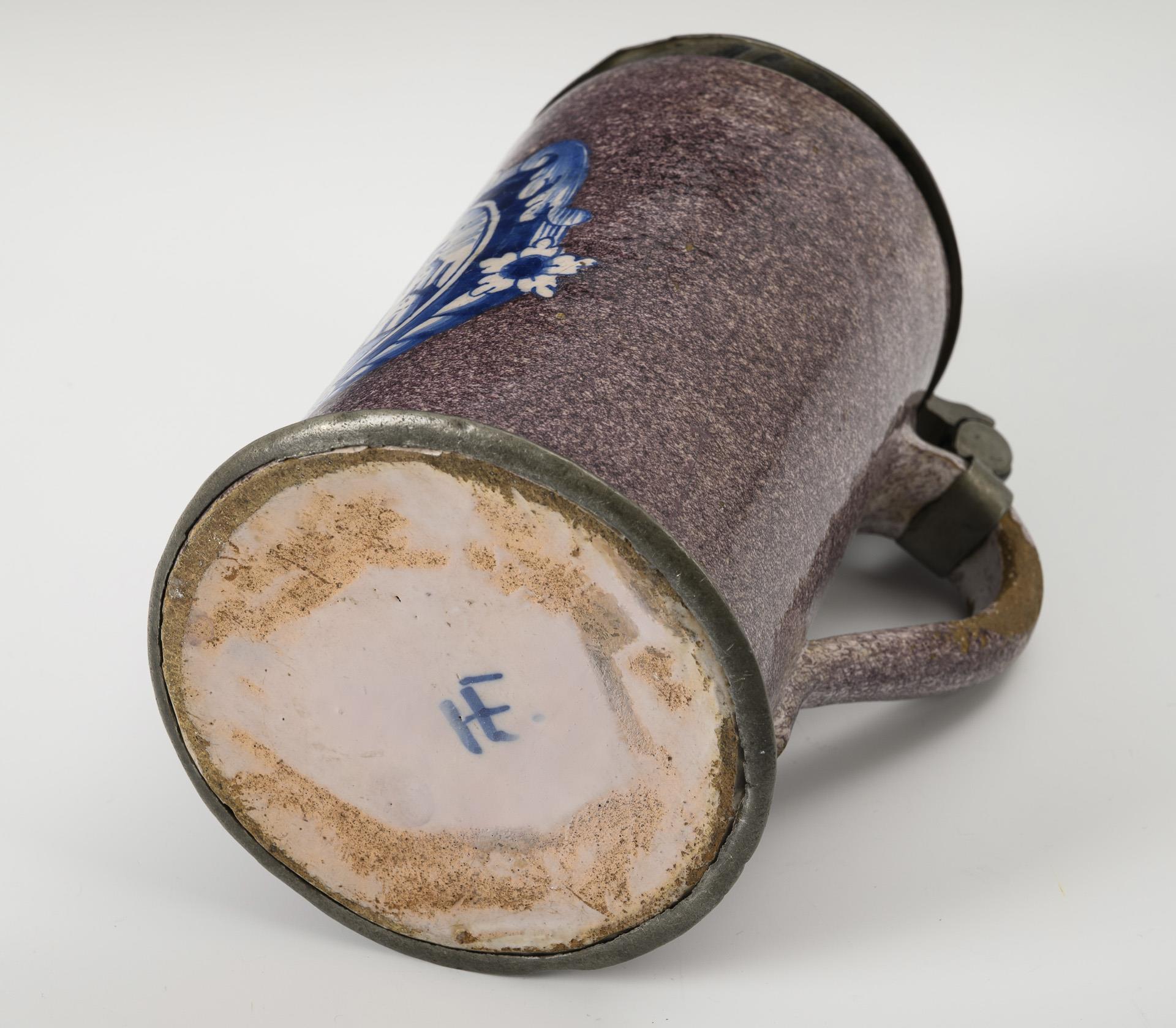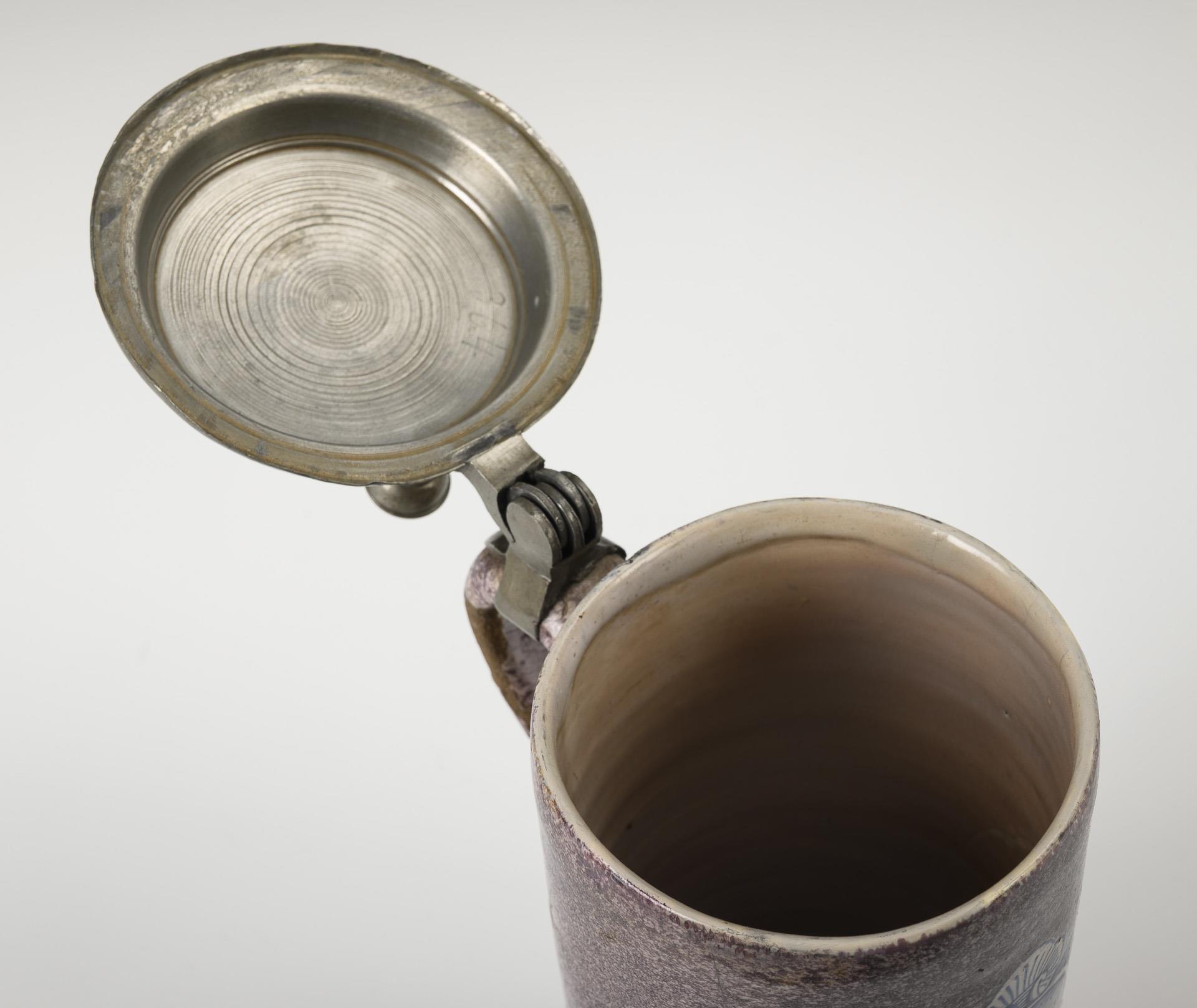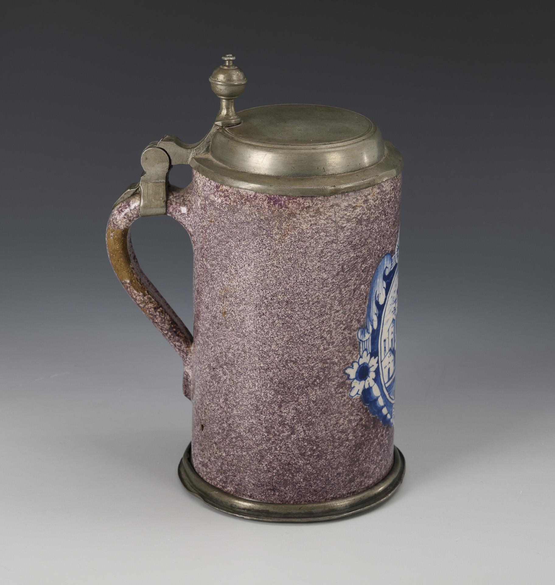 Zylindrischer Korpus mit spitz auslaufendem Bandhenkel, schauseitig eine große Barockreserve mit Häusern. Profilierter Zinndeckel mit Kugeldrücker, Zinnstandring. Wandungsrisse, restauriert, Defekte an der Glasur.