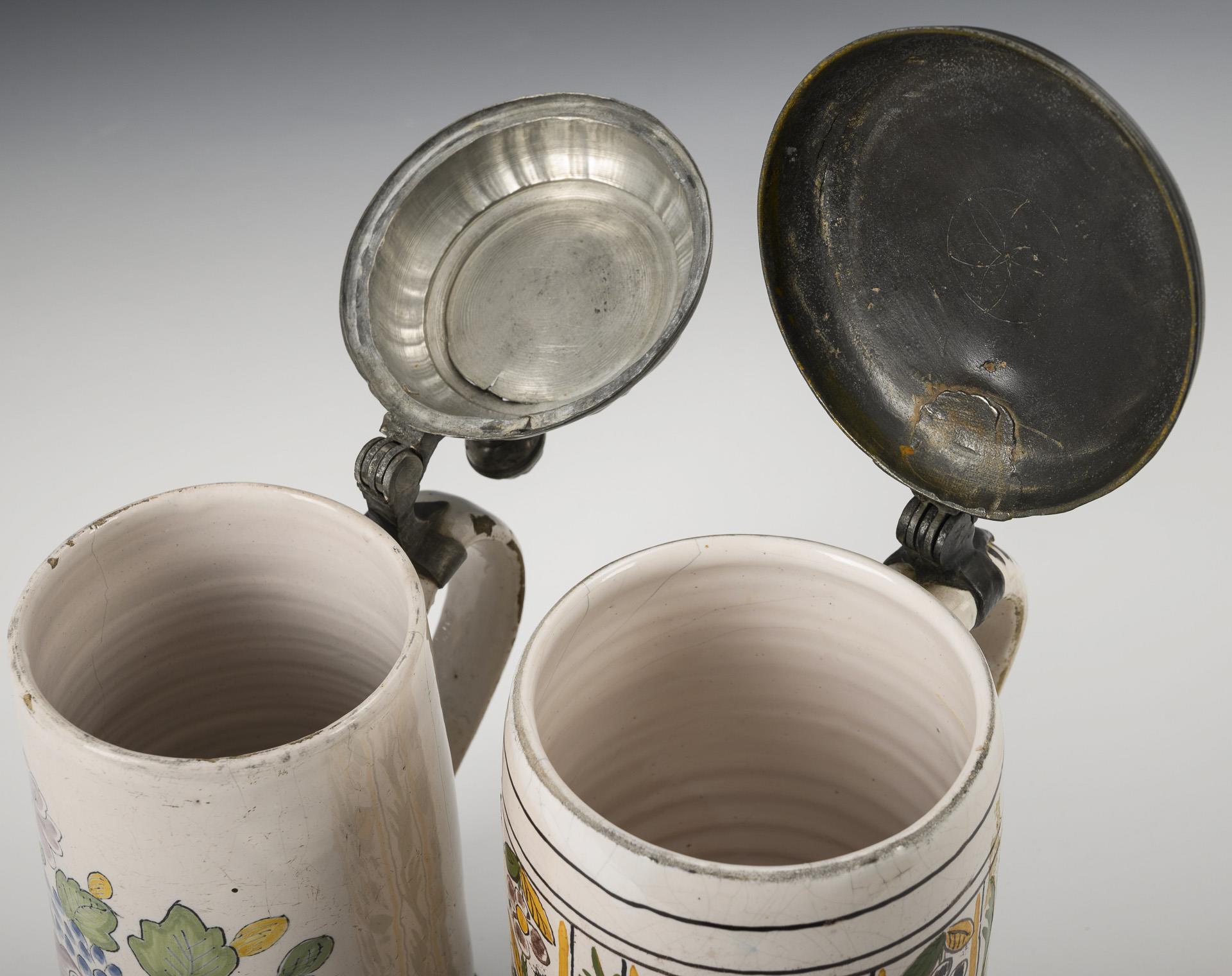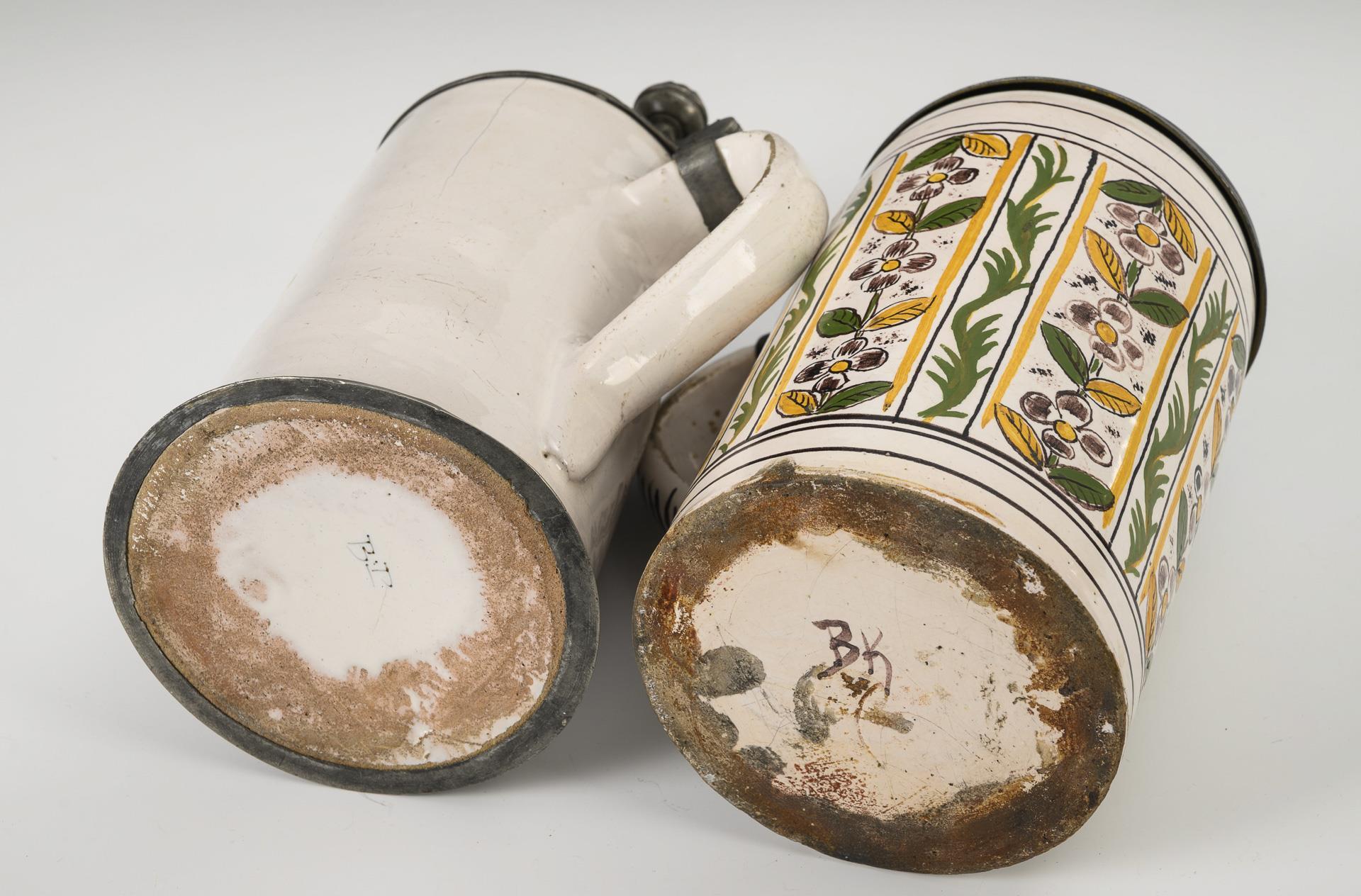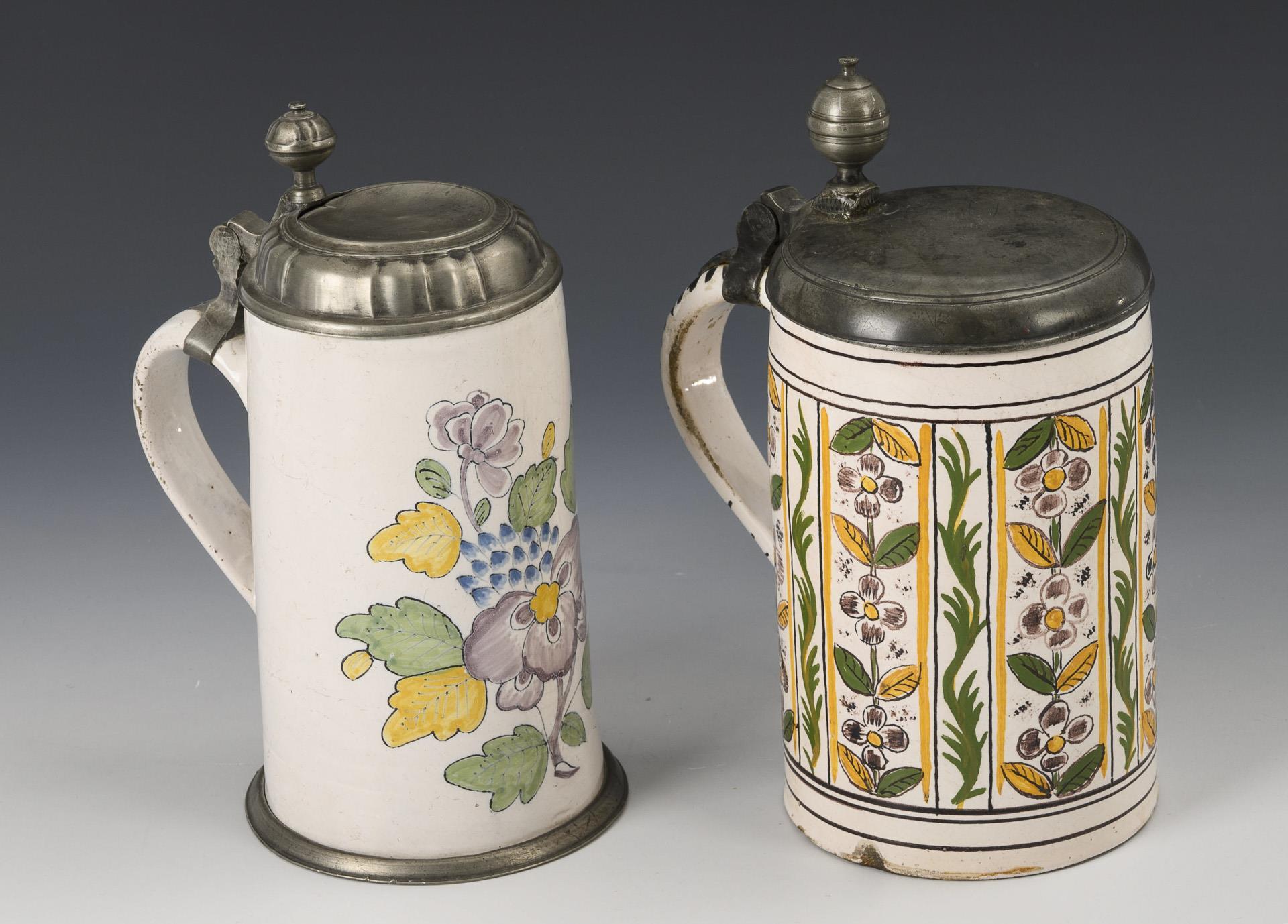 Jeweils zylindrischer Korpus mit Bandhenkel, 1x Gebinde aus verschiedenen Blumen, 1x vertikale Bänder mit Floraldekor. Jeweils mit Zinndeckel und Kugeldrücker, 1x Zinnstandring. Jeweils mit Rissen, 1x Zinndeckel rissig, Rand- und Glasurbestoßungen, Bereibungen.