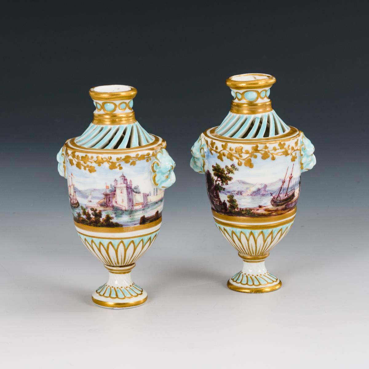 Halbovoide Vasen mit Maskaronhandhaben und durchbrochener Schulter. Umlaufend je eine fein gemalte Küstenlandschaft. Minimale Bestoßung an 1 Fußrand, minimaler Brandriss an 1 Durchbruchstab der Schulter.