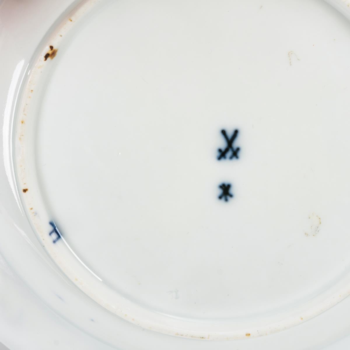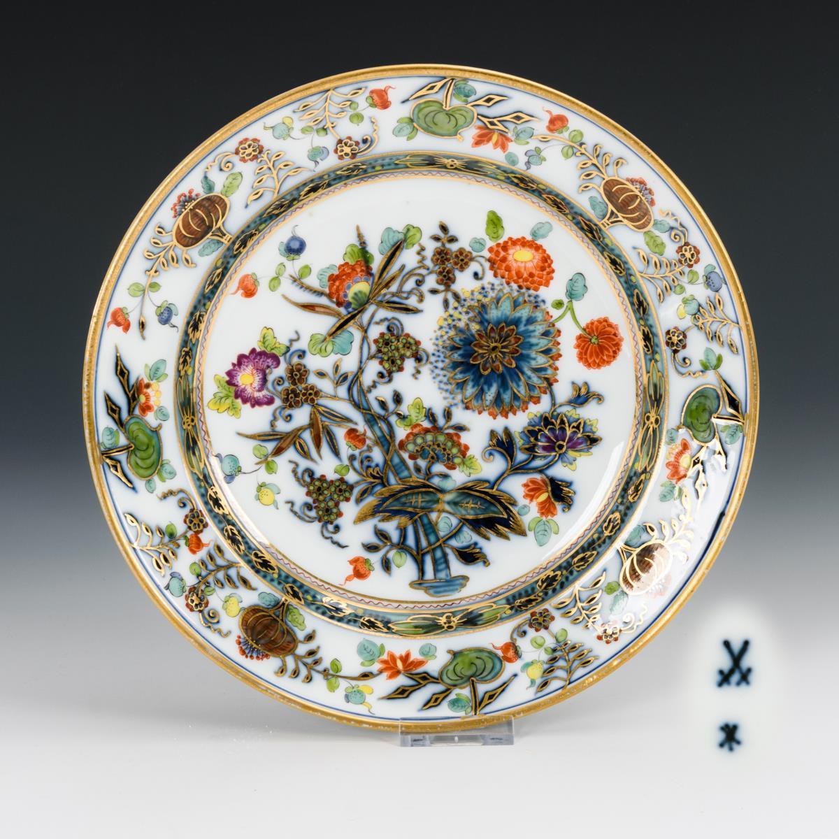 Unterglasurblaue, farbig gehöhte Malerei, Goldstaffage. Ø 24 cm.