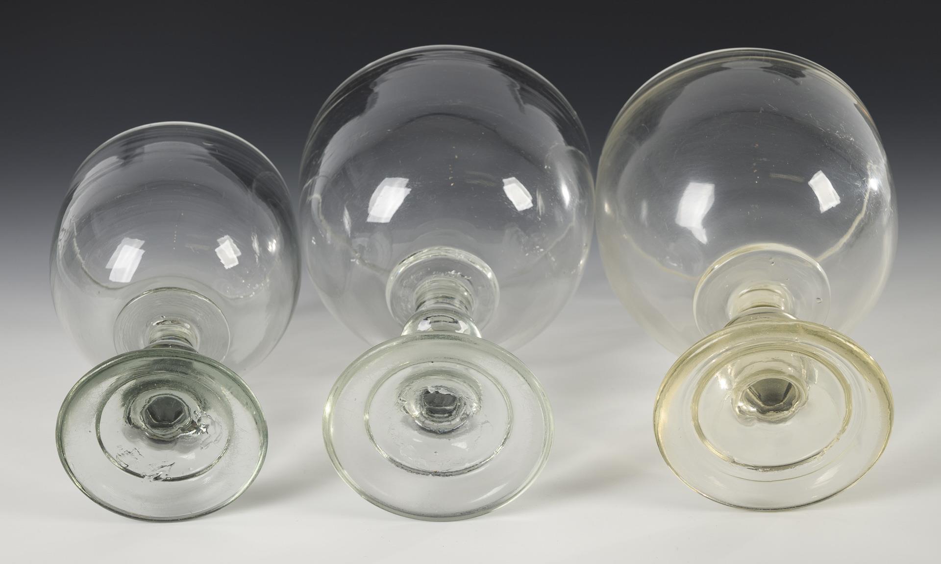 Farbloses, leicht schlieriges Glas, Zinnemail; teils mit Abriss. H 21,5-25 cm.