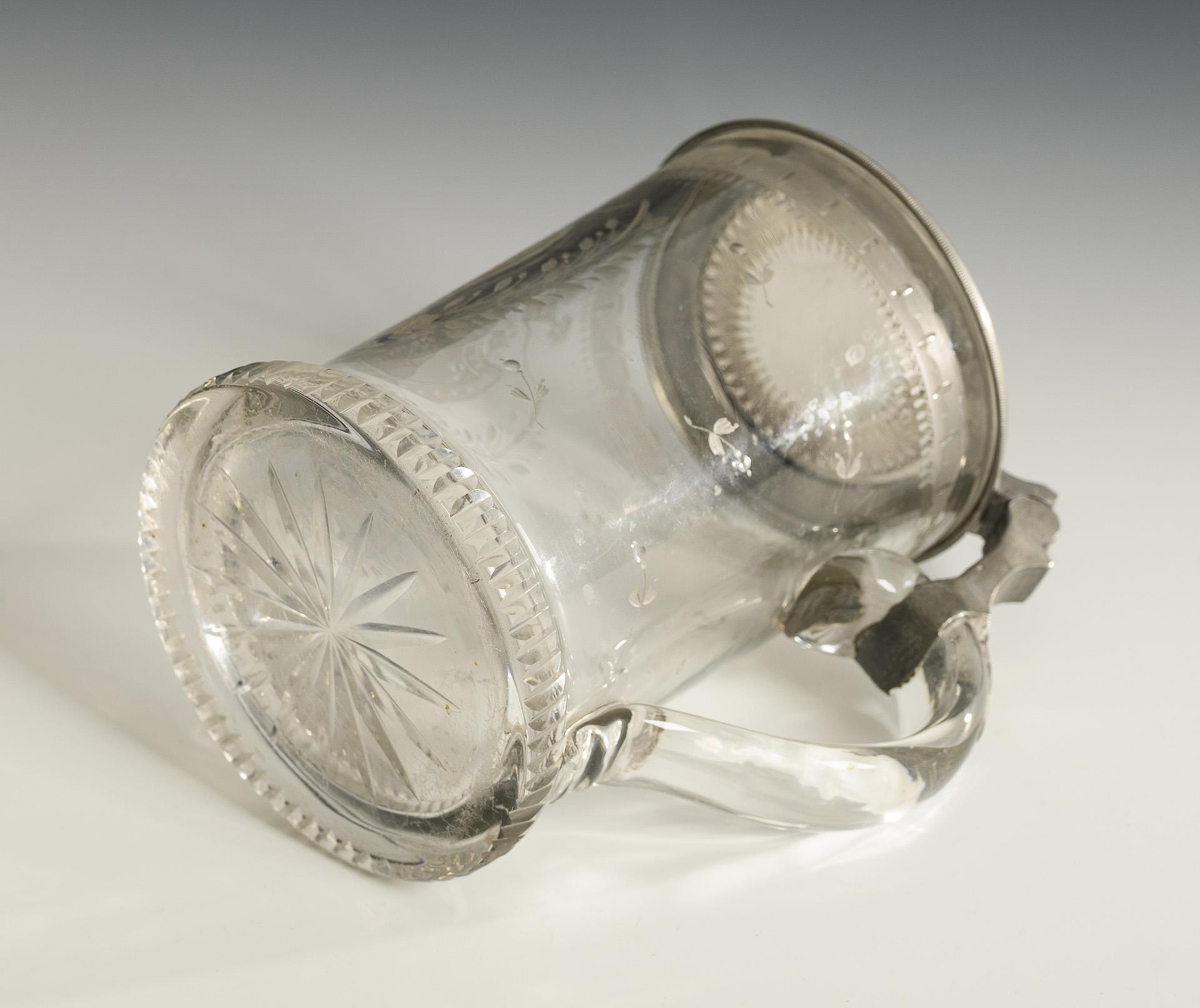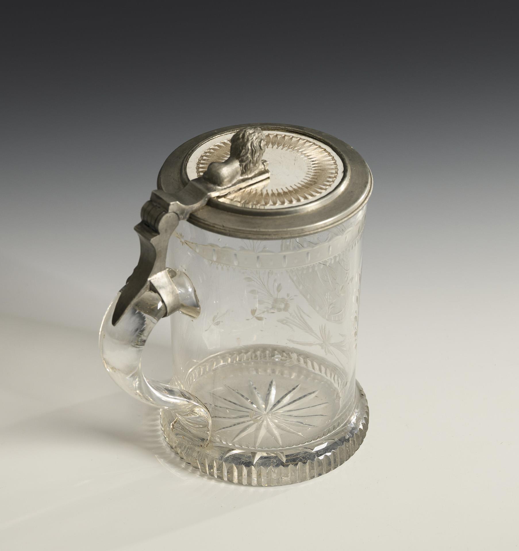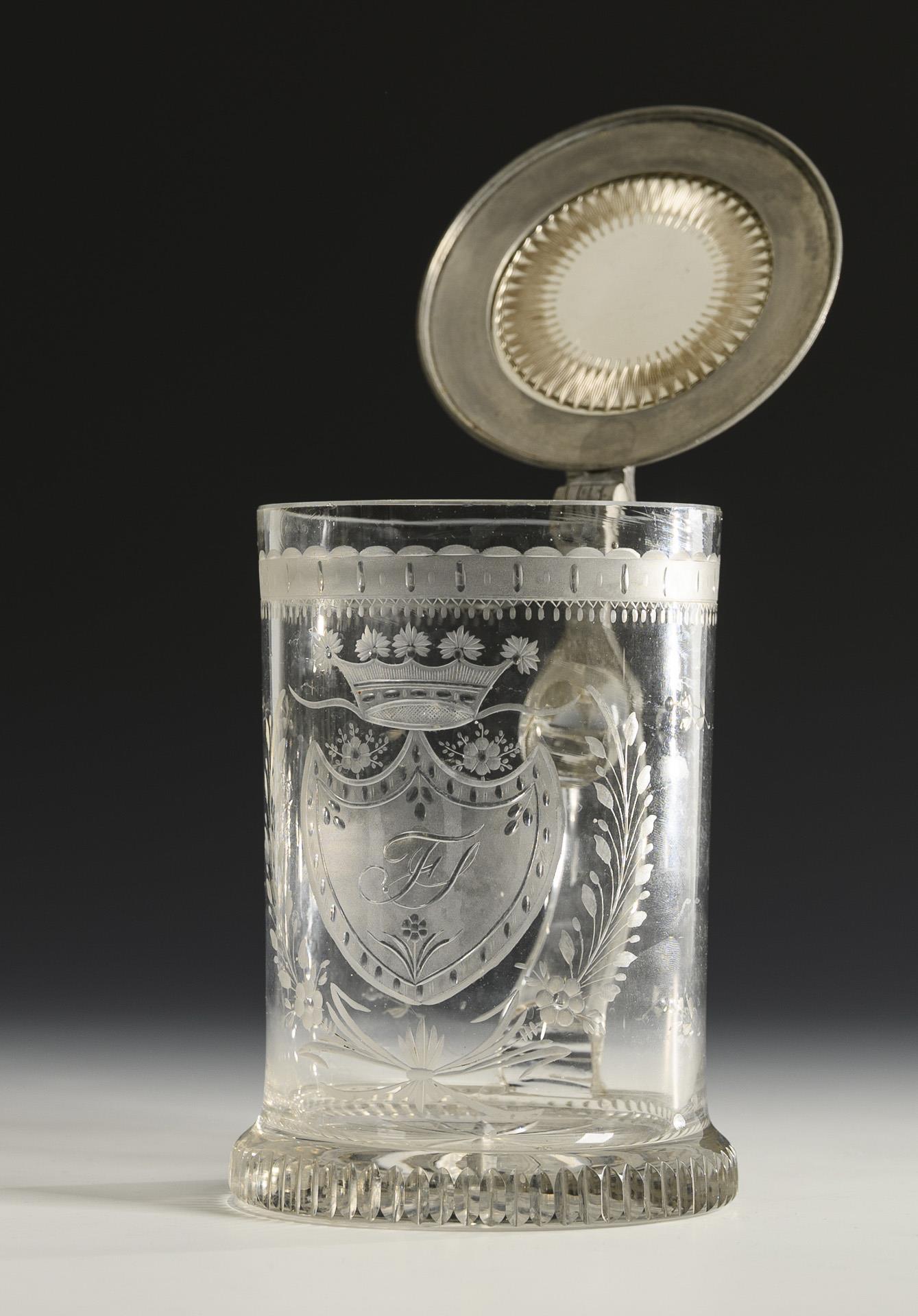 Walzenkrug mit Bandhenkel und jünger ergänztem, zinnmontiertem Scharnierdeckel mit Löwendrücker; Bodenstern. Schauseitig ein graviertes, teils poliertes Wappenschild mit dem Monogramm "FS" und einer Adelskrone.