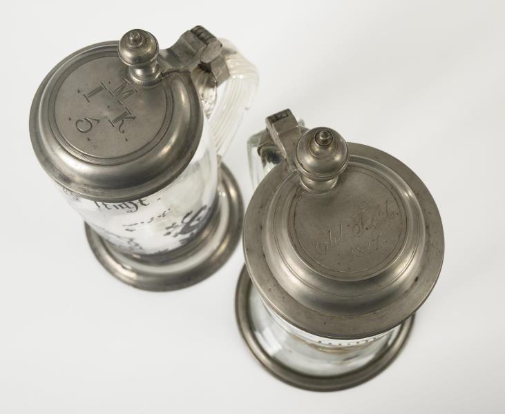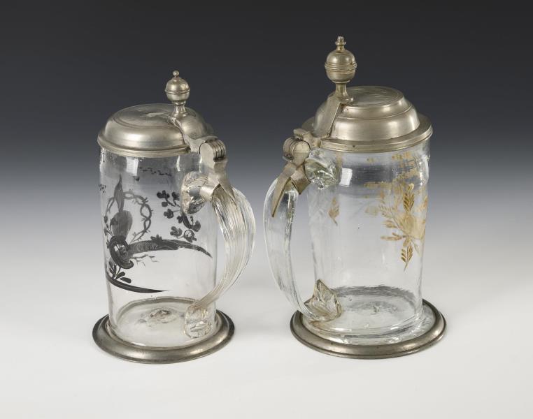 Walzenkrüge mit ausgestelltem, zinnmontiertem Stand, Bandhenkel und Zinndeckel; beide mit Abriss. 1x schauseitig die schwarzlotgemalte Darstellung eines flammenden Herzens mit Dornenkranz, darüber die Aufschrift "Draue nicht, es sticht.". / 1x ein graviertes und braun staffiertes Medaillon mit der Darstellung einer Landschaftsinsel mit Hund, darüber die Bezeichnung "Suche mein Herrn".