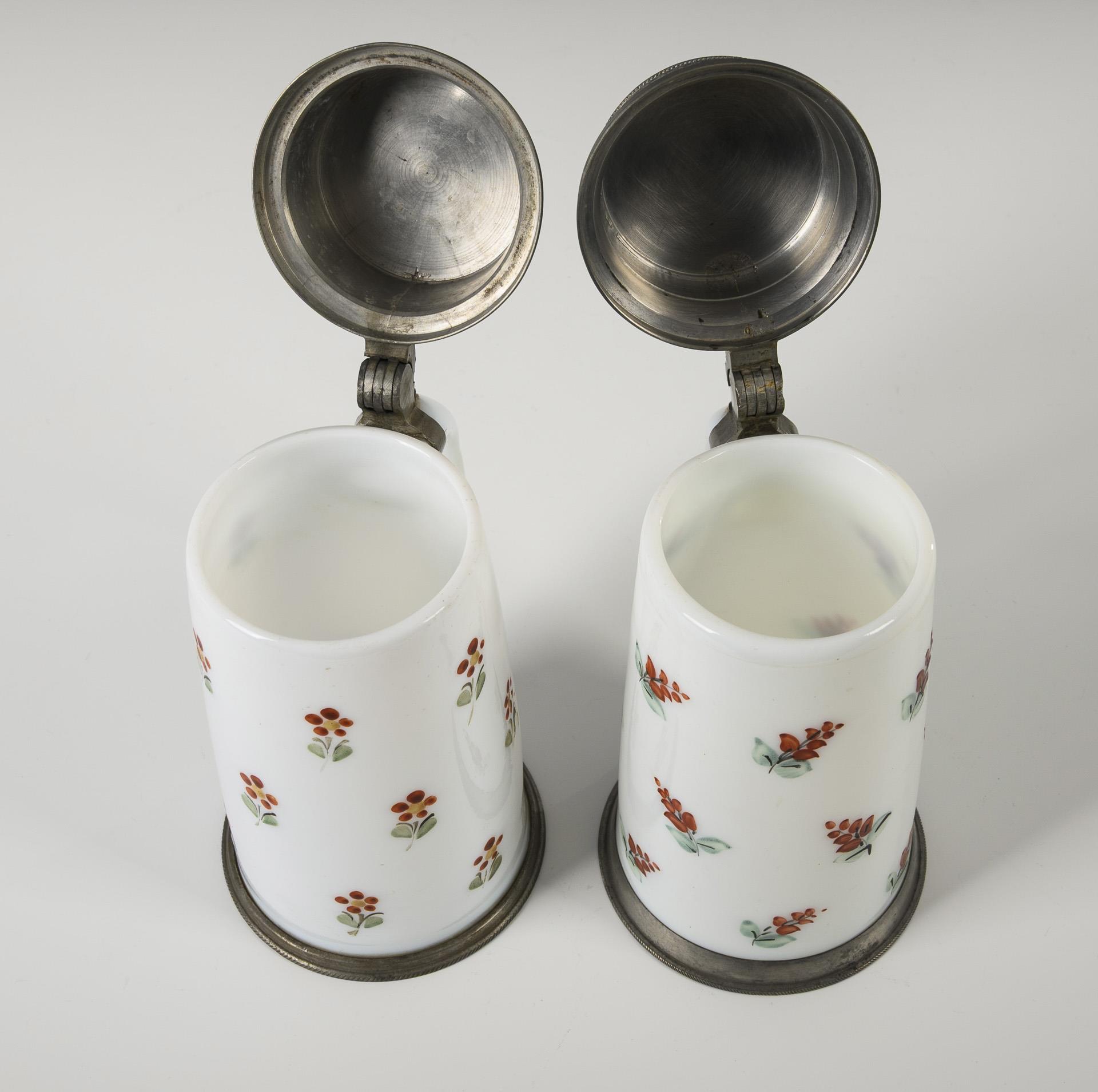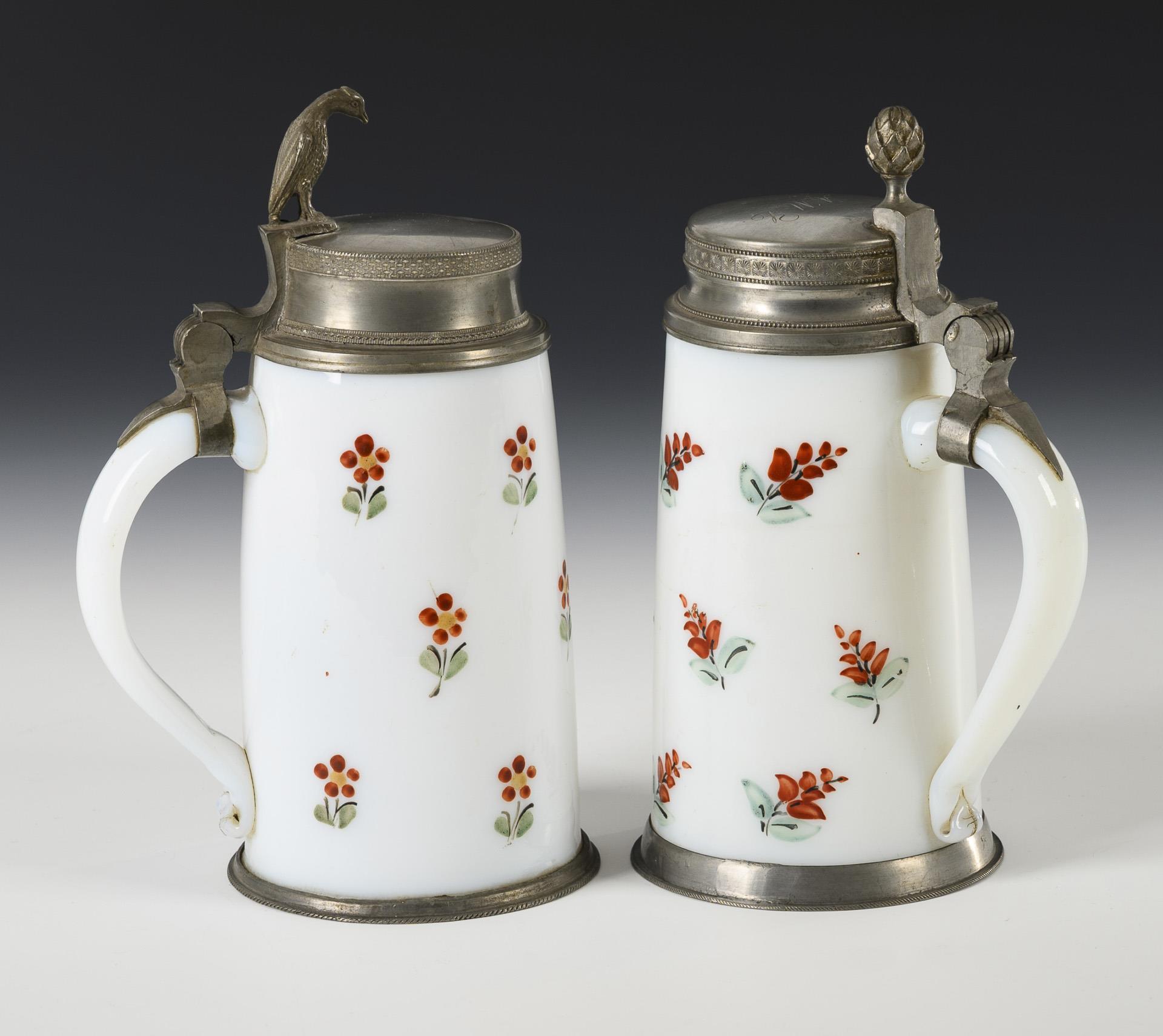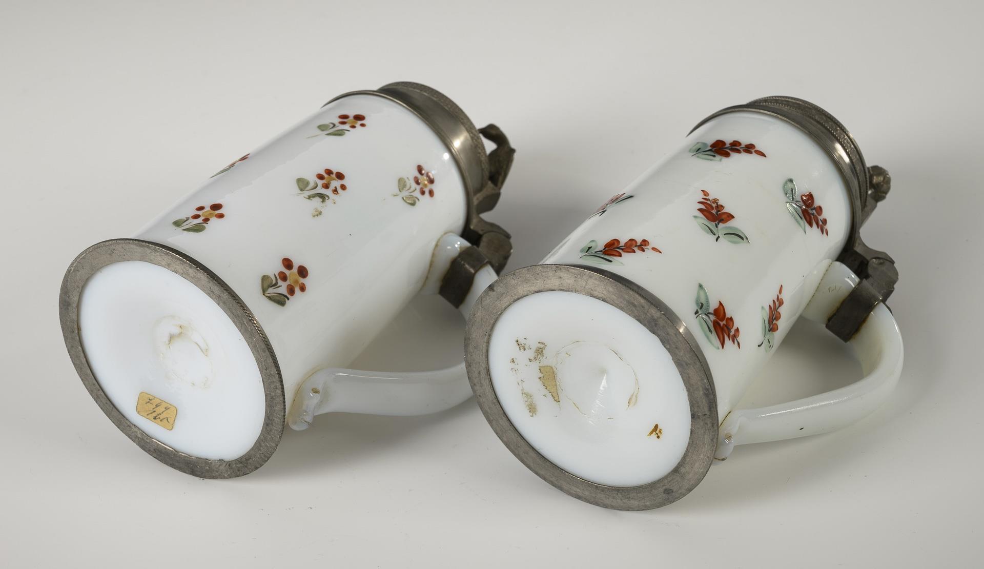 Weißes, opalisierendes Milchglas, polychrome Emailmalerei, Zinn. H 19,5 und 20,5 cm. 1,2 kg.