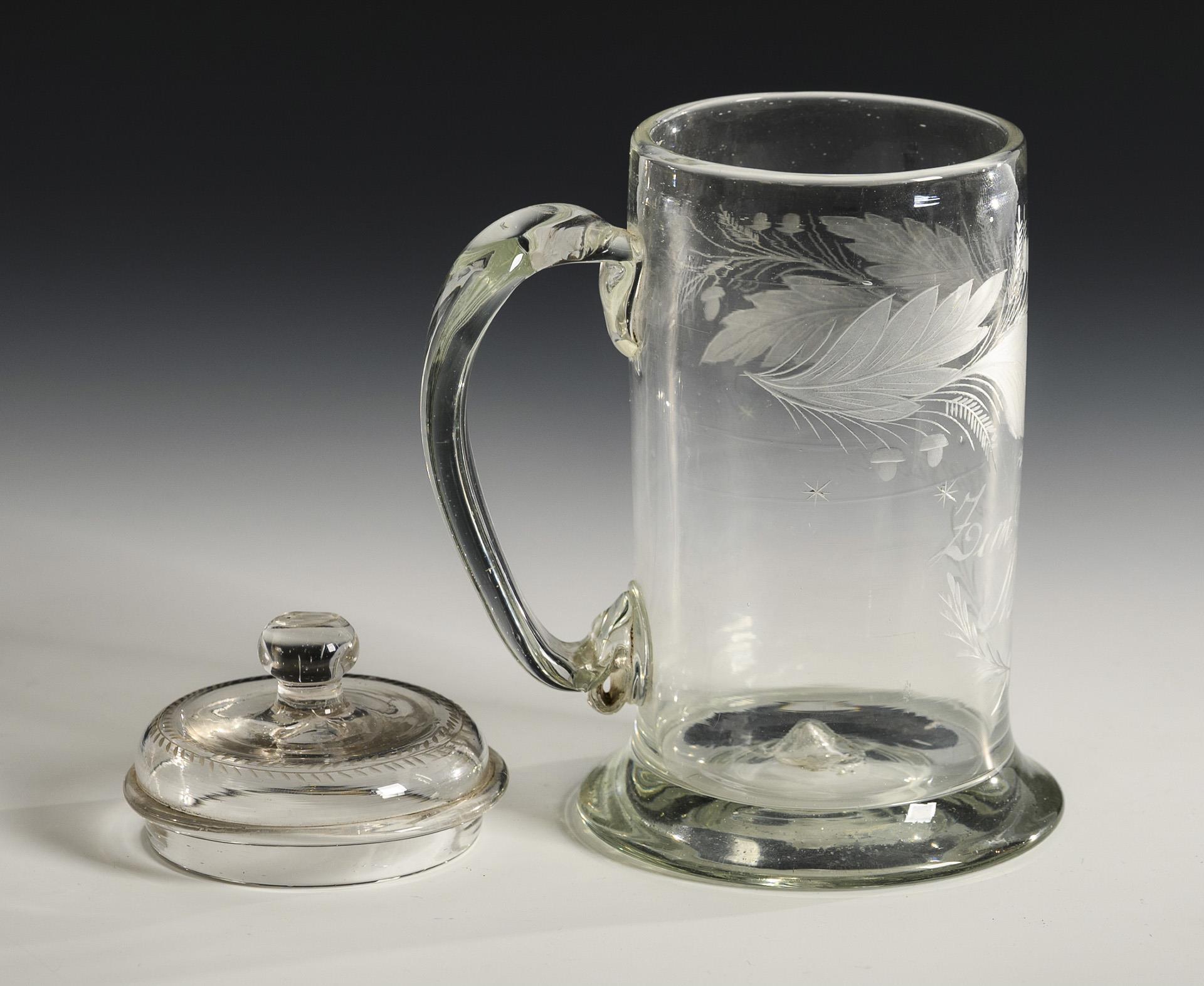 Walzenkrug mit ausgestelltem Stand, Bandhenkel und Knaufdeckel. Schauseitig unter einer gravierten Eichenlaubranke die gravierte Aufschrift "Zum Andenken M. C.".