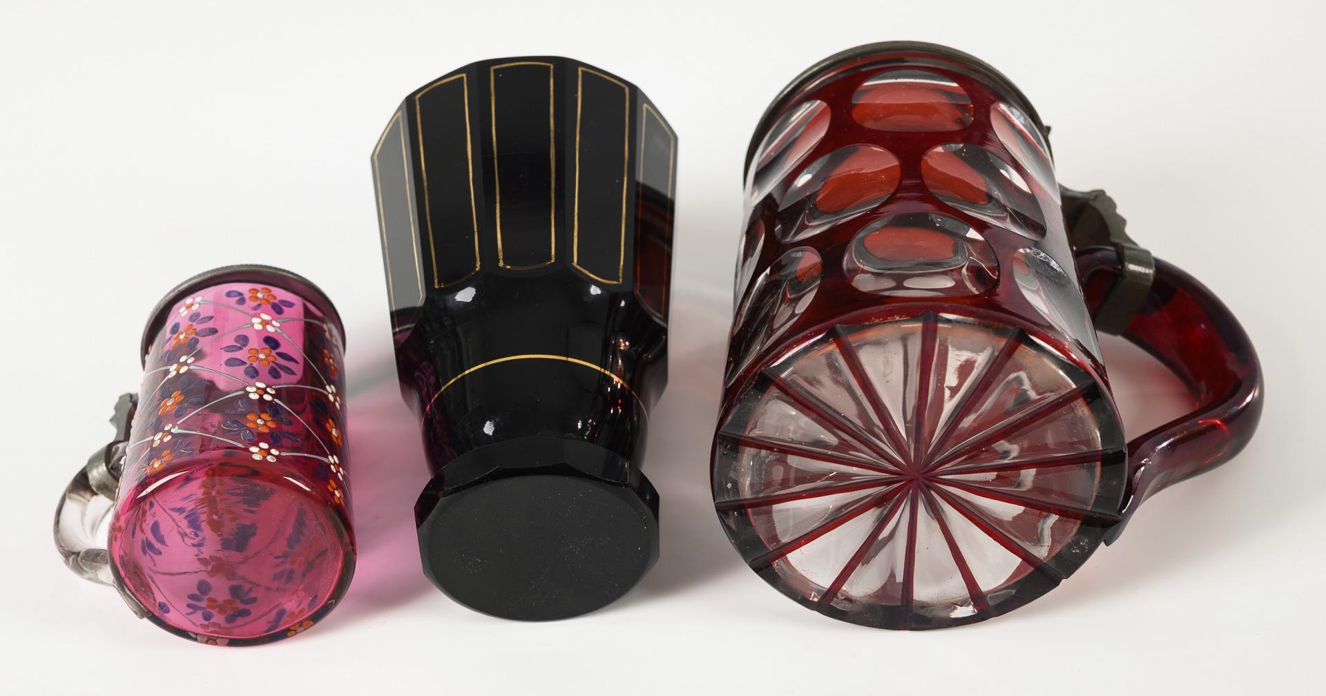 1x kleiner, längsoptischer Bierkrug aus farblosem Glas mit rosafarbenem Innenfang, polychromer, floraler Emailmalerei und zinnmontiertem Scharnierdeckel mit Glaseinsatz (H 10 cm). / 1x konischer Krug aus farblosem, rot gebeiztem Glas mit geschliffenen Linsen, Ohrenhenkel und Zinndeckel mit Glaseinsatz (H 16 cm). / 1x Facettierter Fußbecher aus Rubinglas mit Goldliniendekor (H 13,5 cm).