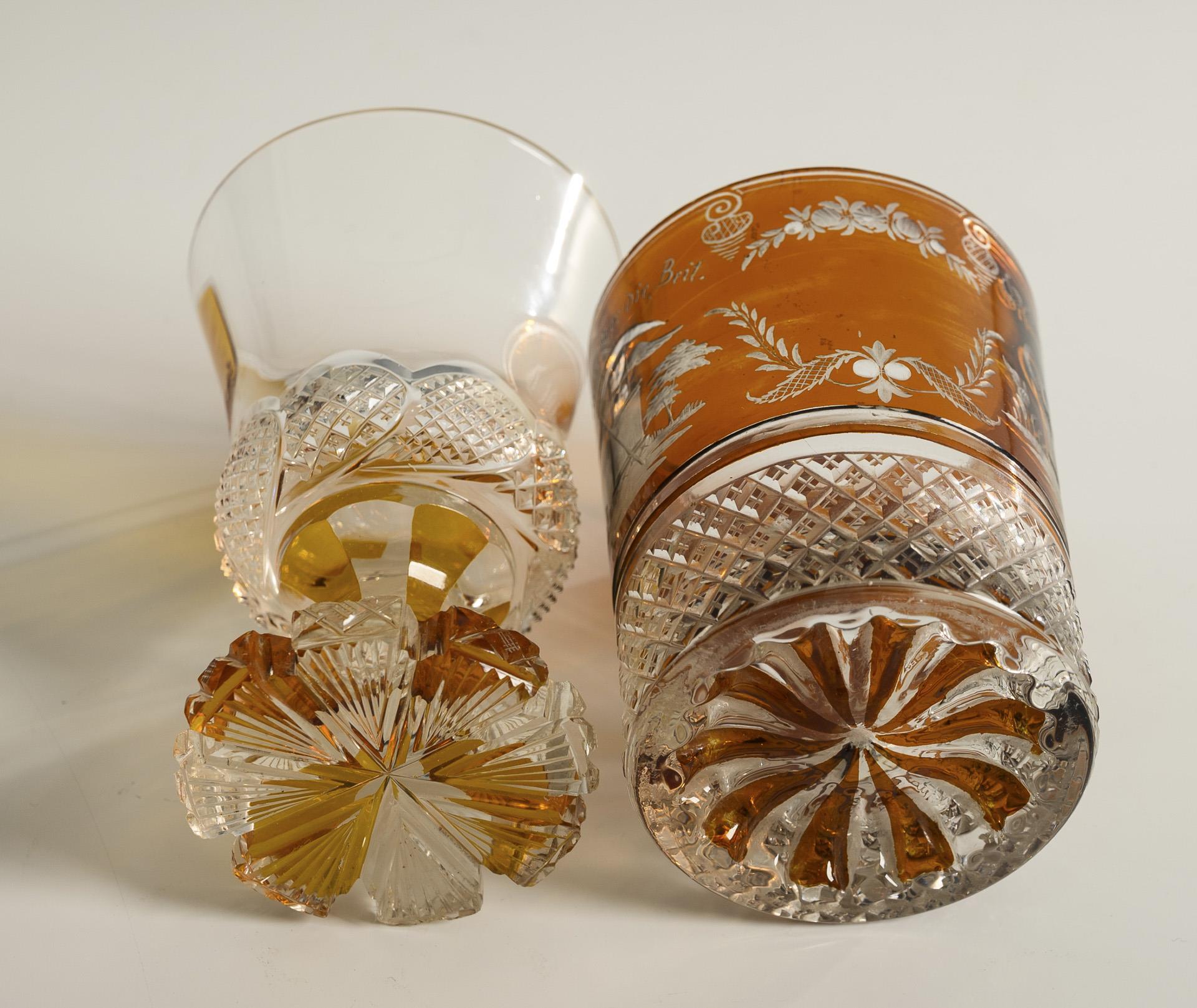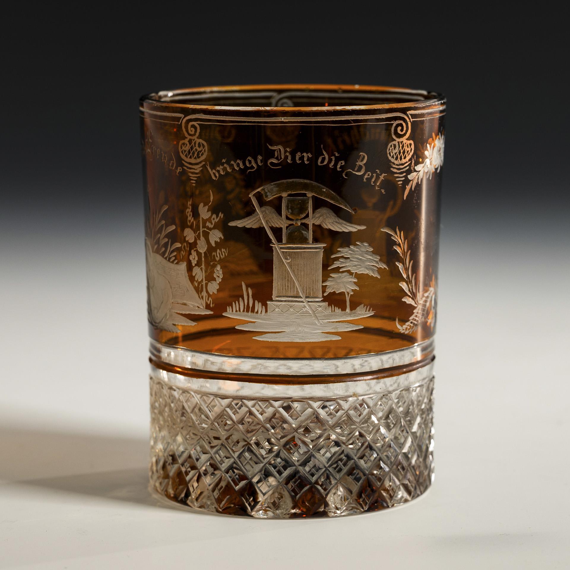 1x Zylinderbecher aus farblosem, bernsteinfarben gebeiztem Glas mit Steinelschliff am Ansatz: umlaufend fein gravierte Symbolarrangements mit der Losung "Gesundheit Glück und Freude bringe dir die Zeit.". / 1x Kelchglas aus farblosem, teils gelb gebeiztem Glas mit Facetten-, Kerb- und Steinelschliff: schauseitig eine Kartusche mit der Darstellung eines Jägers mit Jagdhund. Kleine Bestoßung am Fuß des Kelchglases.