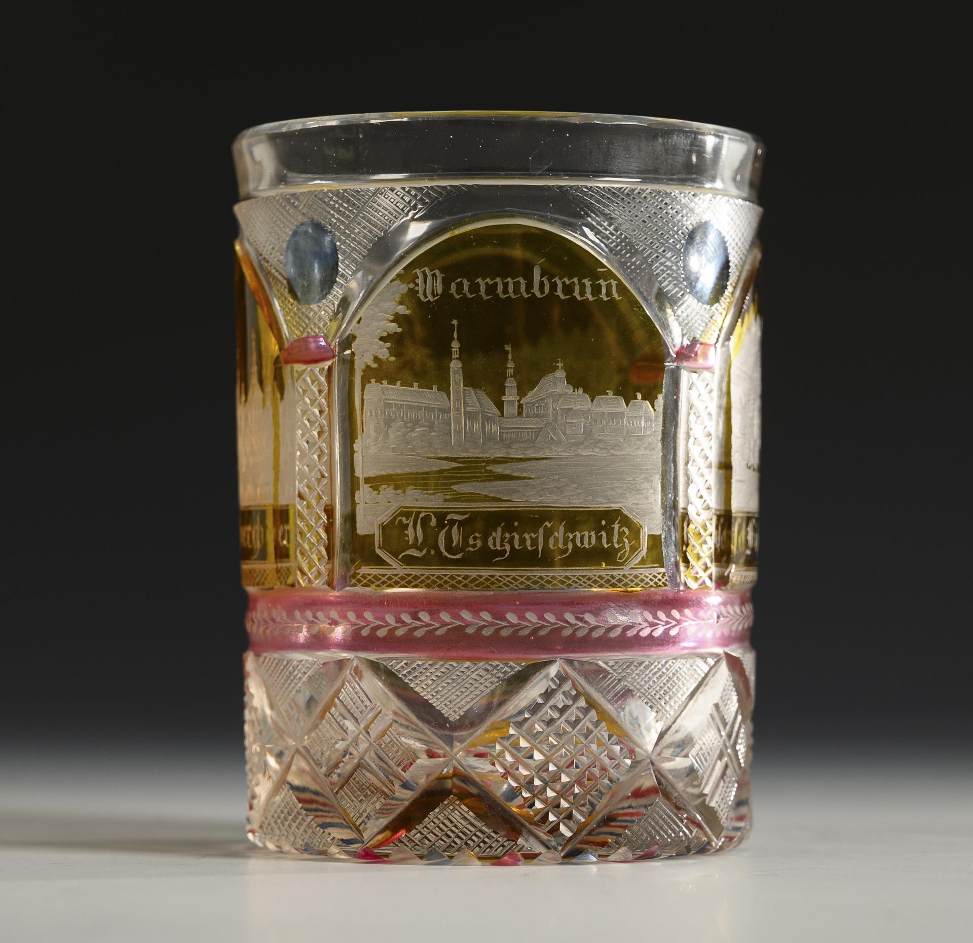 1x Zylinderbecher aus farblosem Glas mit der gravierten Ansicht von Hirschberg im Riesengebirge. / 1x Zylinderbecher aus farblosem, teils gelb, blau und rosa gebeiztem Glas mit Kerb-, Steinel- und Linsenschliff: in vier Kartuschen gravierte Ansichten von Hirschberg, Warmbrunn, Fischbach und dem Schweitzerhaus. 1x Bestoßungen am Stand.