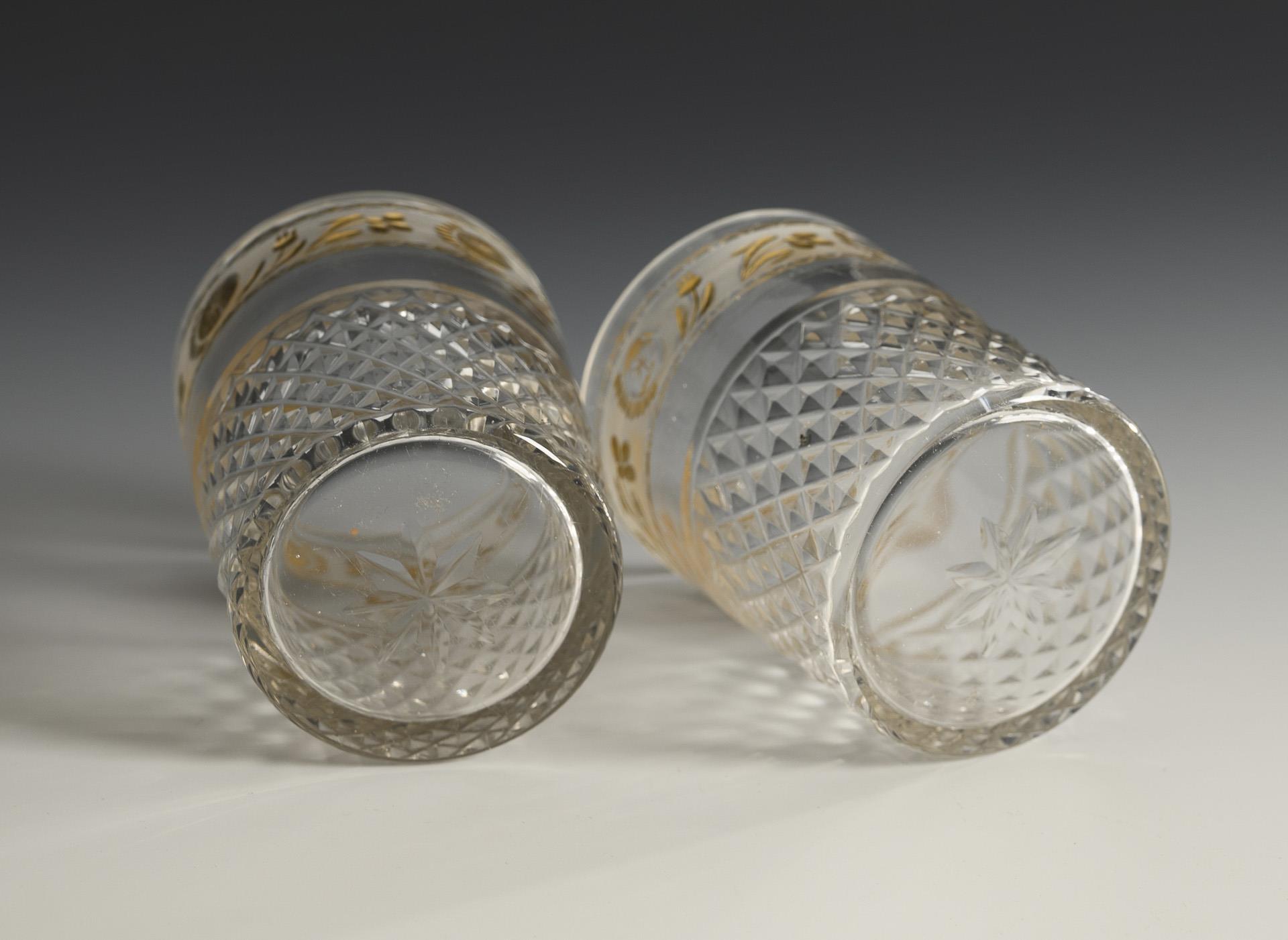 Farbloses Glas, 2x goldstaffiert. Dose (H 18,5 cm), 2 Becher (H 19 cm). Ca. 1 kg.