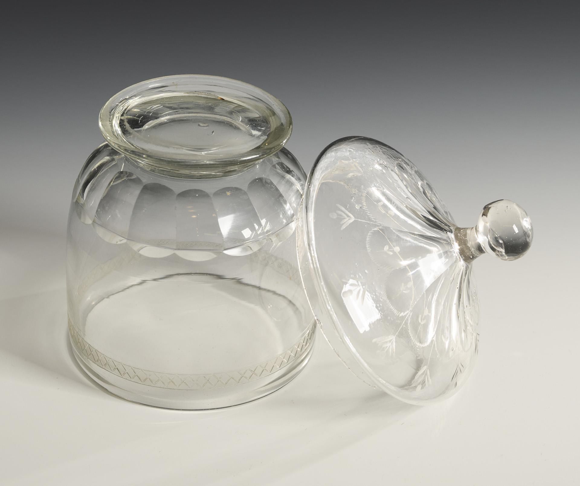 1x bauchige Dose mit facettiertem Ansatz und Rundfuß sowie Knaufdeckel. / 2x Zylinderbecher mit gesteineltem Ansatz sowie einer floral gravierten und teils goldstaffierten Bordüre. Deckelinnenrand der Dose bestoßen.