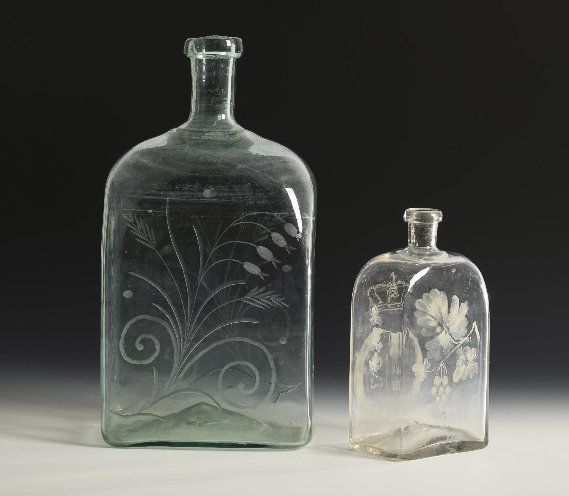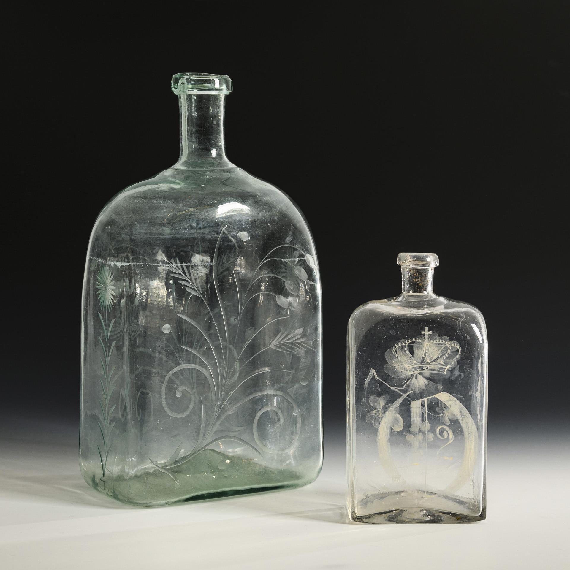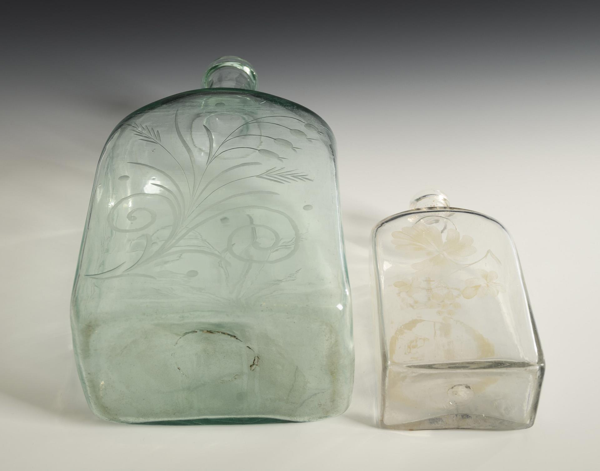 1x Vierkantflasche aus farblosem Glas mit Resten einer Emailmalerei (H 24 cm). / 1x Vierkantflasche aus hellgrünem Glas mit hoch gestochenem Boden und allseitiger, stilisierter Floralgravur (H 40,5 cm).