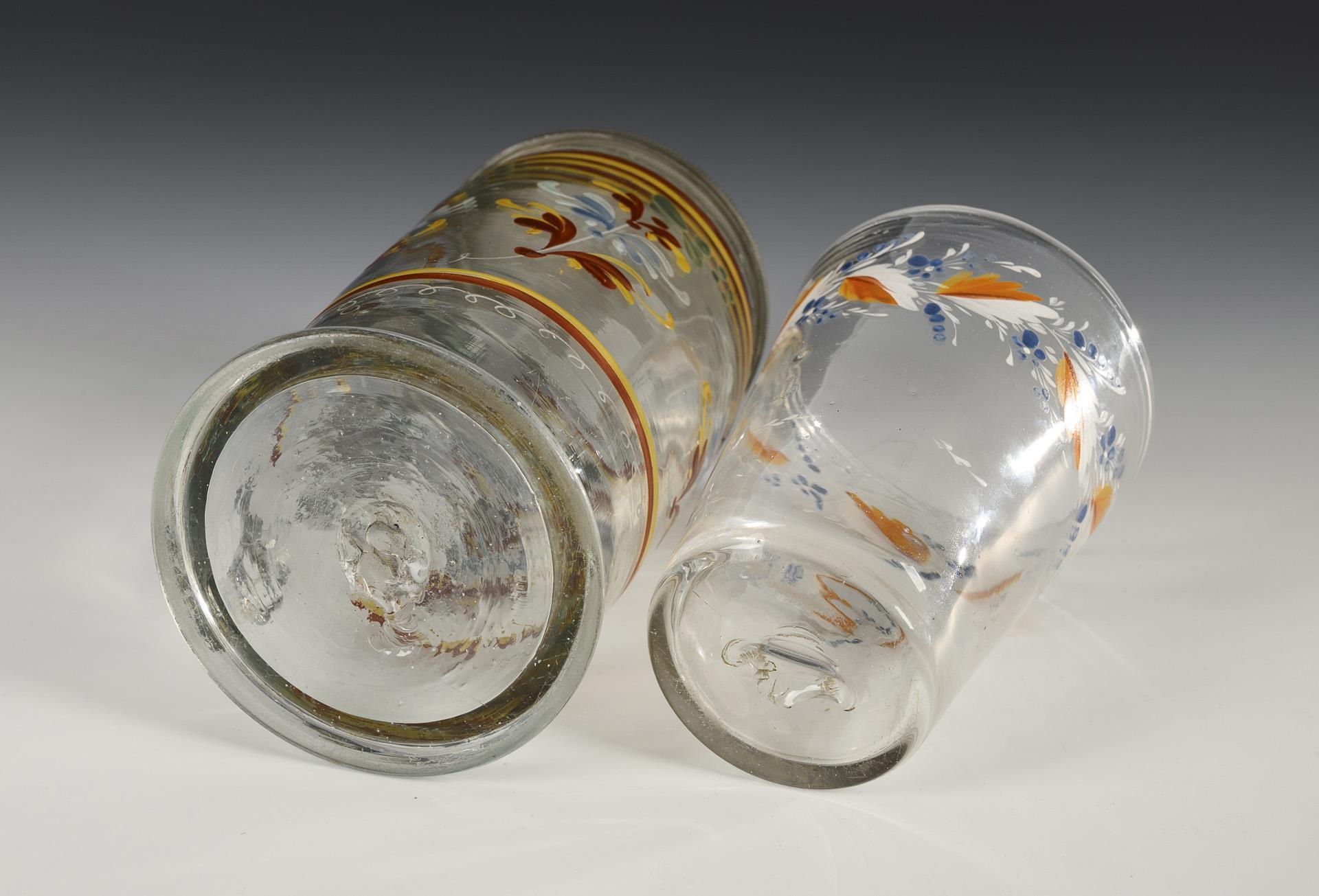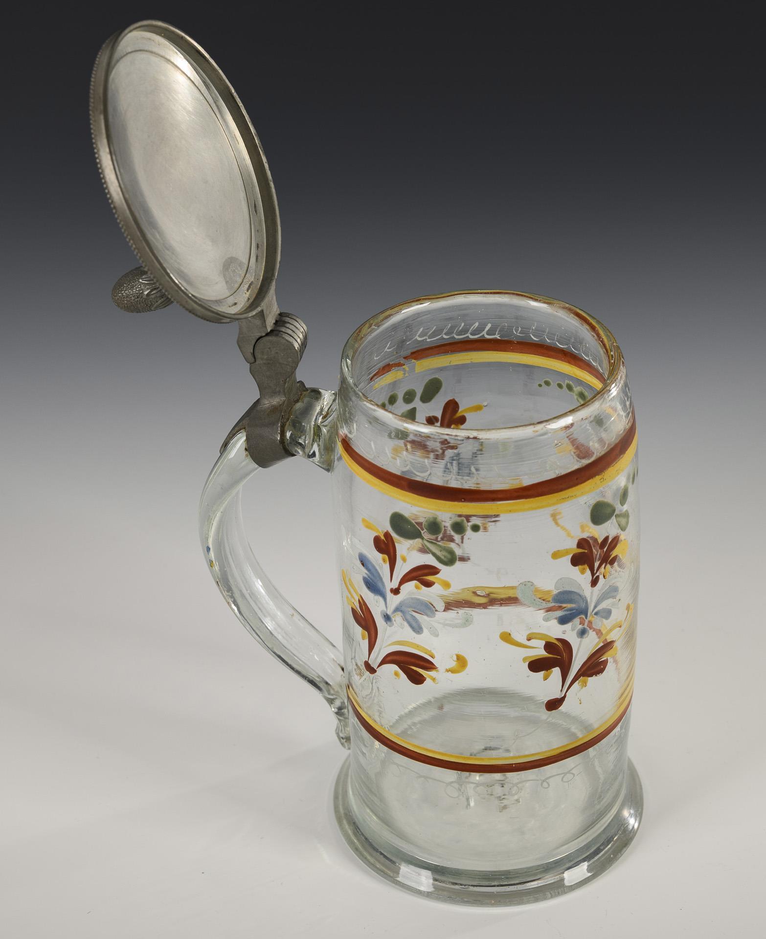 Farbloses, teils schlieriges Glas, polychrome Emailmalerei. Bierkrug (H 21,5 cm), Becher (H 13,5 cm). 970 g.