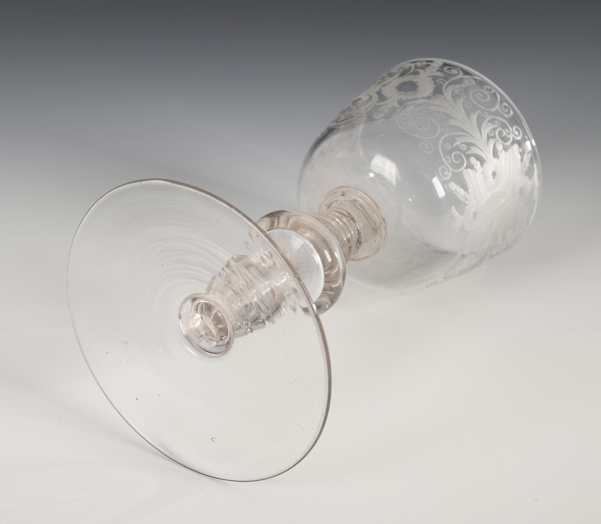 Bauchige Kuppa, mehrfach gegliederter Schaft mit eingestochener Luftblase im Baluster, Scheibenfuß; Abriss. Auf der Kuppa geschnittene Blumenbuketts und florales Rankenwerk.