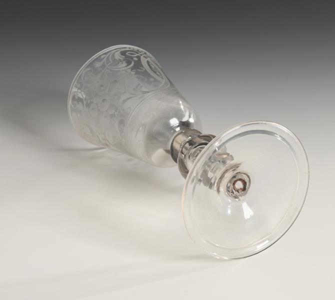Glockenkuppa, dreifach gegliederter Balusterhohlschaft, Rundfuß mit nach unten umgeschlagenem Rand; Abriss. Auf der Kuppa fein graviertes florales Rankenwerk mit geblänkten Kugeln.