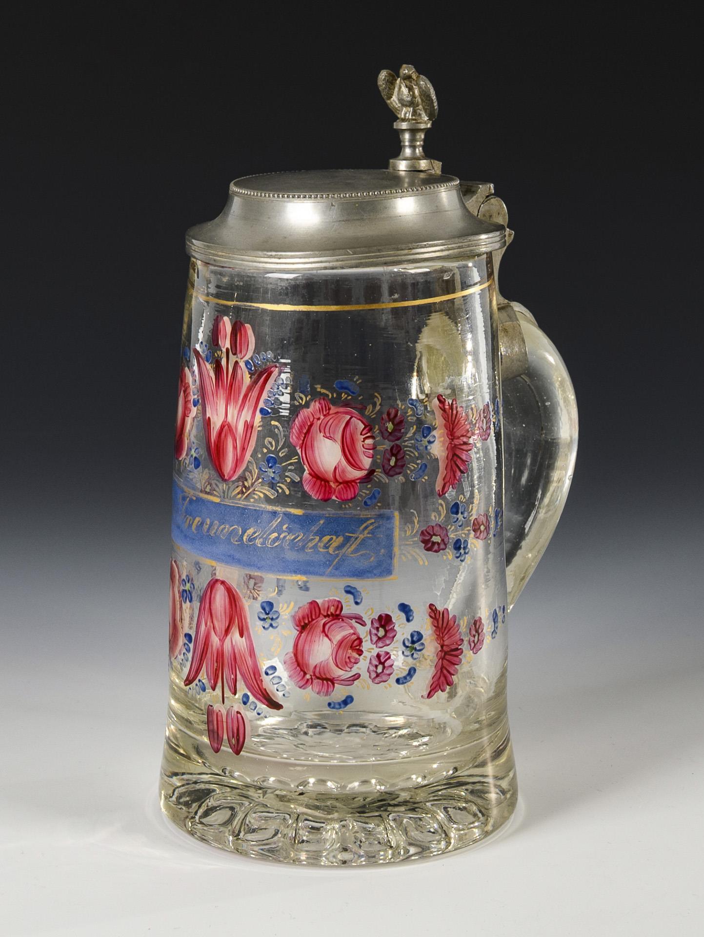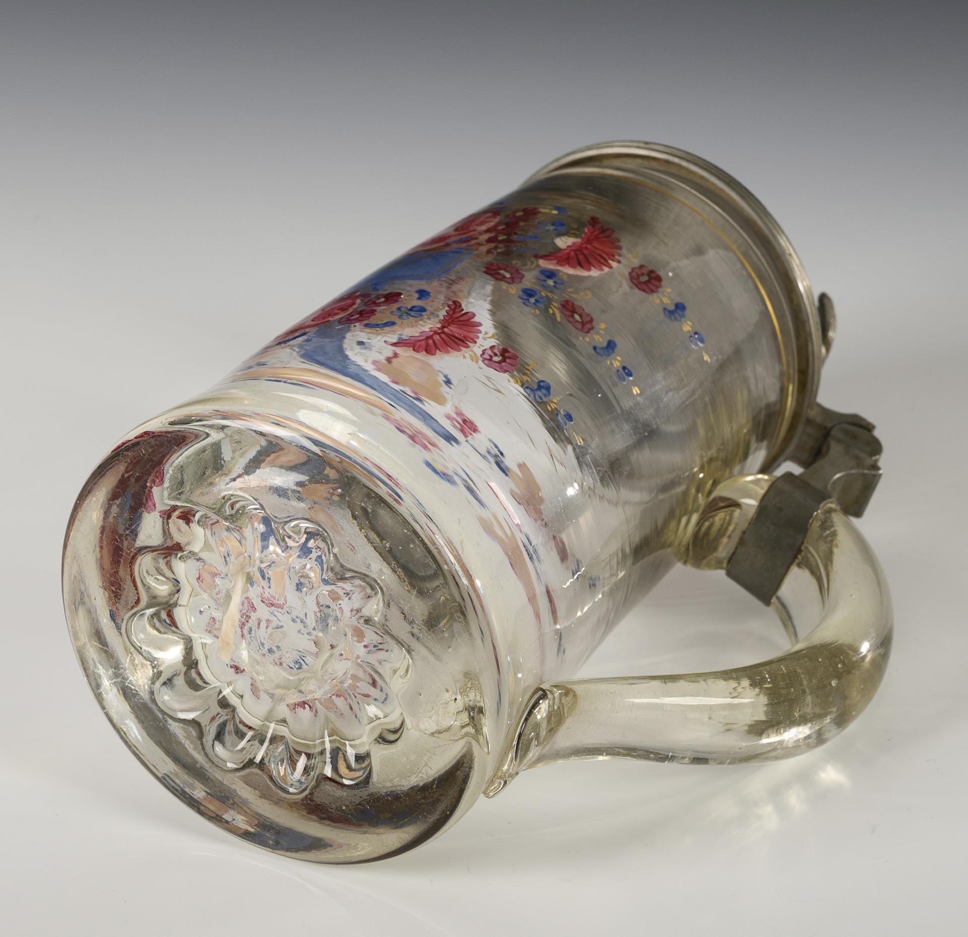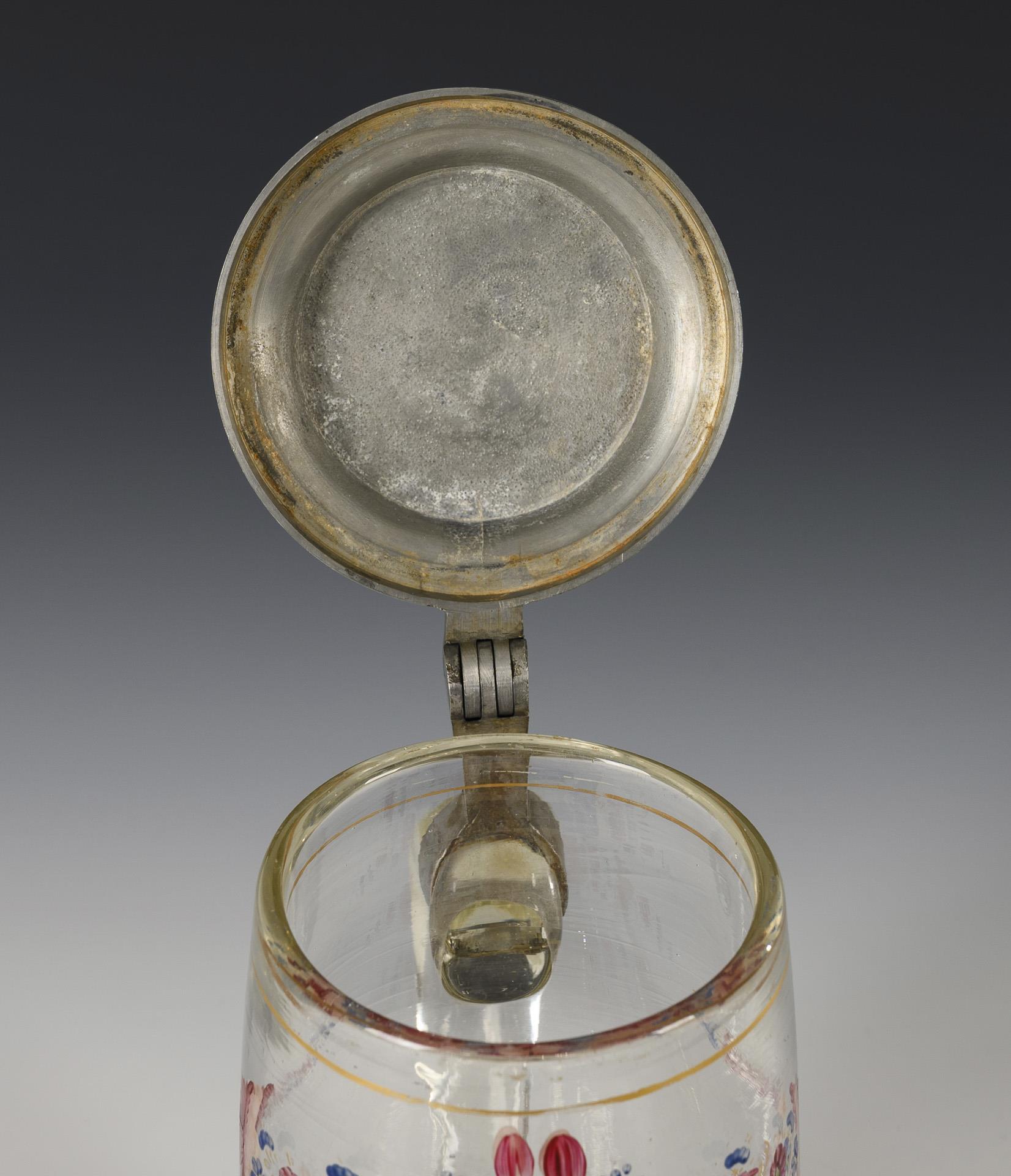 Farbloses Glas, polychrome Emailmalerei, Goldstaffage, Zinn. H 22,5 cm. Ca. 1,3 kg.