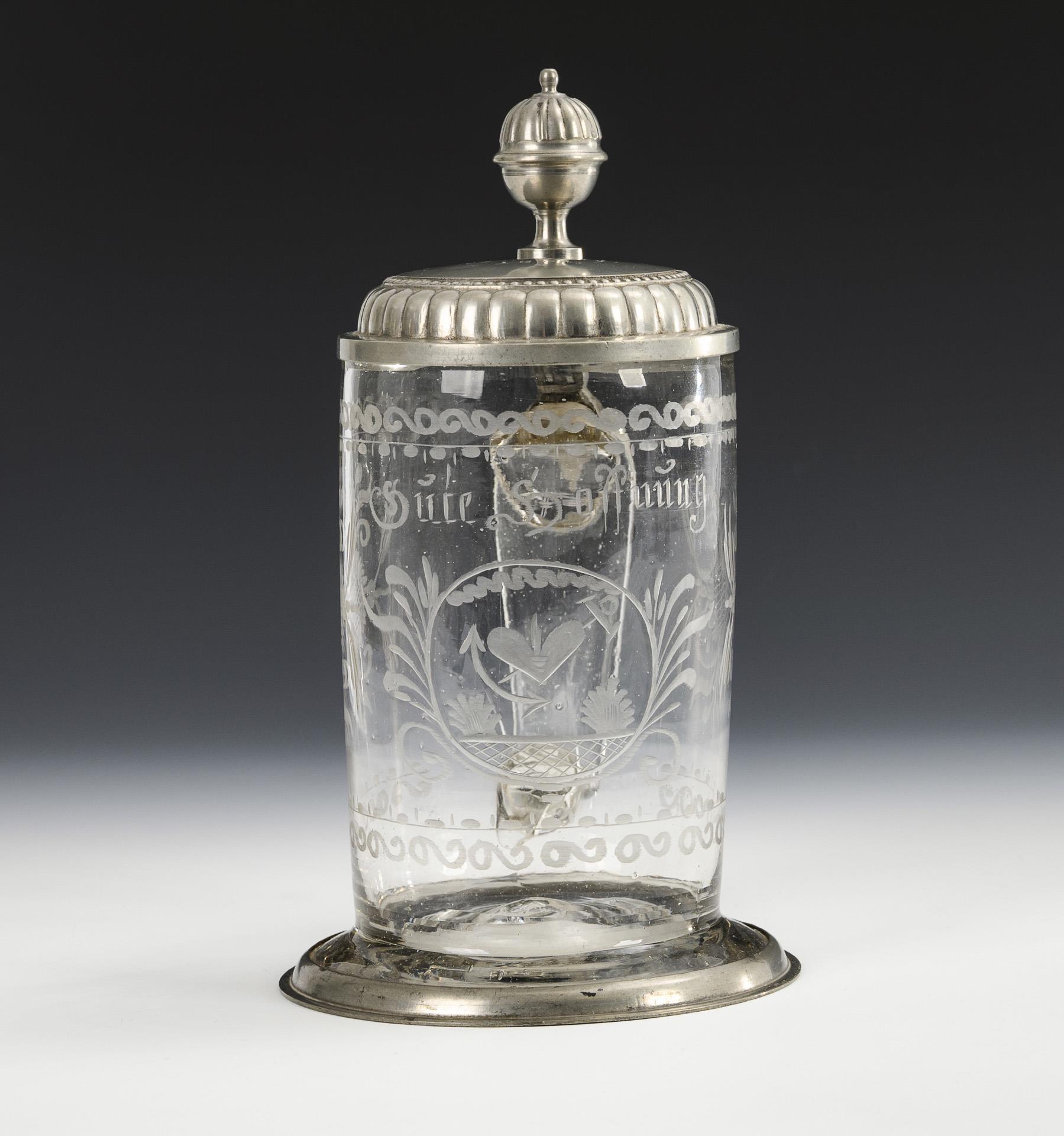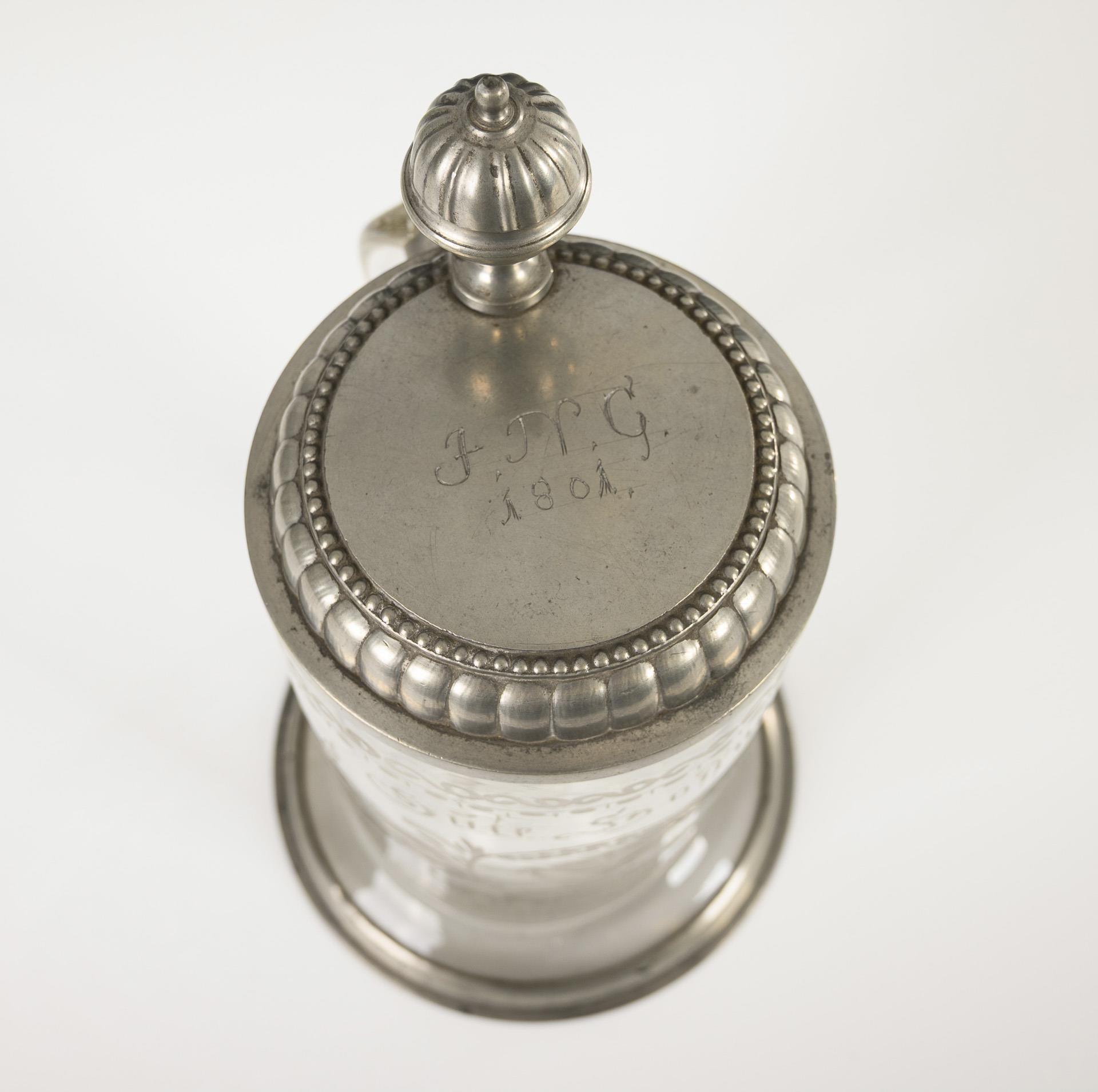 Walzenkrug mit ausgestelltem, zinnmontiertem Stand, Bandhenkel und zinnmontiertem Scharnierdeckel mit der Gravur "J. N. G. 1801.". Graviert mit Symbolen (Anker, Herz) und der Bezeichnung "Gute Hoffnung". 2 Spannungsrisse am unteren Henkelansatz.