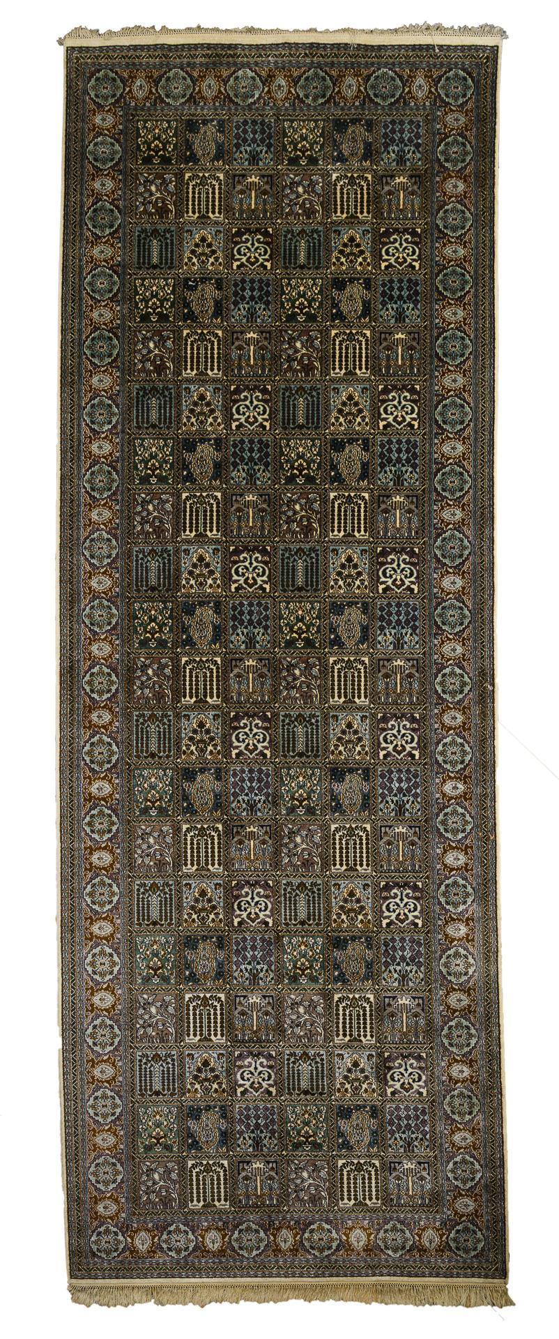 Seide und Baumwolle, feine Handknüpfung. Polychromdekor. Ca. 363 x 124 cm.