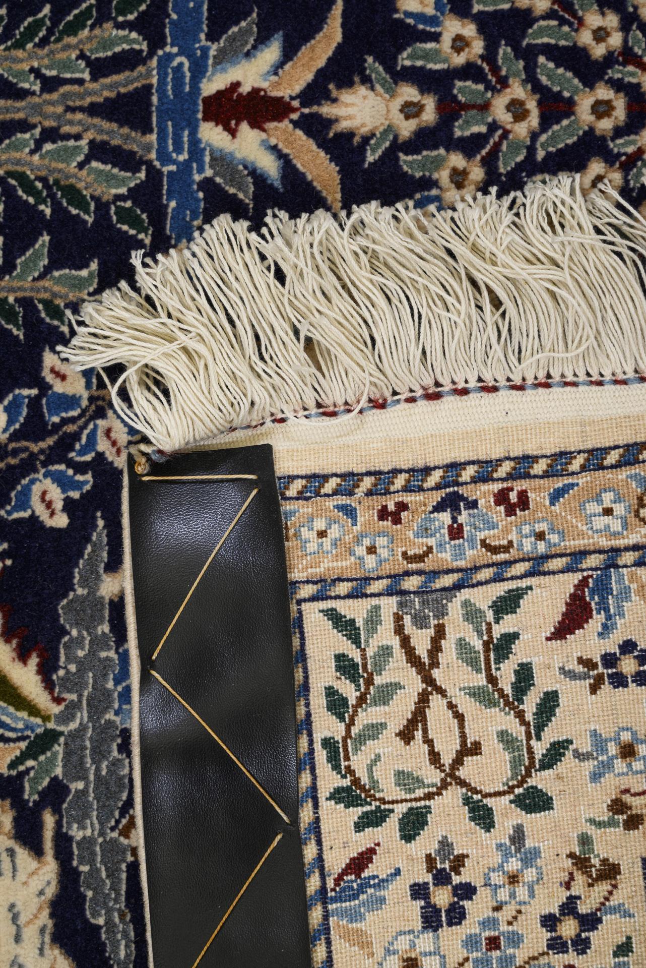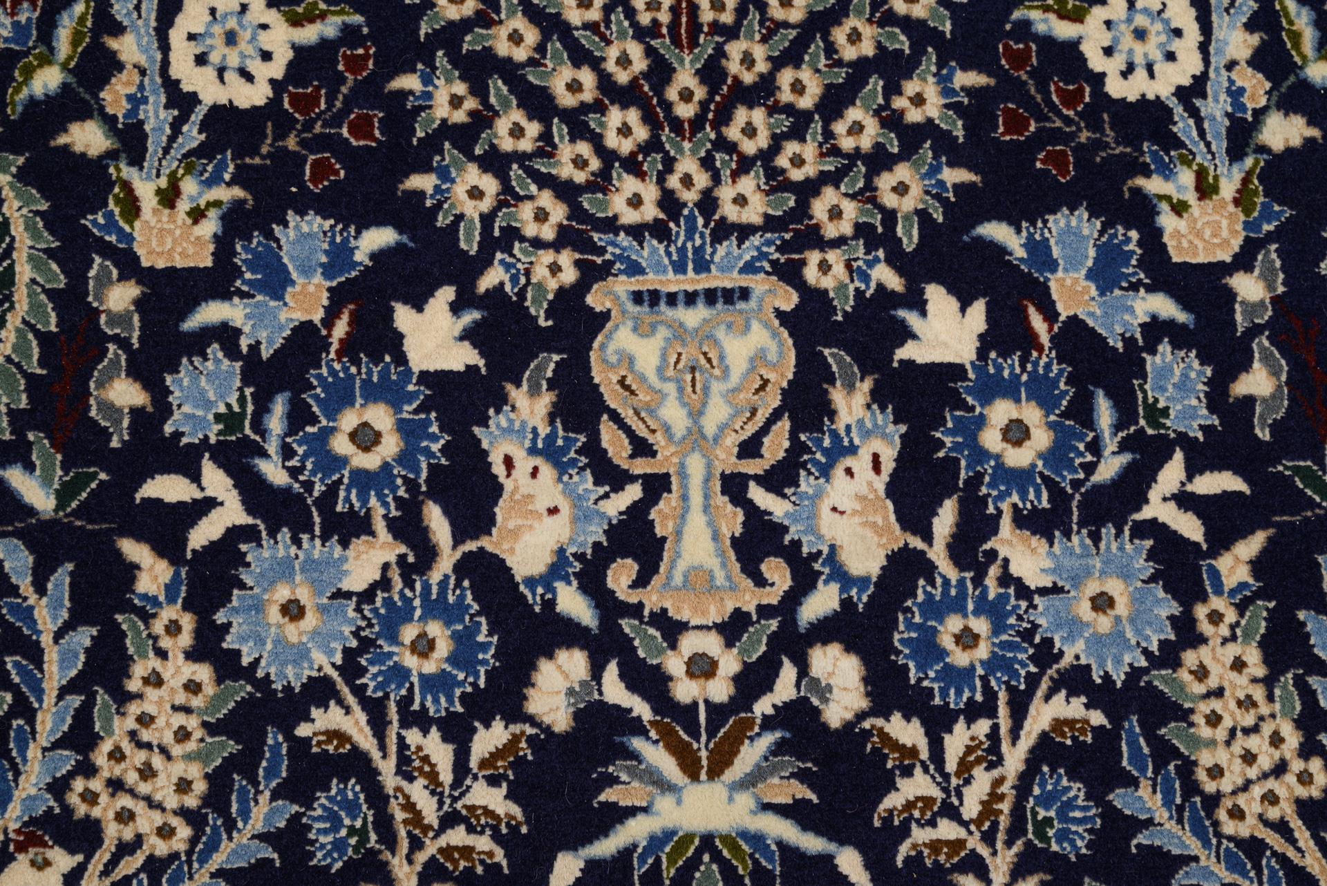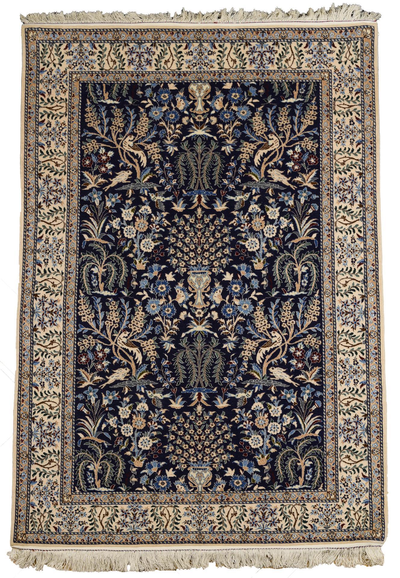 Wolle und Seide, äußerst feine Handknüpfung. Polychromdekor mit überwiegend Elfenbein- und Blautönen. Ca. 148 x 99 cm.