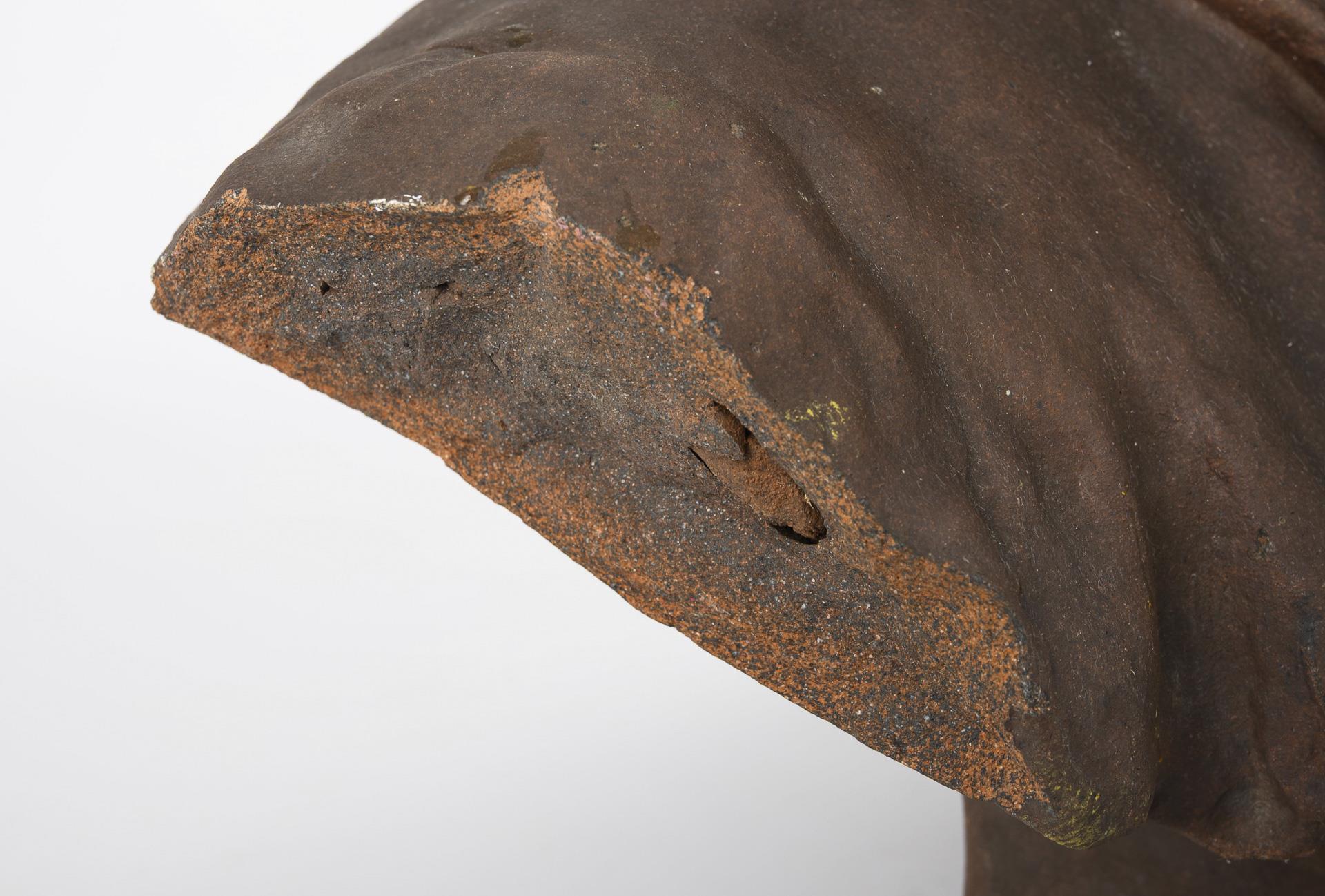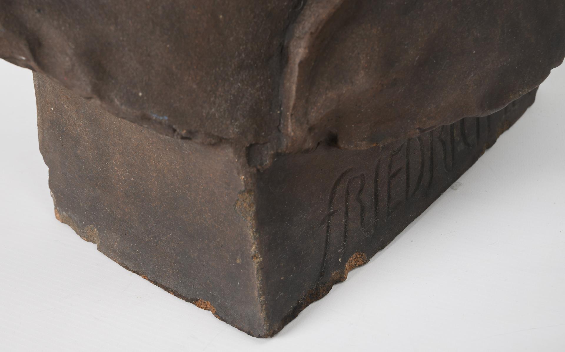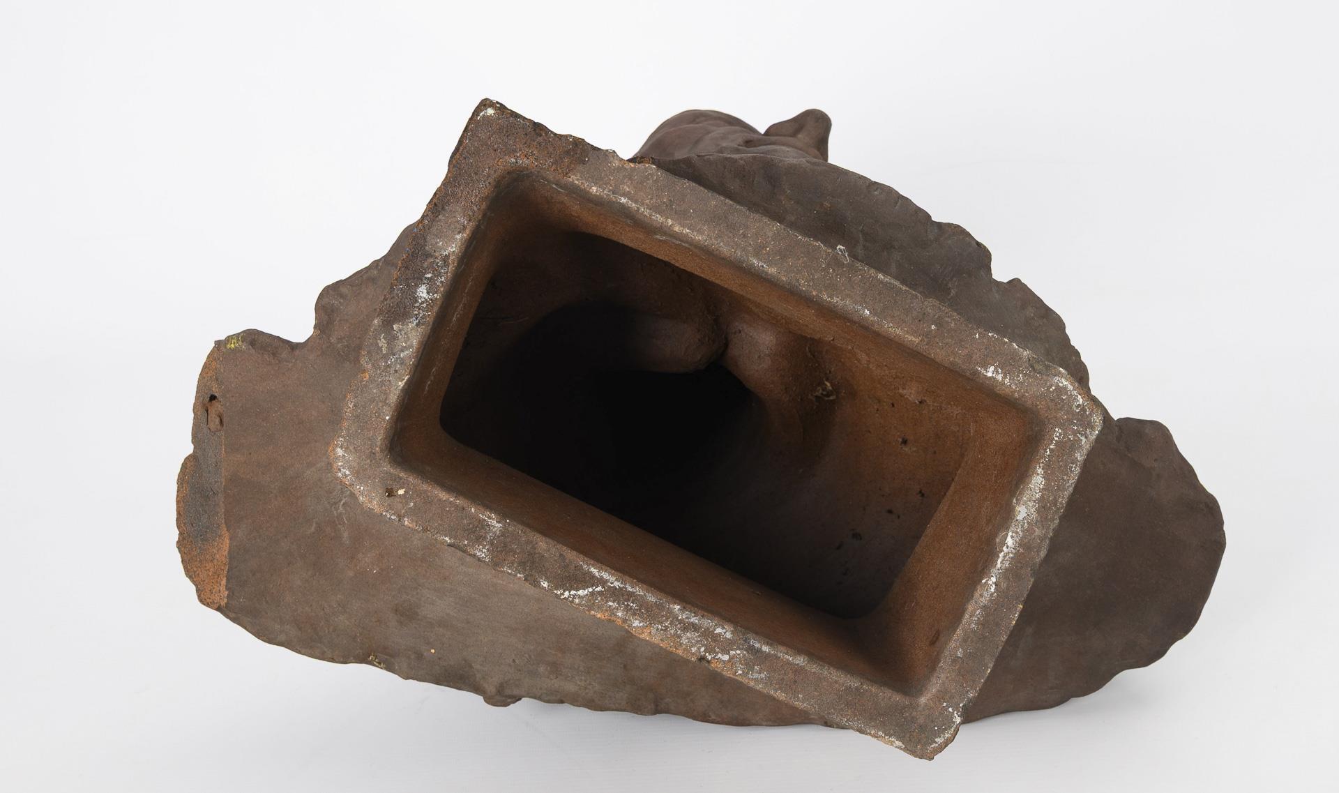 Hoch gebrannter, schamottierter dunkelbrauner Ton, bronzefarben gefasst. Auf dem Sockel betitelt. 50 x 50 x 33 cm. 17,9 kg.