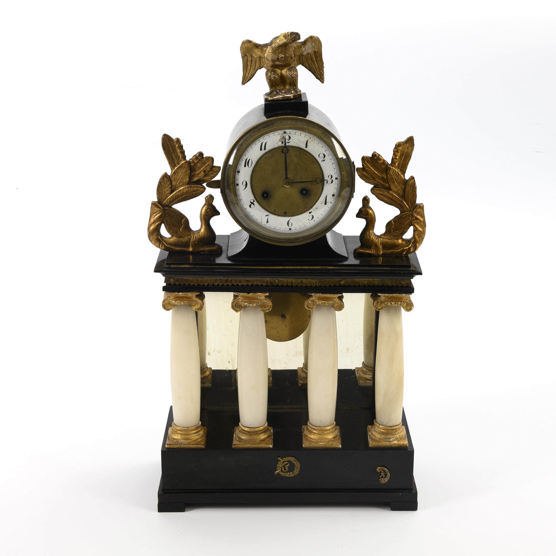 Portaluhr mit Säulenportikus und verspiegelter Rückwand, bekrönender Uhrentrommel mit aufgesetztem Adler und flankierenden Pfauen. Alters- und Gebrauchsspuren, Defekte, Fehlstellen, Ergänzungen, Lötspuren.