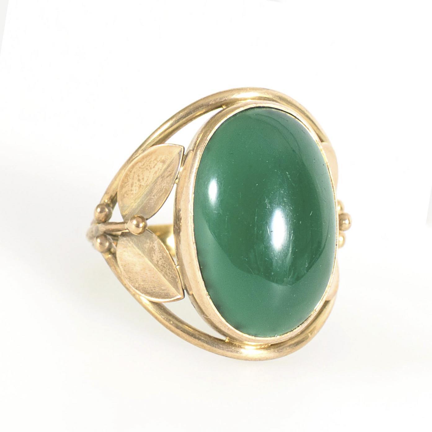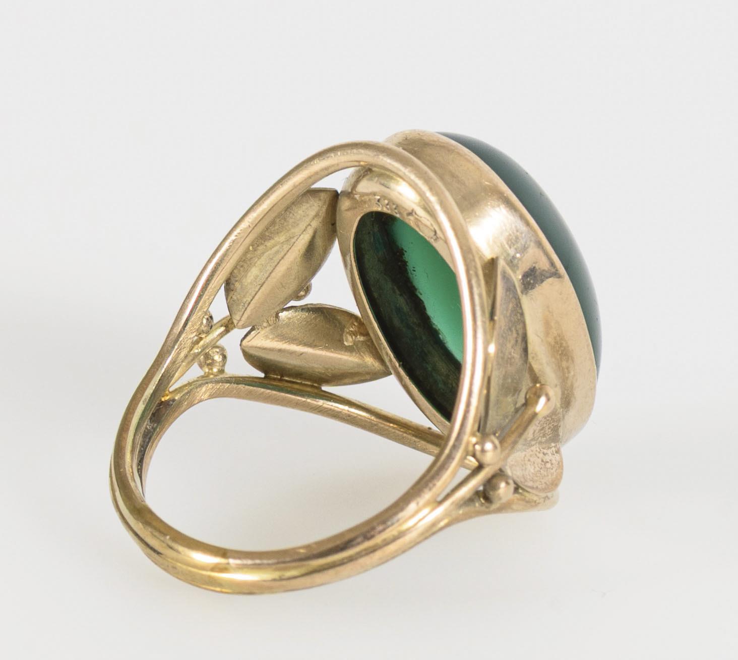 Ring mit großem, grünen Cabochon zwischen sehr breiten, mit stilisiertem Blattwerk ausgestalteten Ringschultern.