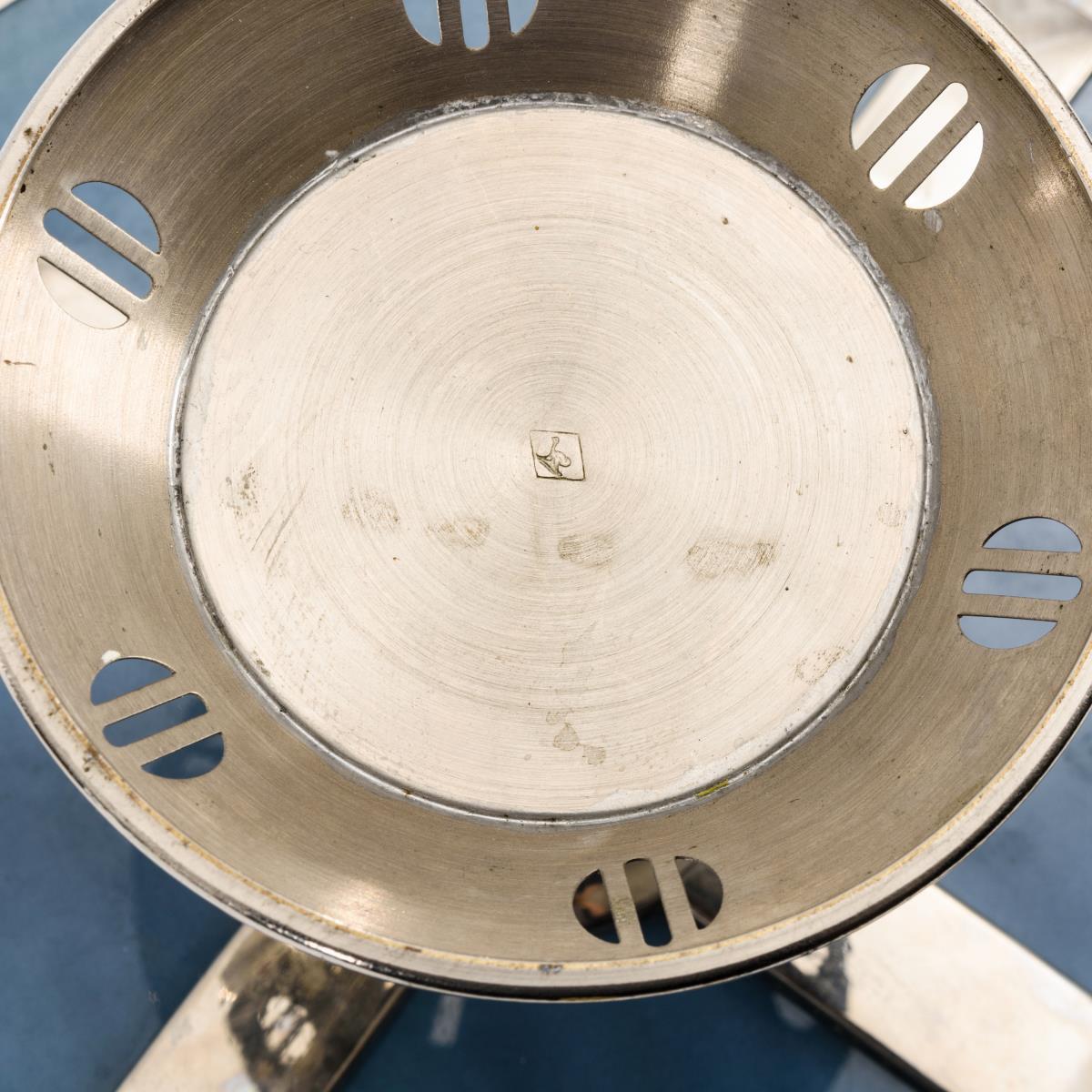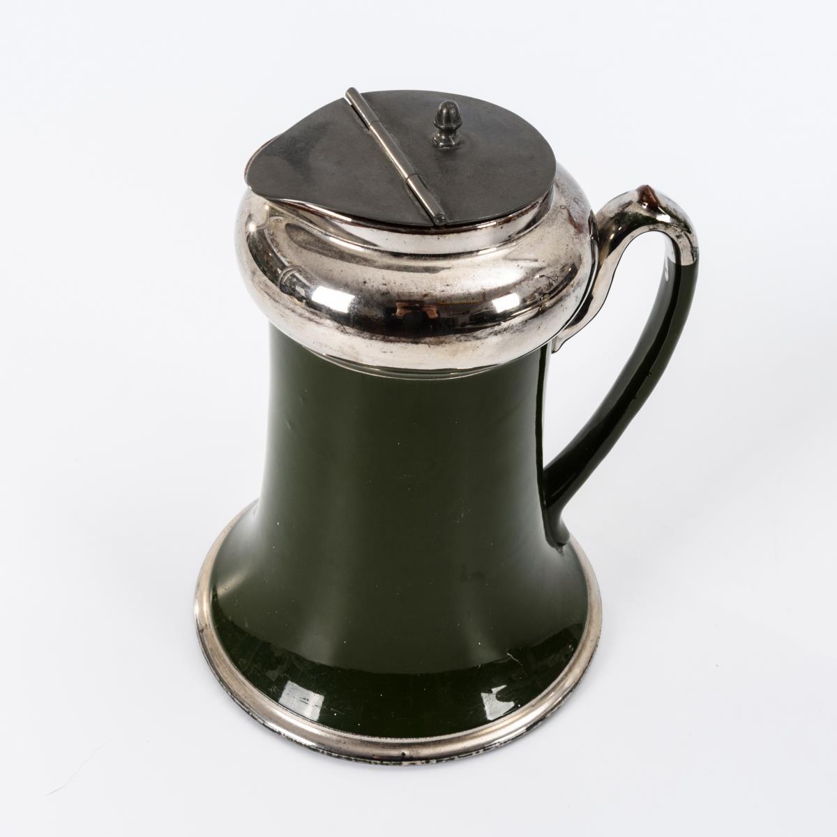 Ornamental reliefierte Tortenplatte mit Metallrand und hohem Rundfuß (H 16 cm, Ø 34,5 cm), grün-silbernes Kännchen mit gewulstetem Hals und abnehmbarem Deckel (H 20,5 cm). Leicht berieben.