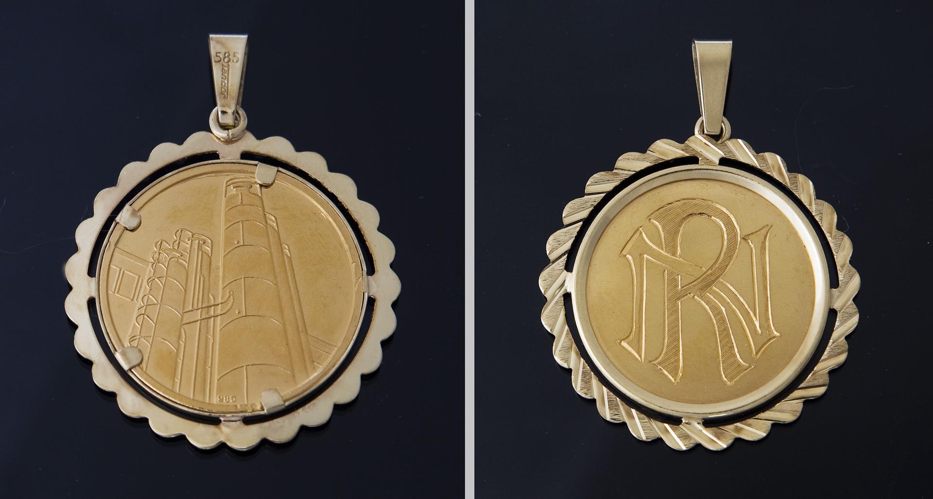 Gedenkmedaille, rückseitig graviertes Monogramm. Fassung mit beweglicher Öse. Punzen: Medaille und Fassung mit Feingehalt, Fassung mit Juweliermarke Tendor (Pforzheim).